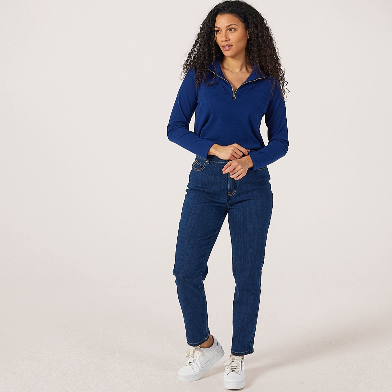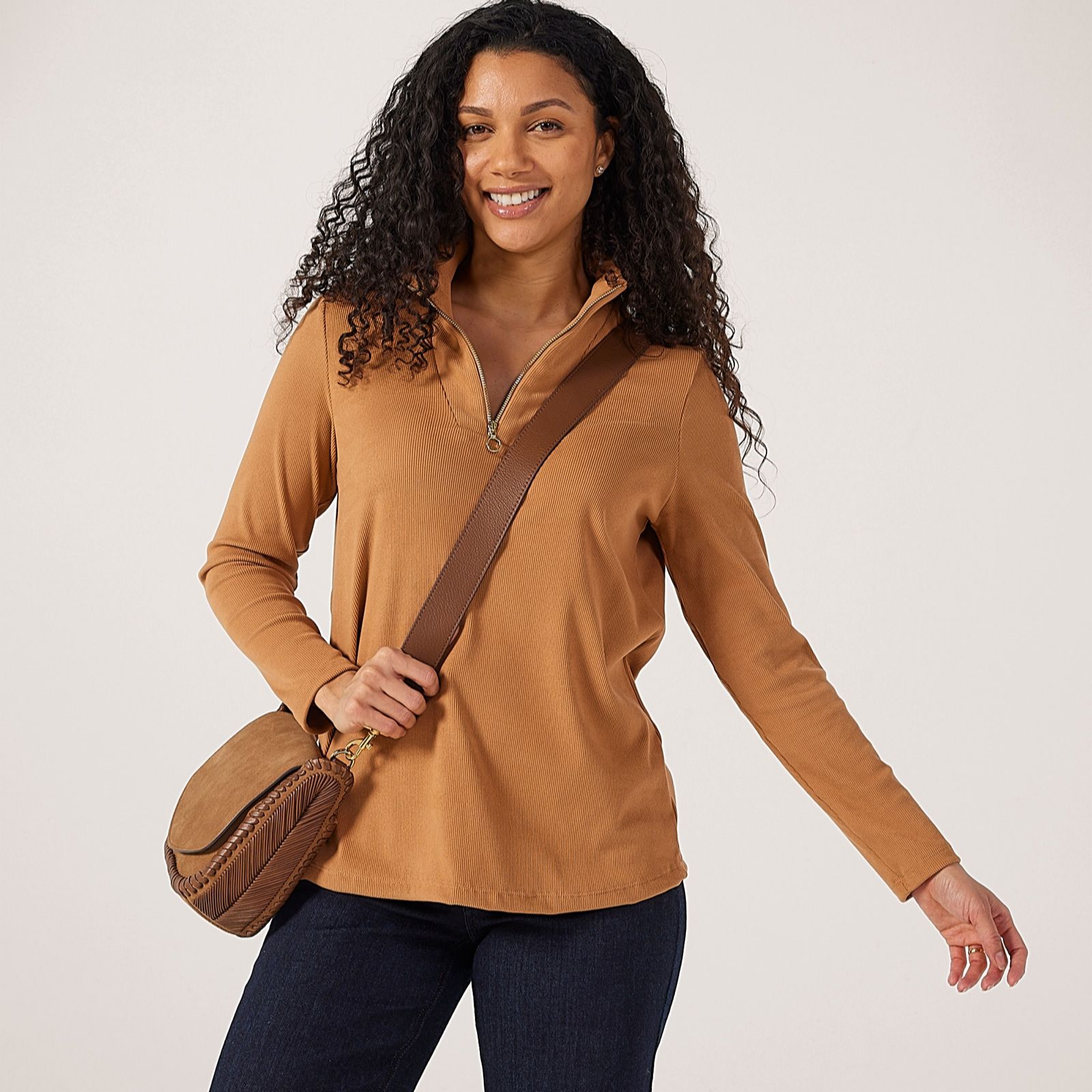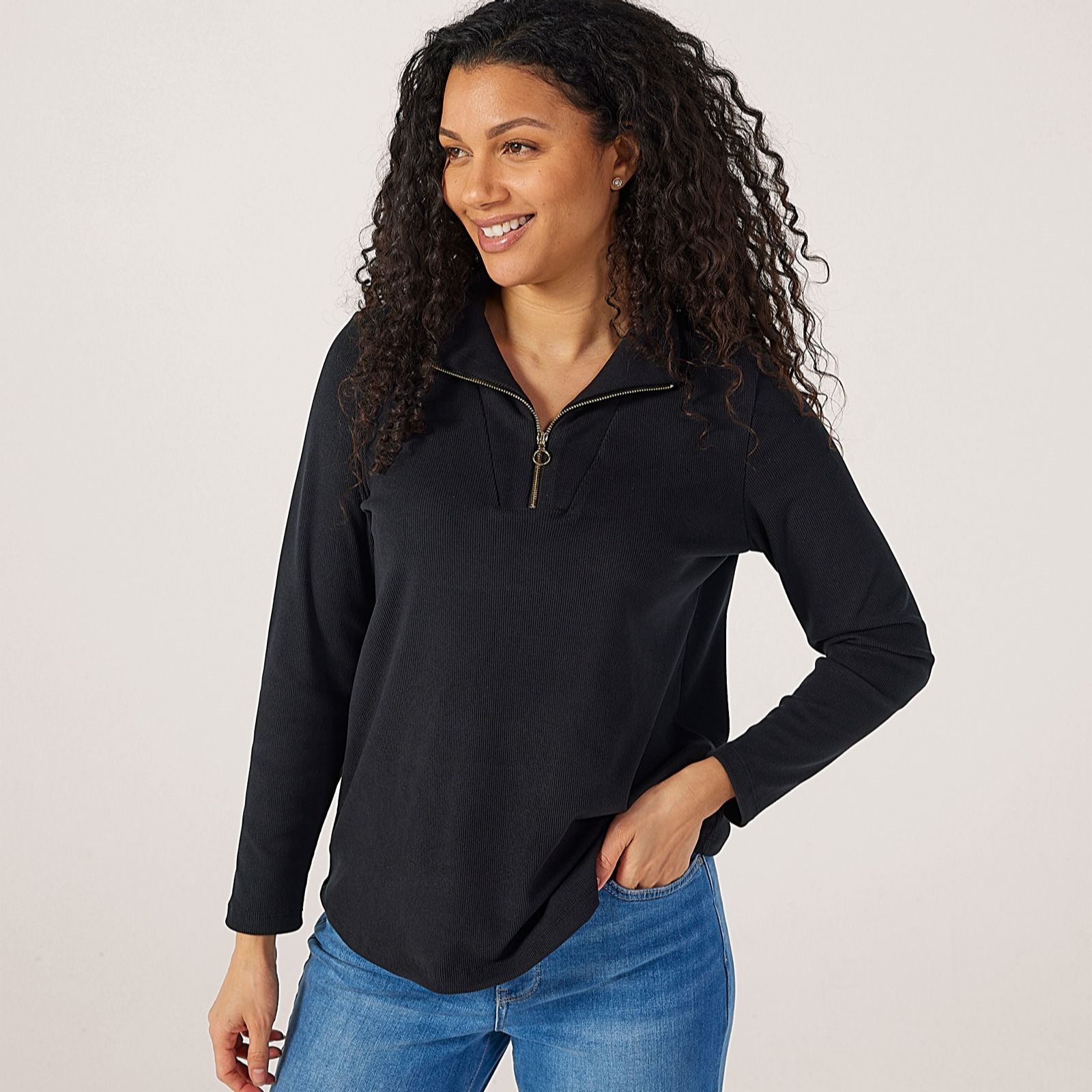 Wrap yourself in effortless comfort with the Soft Touch Zip Detail Top from Kim & Co, designed in a plush rib knit with a high collar and sleek metal zipper for a contemporary edge. Perfect for layering on chilly days or adding a touch of sophistication to your everyday style, this versatile top seamlessly transitions from casual outings to smart-casual occasions. Pair it with tailored trousers or your favourite jeans for a polished yet relaxed look.