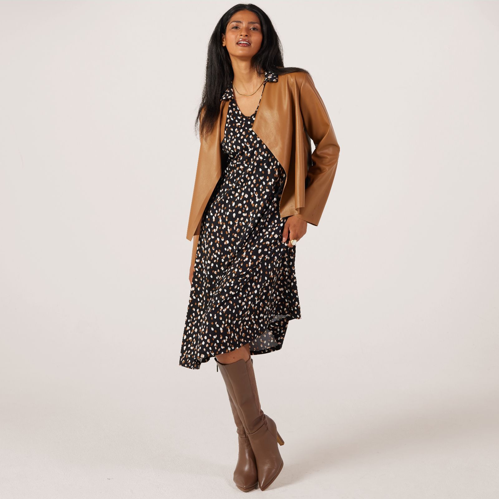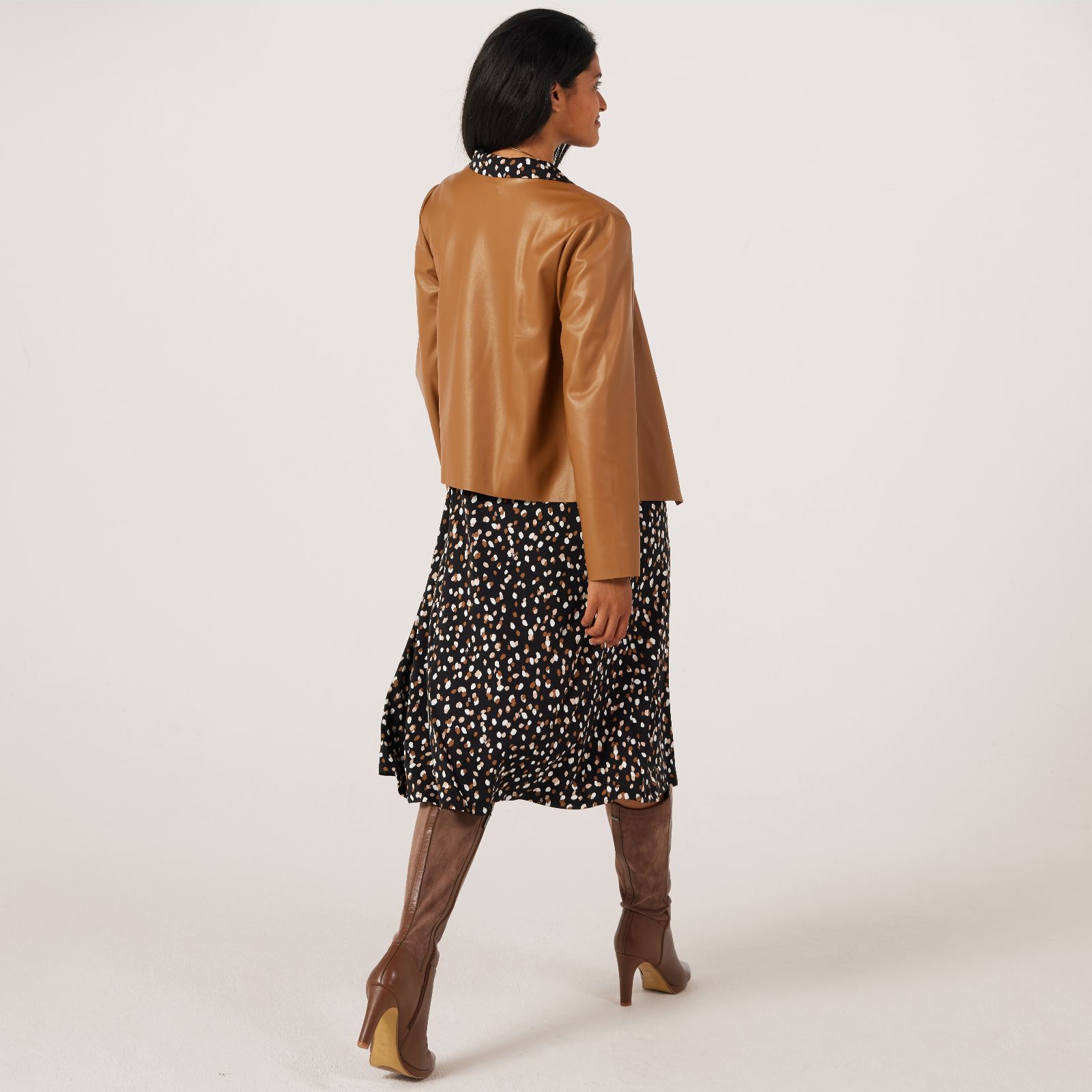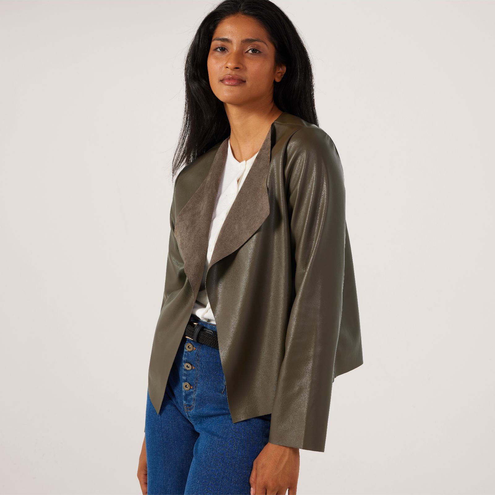 Bringing a touch of contemporary flair to your wardrobe, this soft vegan leather edge to edge jacket from Kim & Co is designed with a relaxed fit and stylish lapel at the front neckline. Perfect for elevating both casual and dressier looks, it layers effortlessly over everything from jeans and a tee to a sleek dress. Try styling it open for a laid-back vibe or drape over your shoulders for a chic finish.