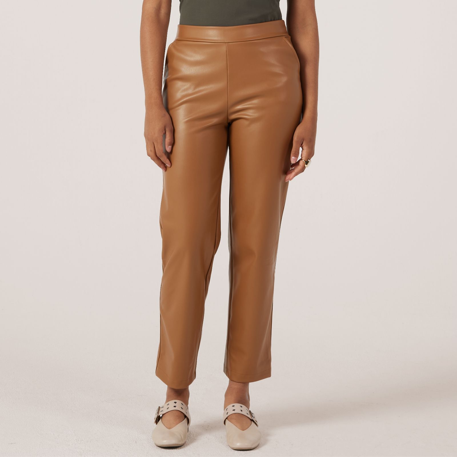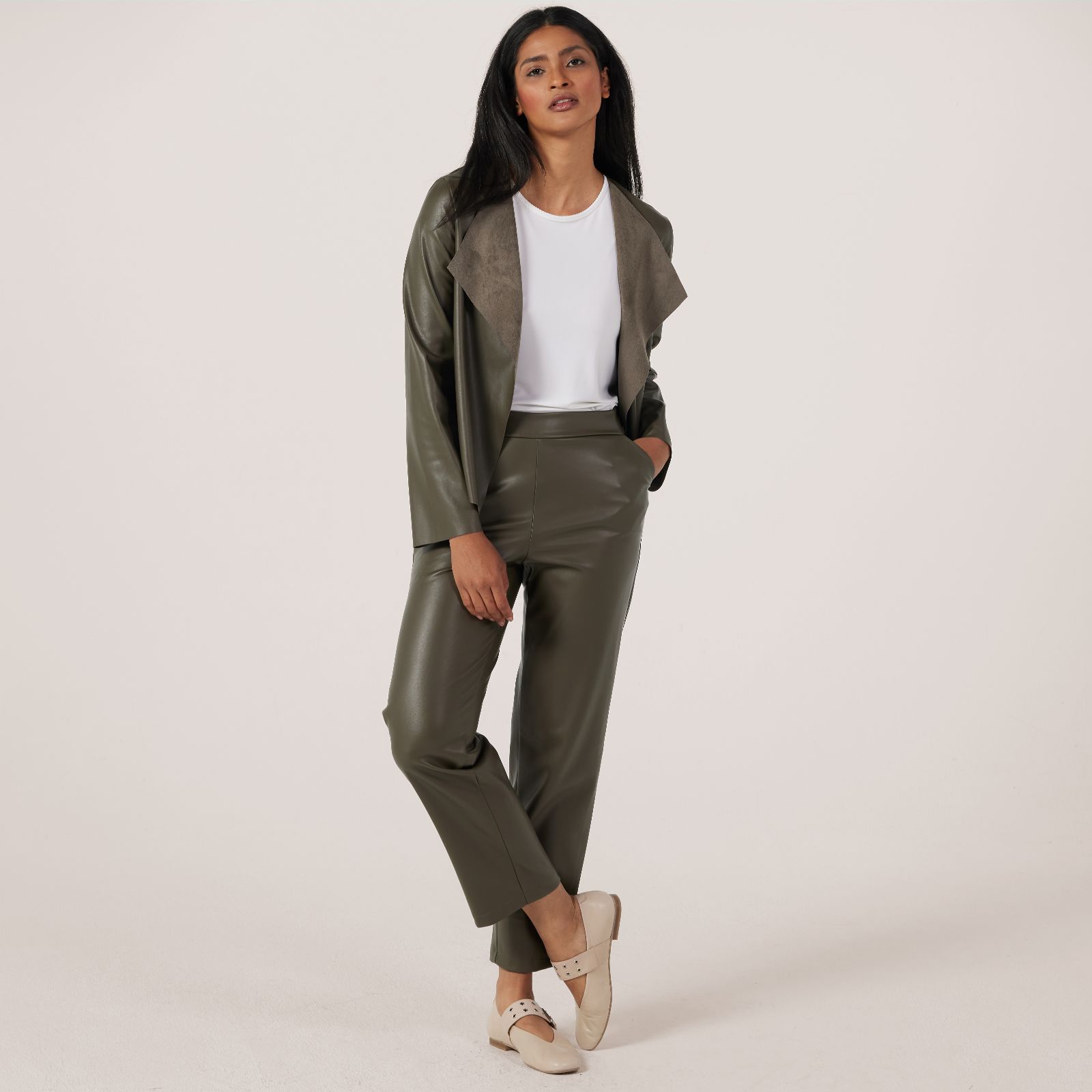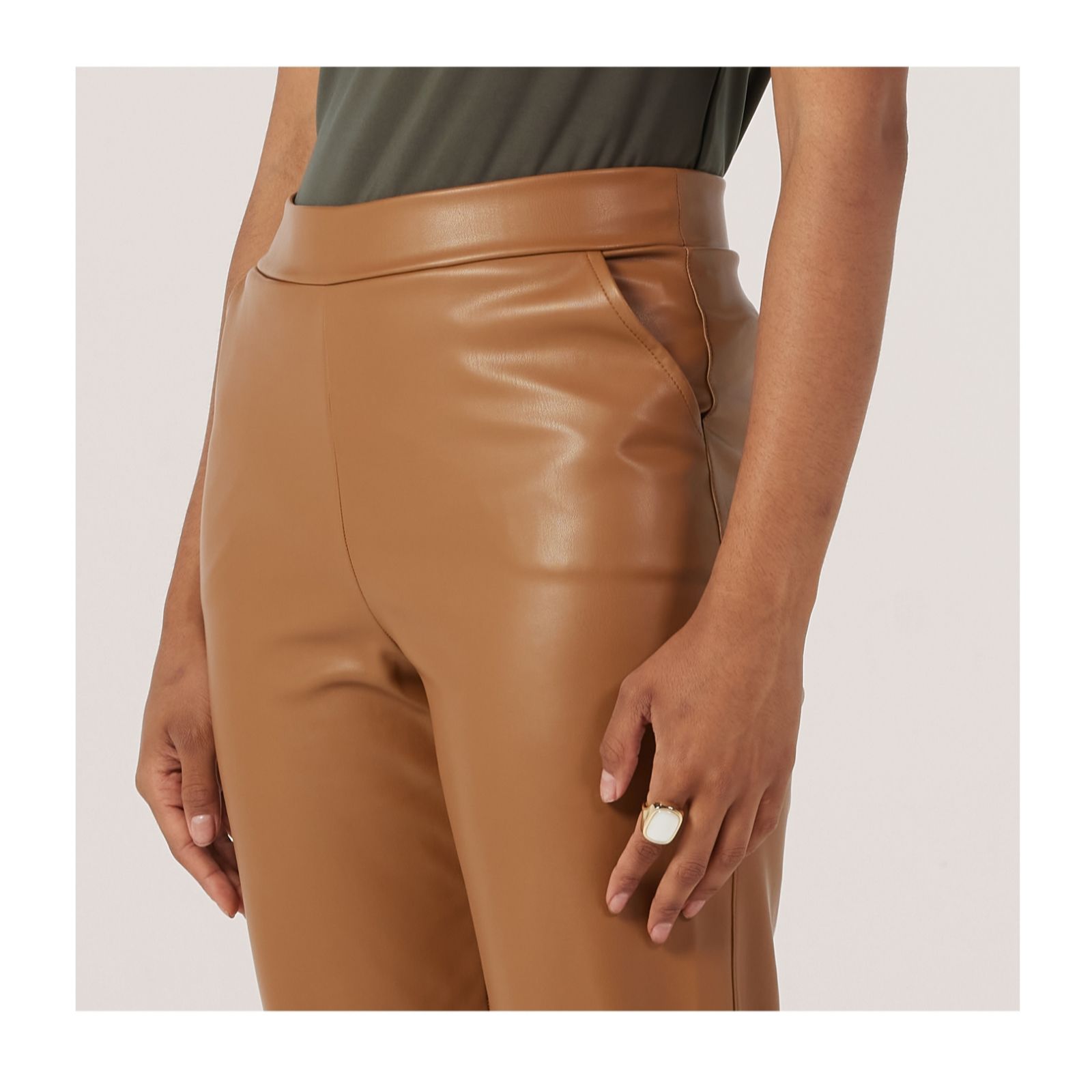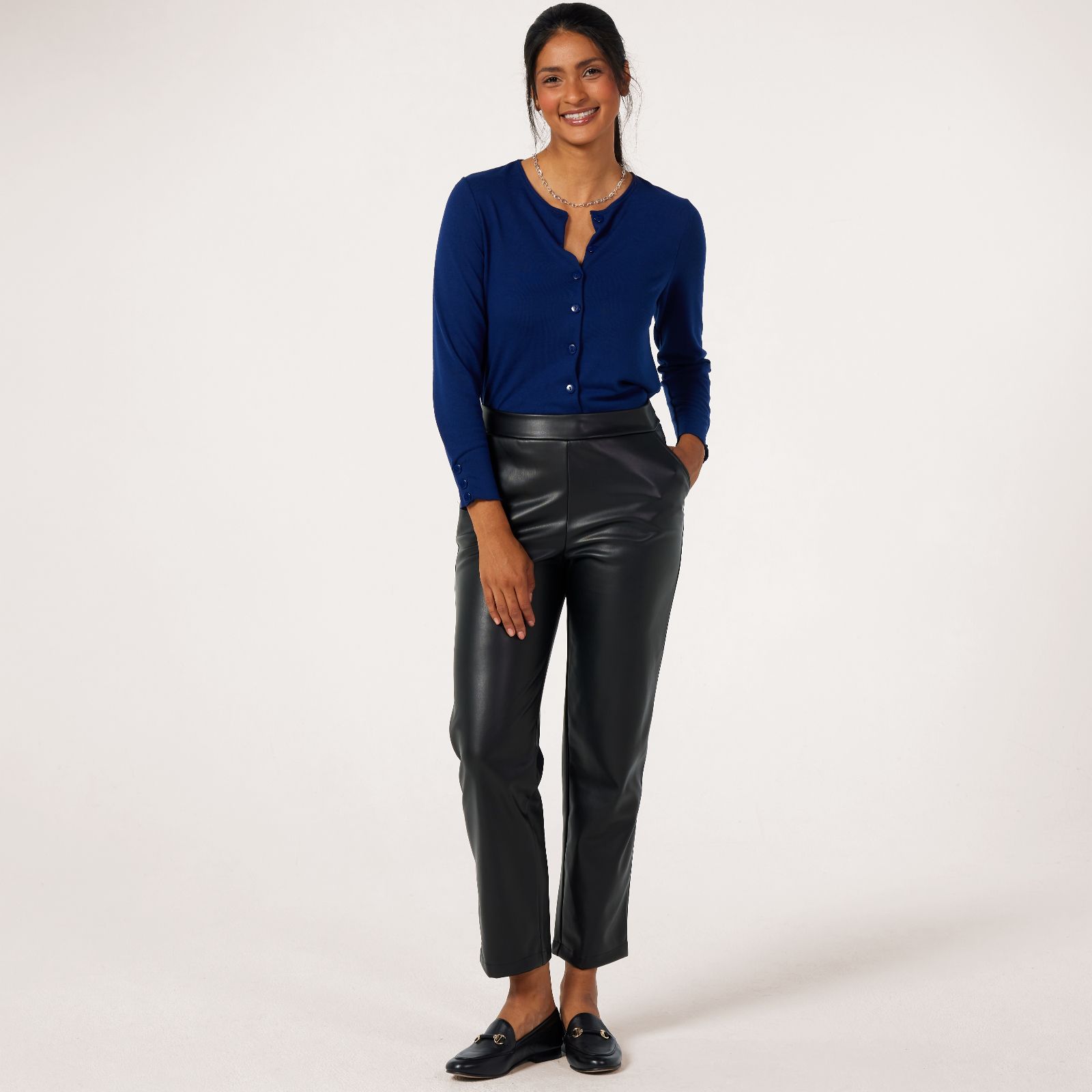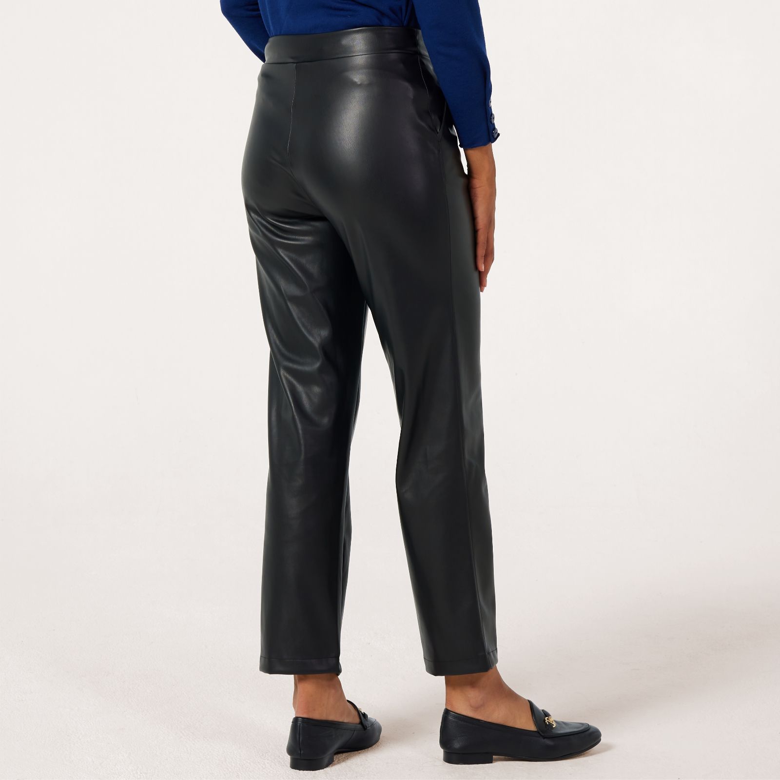Step into sleek sophistication with these Soft Vegan Pleather narrow leg trousers from Kim & Co. These trousers boast a comfortable waistband and front slanted pockets, making them ideal for adding a touch of edgy style to your everyday wardrobe, whether you're heading to brunch or dressing up for an evening out. For a polished look, try pairing them with a crisp blouse and ankle boots.