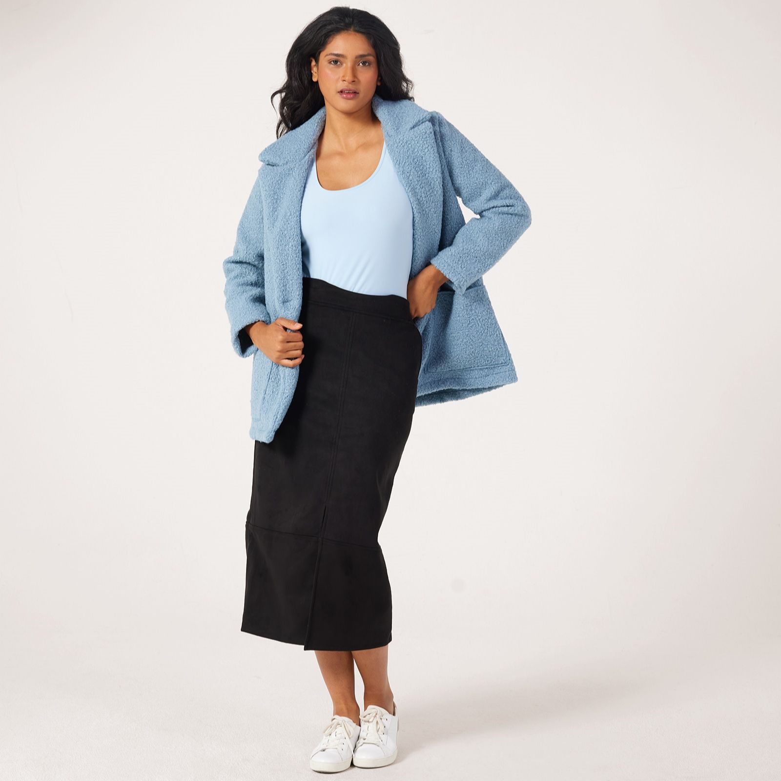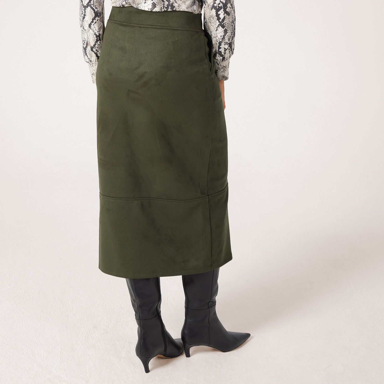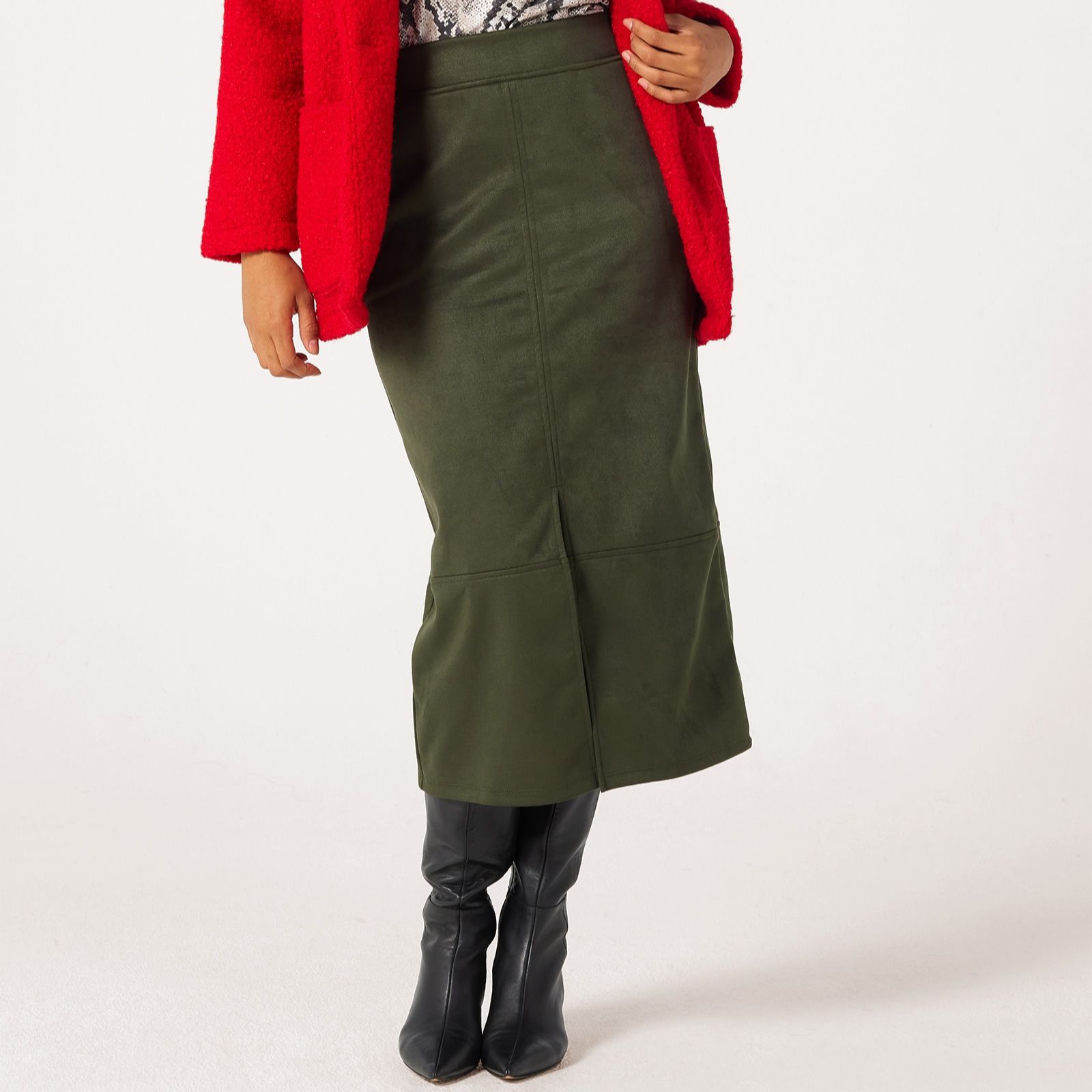 Perfect your wardrobe with the stretch faux-suede maxi skirt from Kim & Co, designed with a chic front slit, comfort waistband and handy slanted pockets for a modern twist on a classic silhouette. Effortlessly stylish, this skirt transitions seamlessly from office meetings to weekend get-togethers, making it an endlessly wearable staple. Pair it with a ruffle-sleeved blouse and suede ankle boots for a polished, on-trend look.