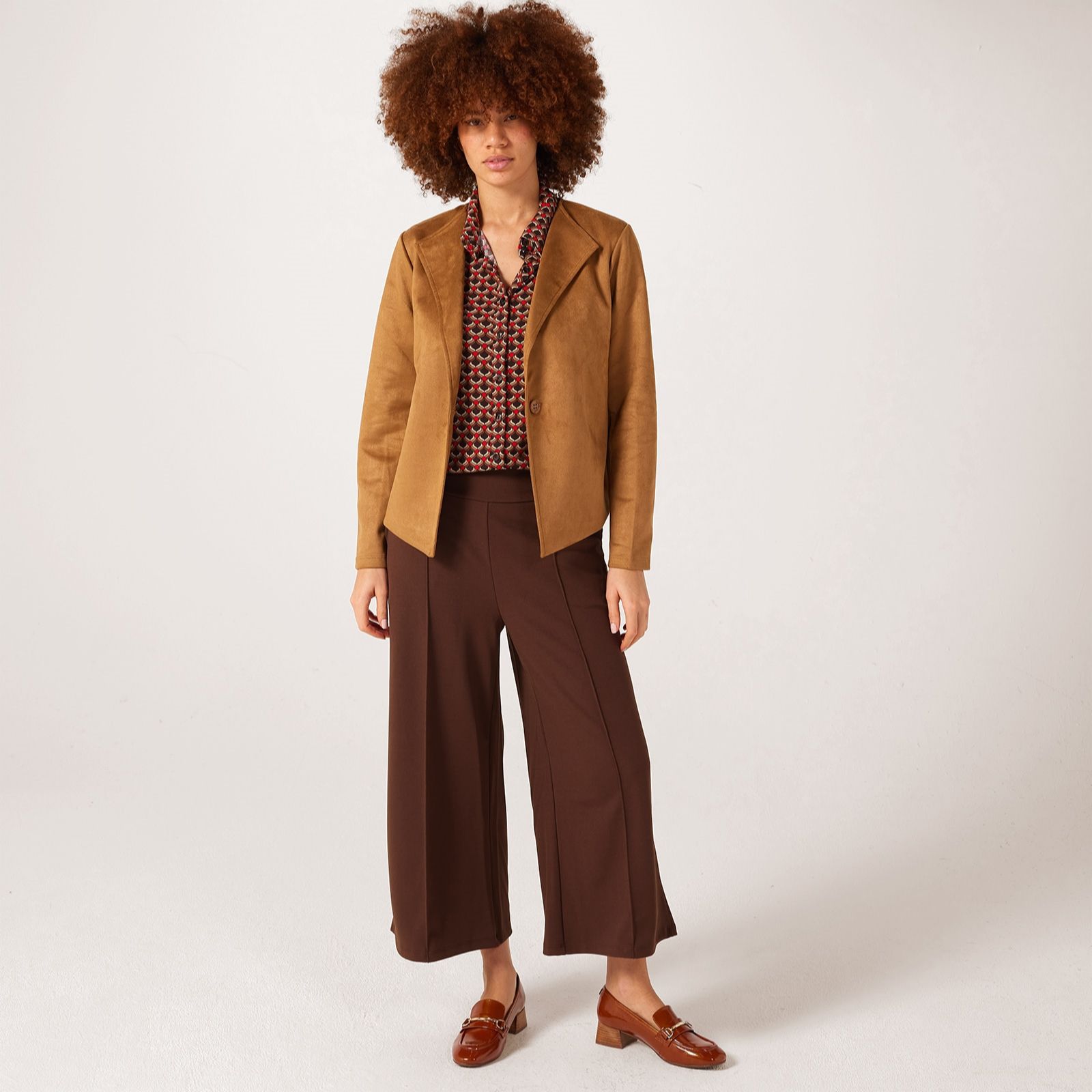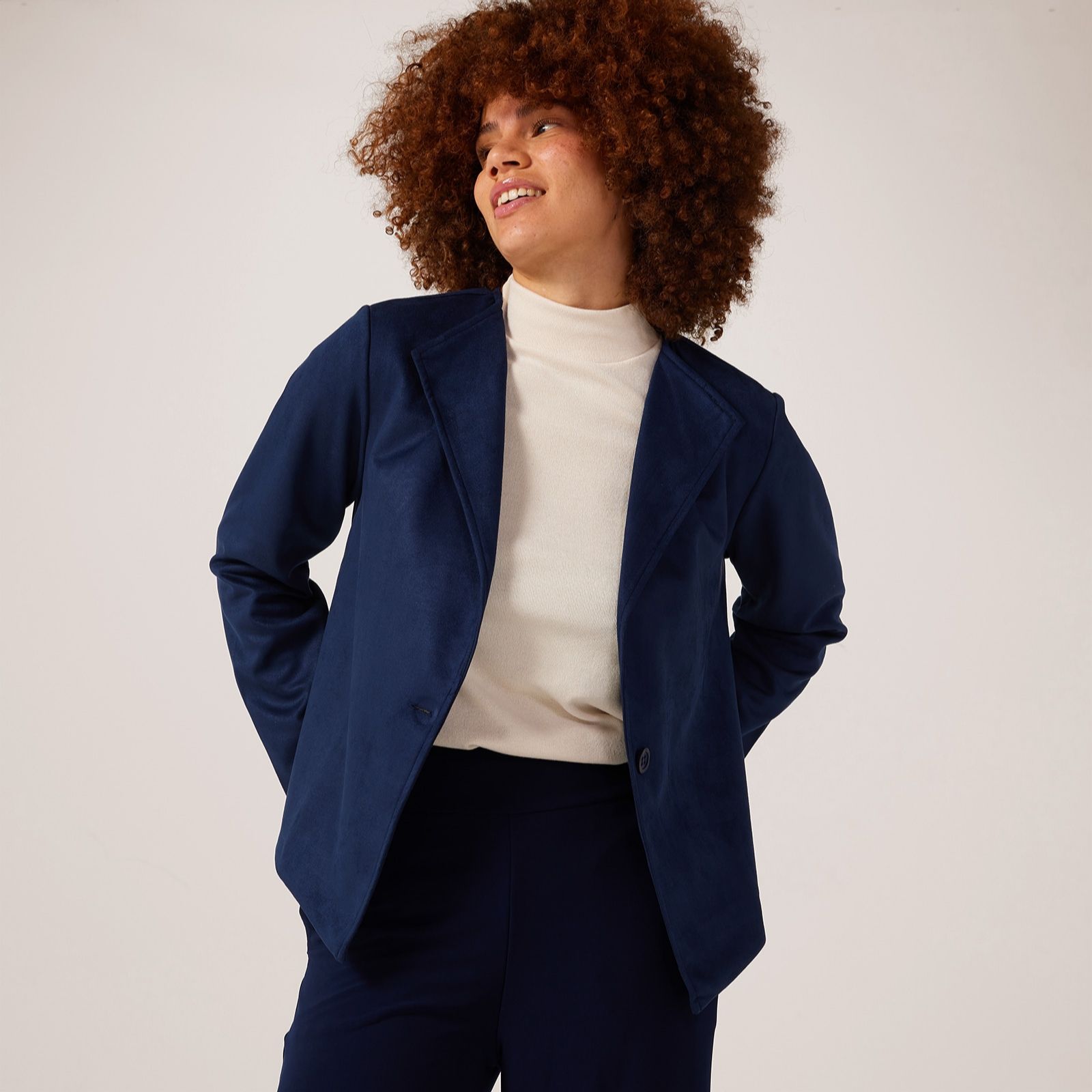 Introducing the Kim & Co Stretch Suede Longsleeve Eli short jacket, a chic addition to your wardrobe that effortlessly combines comfort and style. With its one-button closure and front lapel neckline, this jacket offers a relaxed fit that's perfect for layering over your favourite tops. The soft stretch suede fabric adds a luxurious touch, making it ideal for both casual outings and more polished occasions. Pair it with tailored trousers for a sophisticated look or with jeans for a more laid-back vibe.