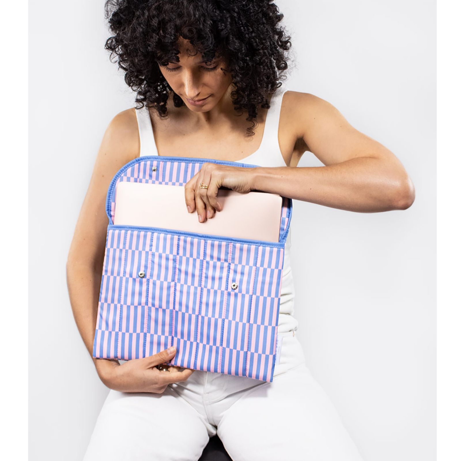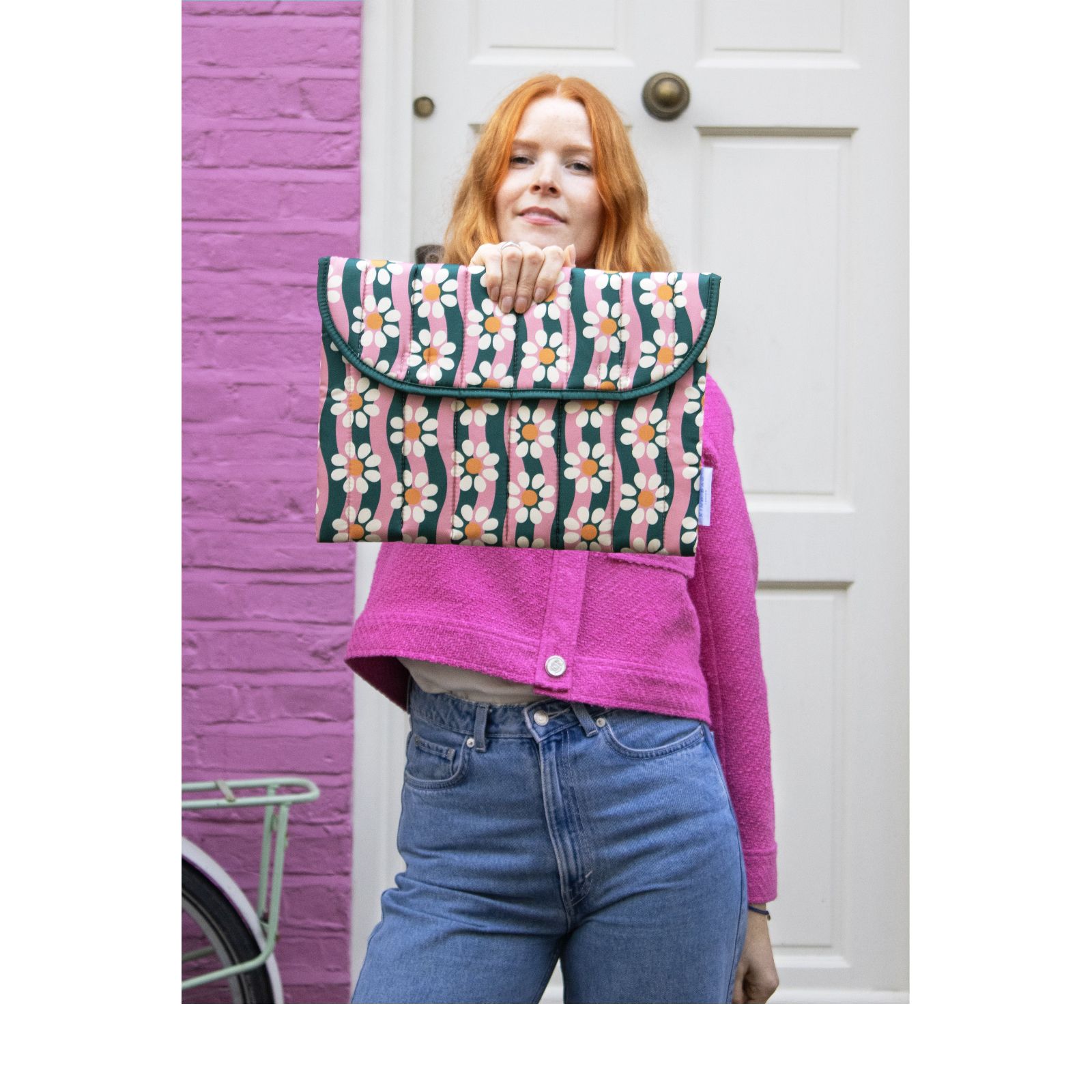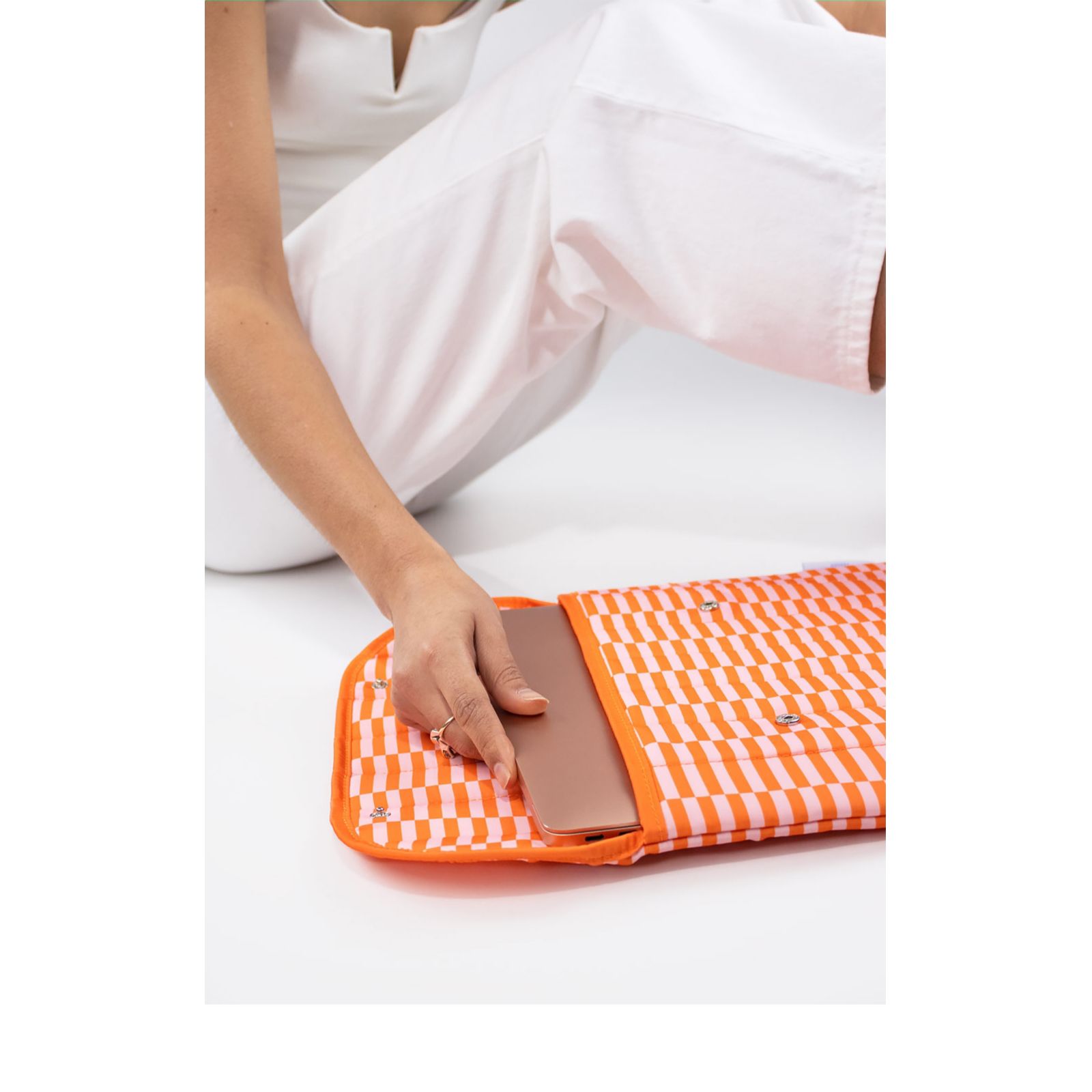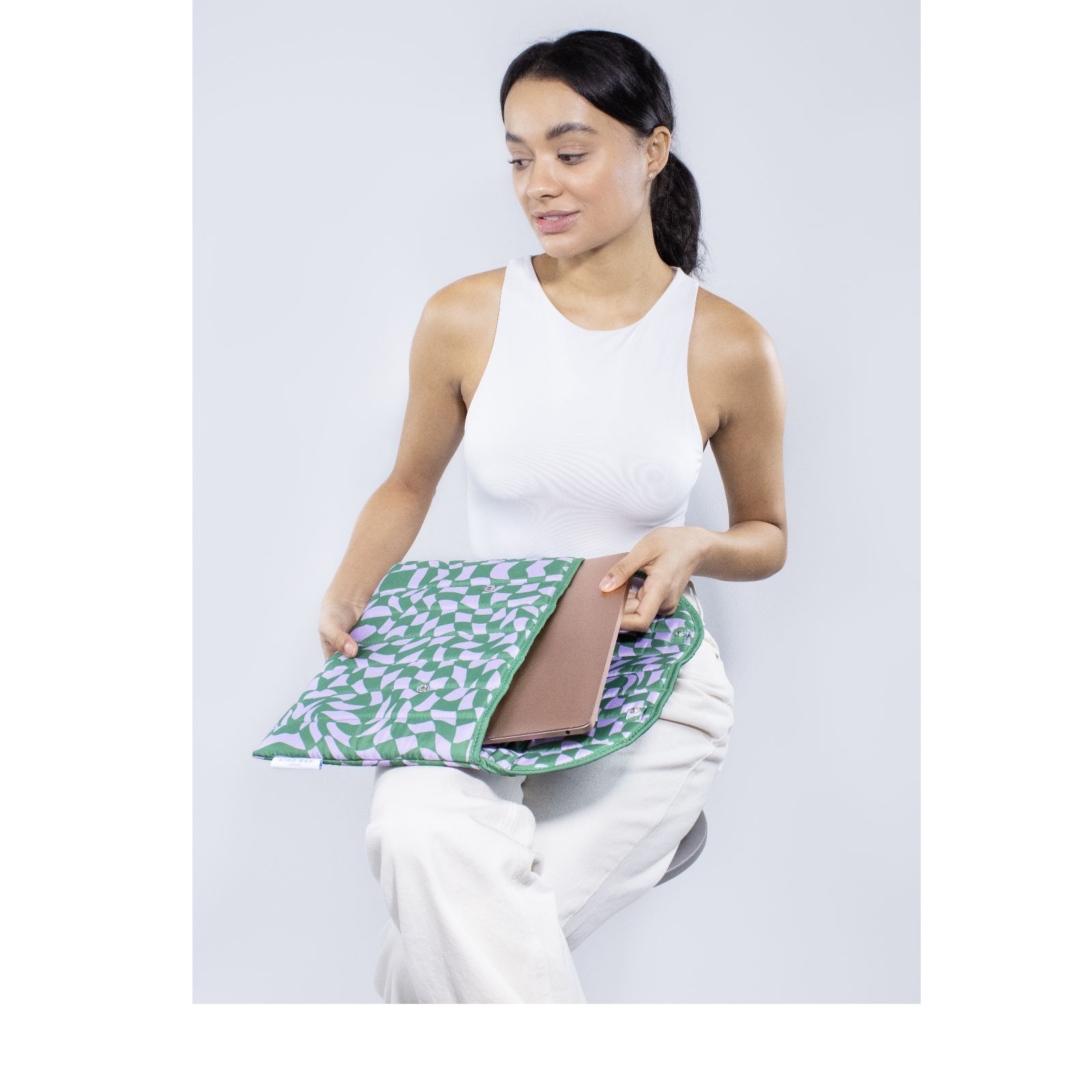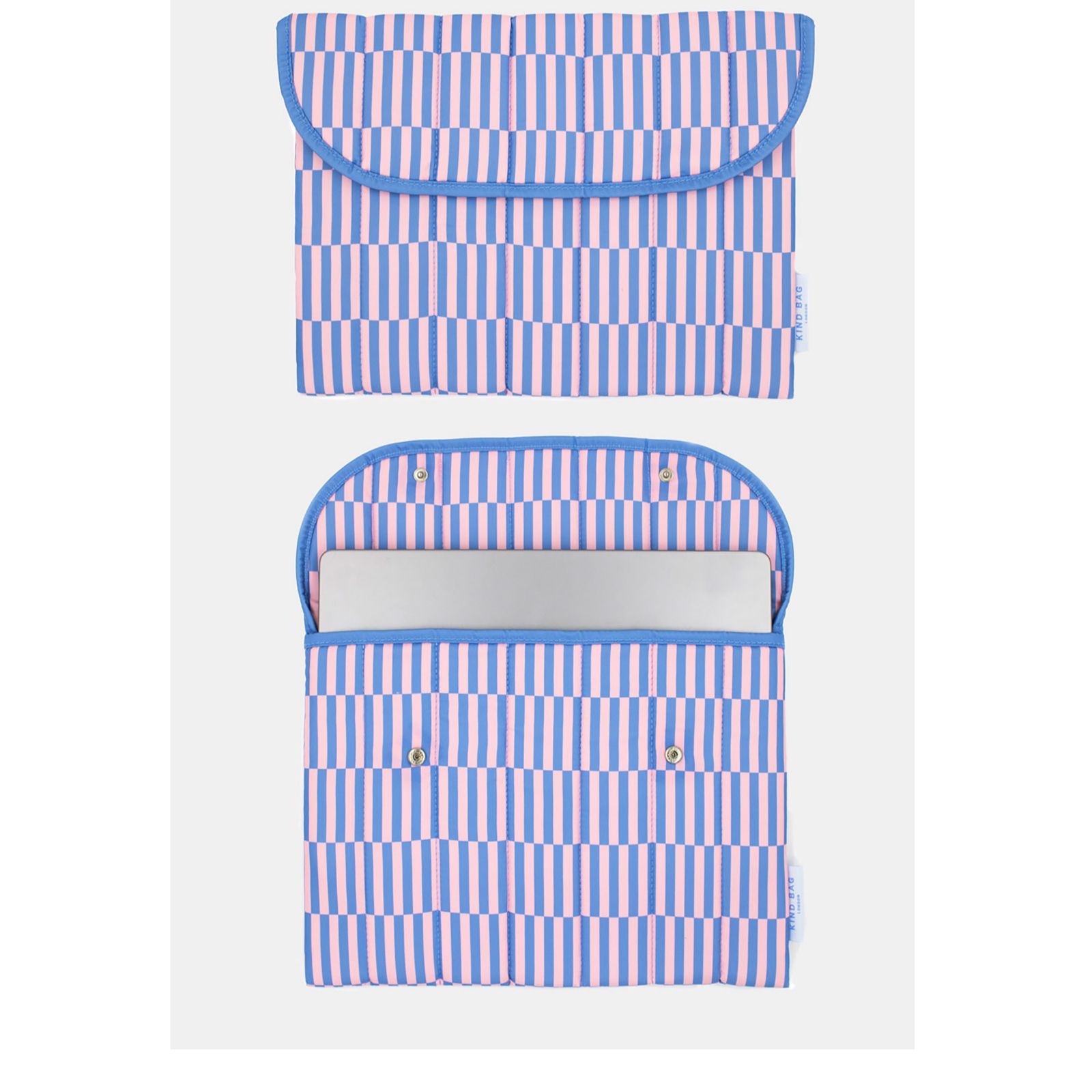 Keep your tech stylishly protected with this 13" laptop sleeve from Kind Bag. Crafted from recycled polyester made using PET bottles, it features soft quilted padding and a fold-over design secured with sleek metal buttons. Perfect for commuting, travelling or working from home, it keeps your device safe while adding a touch of charm to your everyday routine.