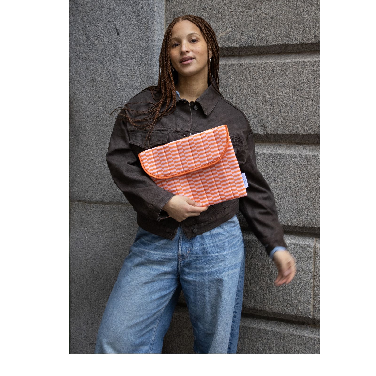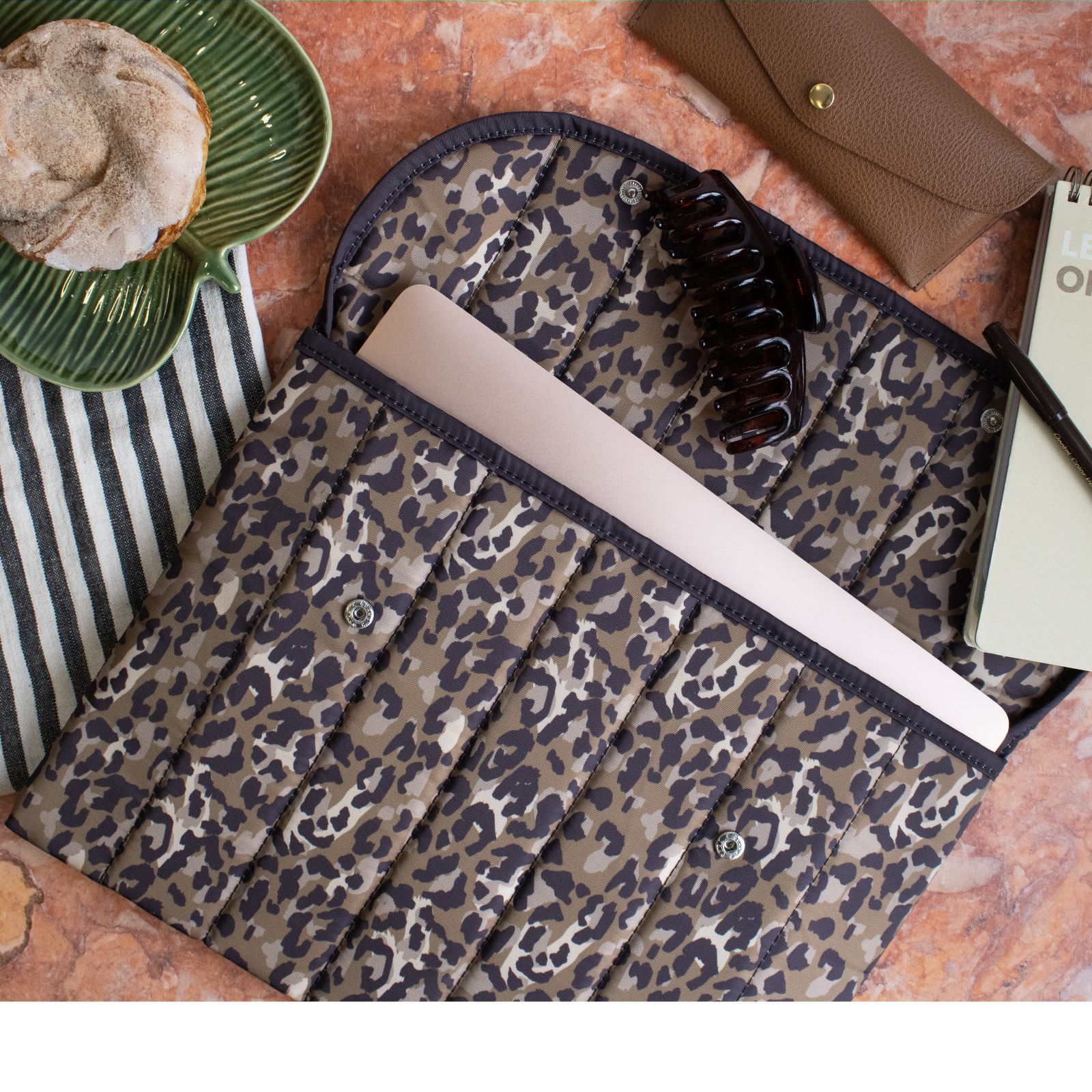 • Extra features: Quilted padding and fold-over design with metal button closure