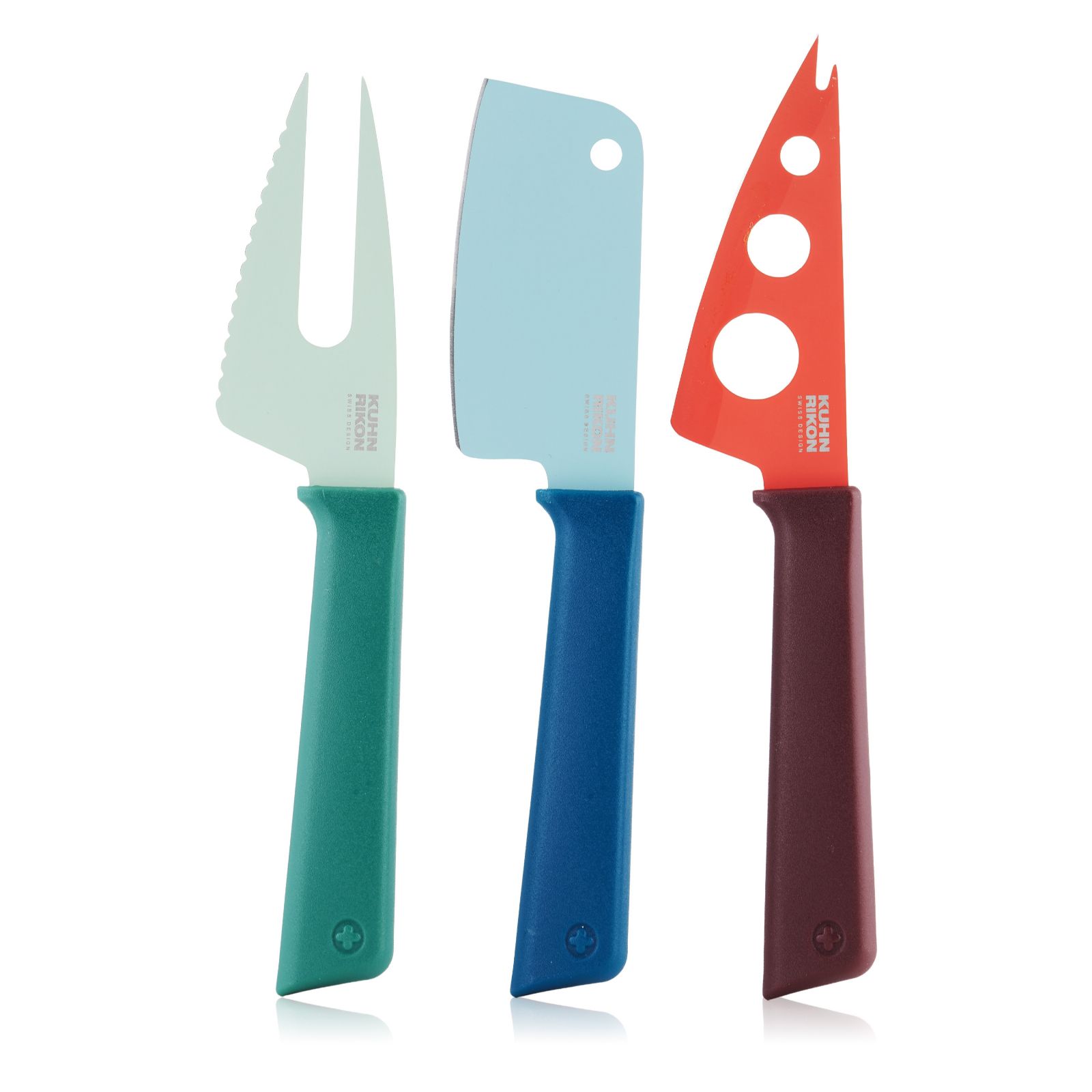 Perfect for cheese lovers and entertainers alike, the Kuhn Rikon Colori+ Cheese Knife 3 Piece Set brings precision and style to your kitchen. Whether slicing hard cheese with the mini cleaver, cutting and serving soft cheese with the cheese fork, or gliding through creamy brie with the perforated soft cheese knife, this set makes preparing and serving cheese, fruit and bread effortless and enjoyable.