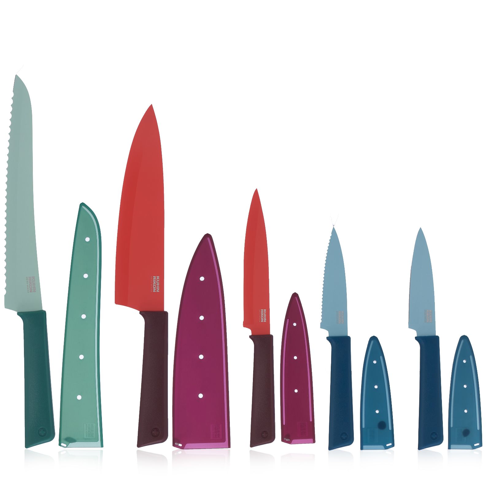 Prep like a pro with the Kuhn Rikon Colori+ Everyday 5 Piece Knife Set, combining lightweight design, razor-sharp blades and non-slip handles for effortless control. Featuring the five most essential knives for any kitchen, from slicing bread to precision paring, each comes with its own protective sheath, making them safe to store and perfect for everyday cooking tasks.