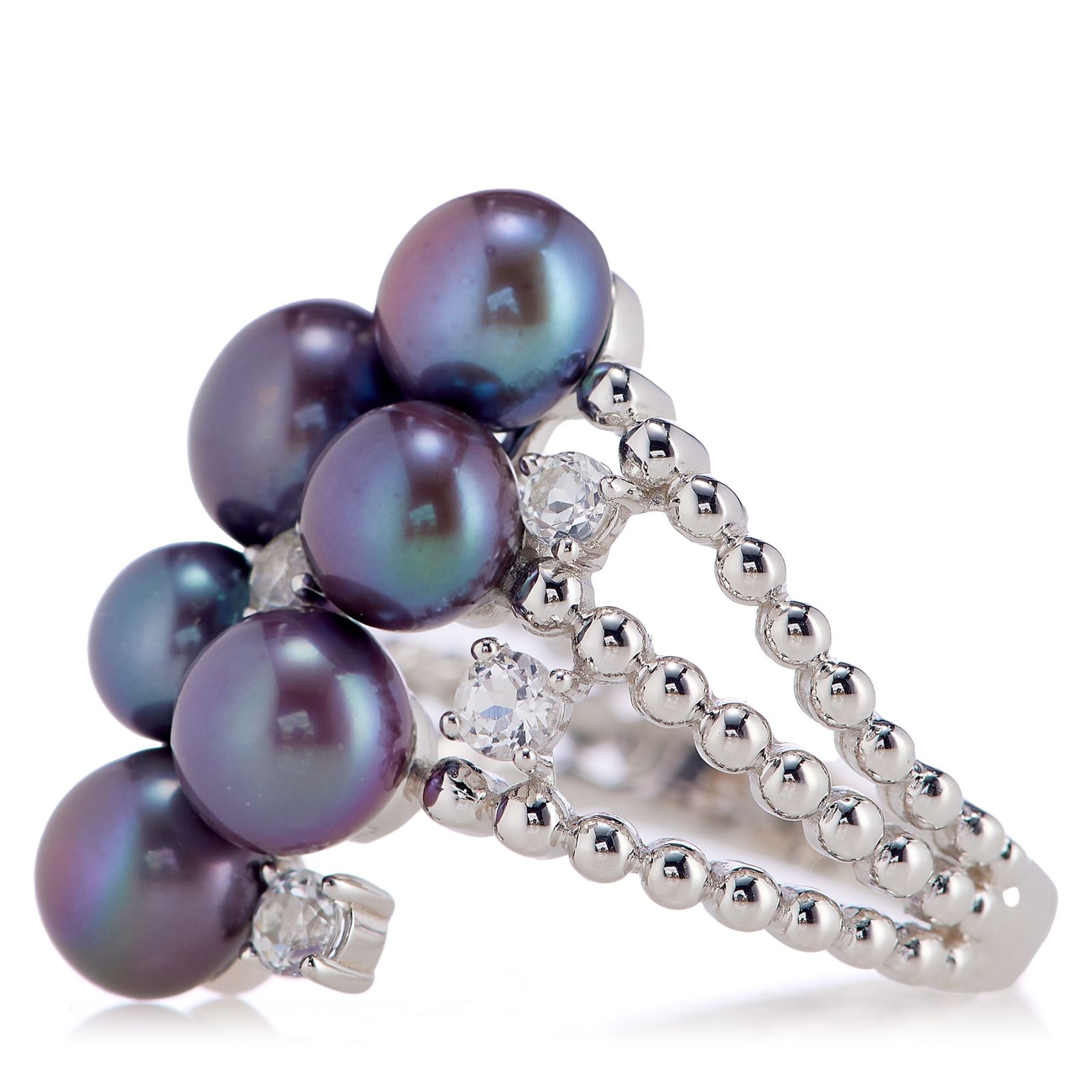 Elevate your elegance with this exquisite cluster ring from Lara Pearl, featuring a stunning combination of freshwater cultured pearls and white topaz stones. Crafted from sterling silver with a rhodium plating, this piece showcases six lustrous button-shaped pearls and seven sparkling round white topaz stones. Perfect for adding a touch of sophistication to any outfit, this ring is a timeless addition to your jewellery collection.
