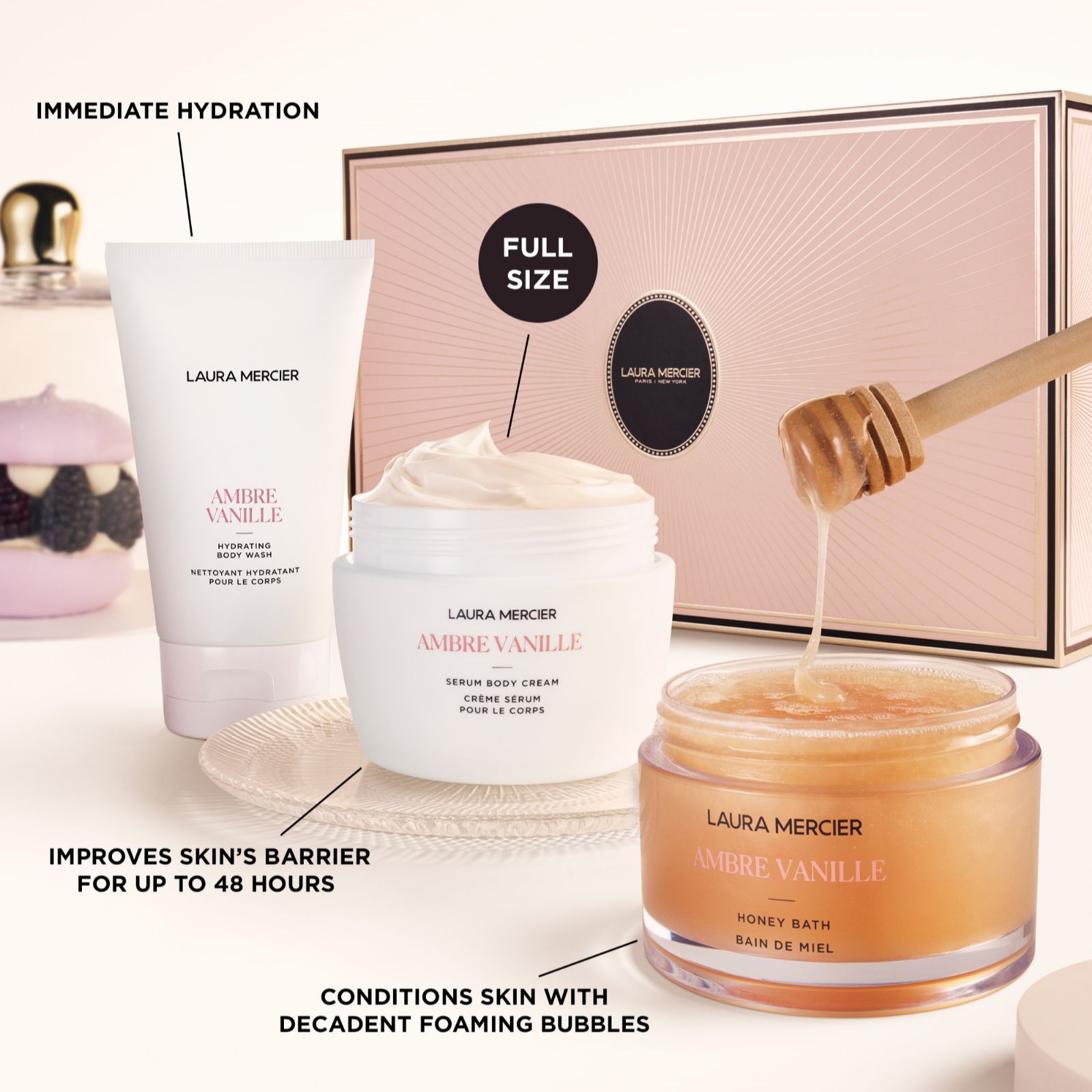 Immerse yourself in the decadent Ambre Vanille experience with this luxurious bath and body collection from Laura Mercier. Featuring the soft sensuality of amber blended with the warm comfort of vanilla, this trio helps bring a touch of elegance to your daily rituals. Perfect for unwinding after a long day or adding a little indulgence to your mornings, it includes a serum body cream, hydrating body wash and honey bath with dipper.