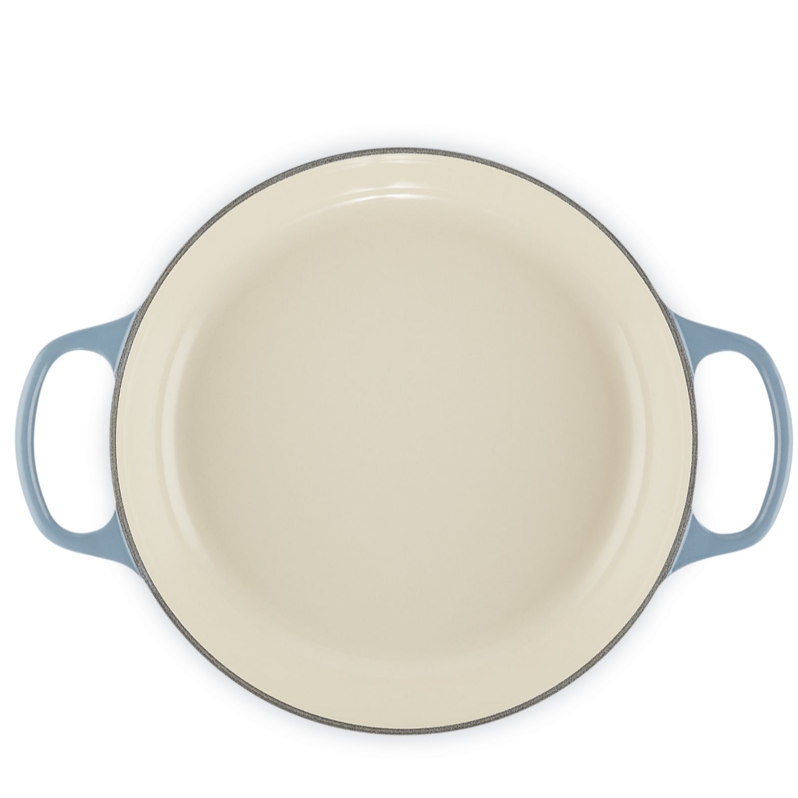 - the shallow design is ideal for browning, simmering and baking. This cast iron workhorse is safe for the oven, all hob types and the grill, plus it retains heat beautifully to keep food warmer at the table.