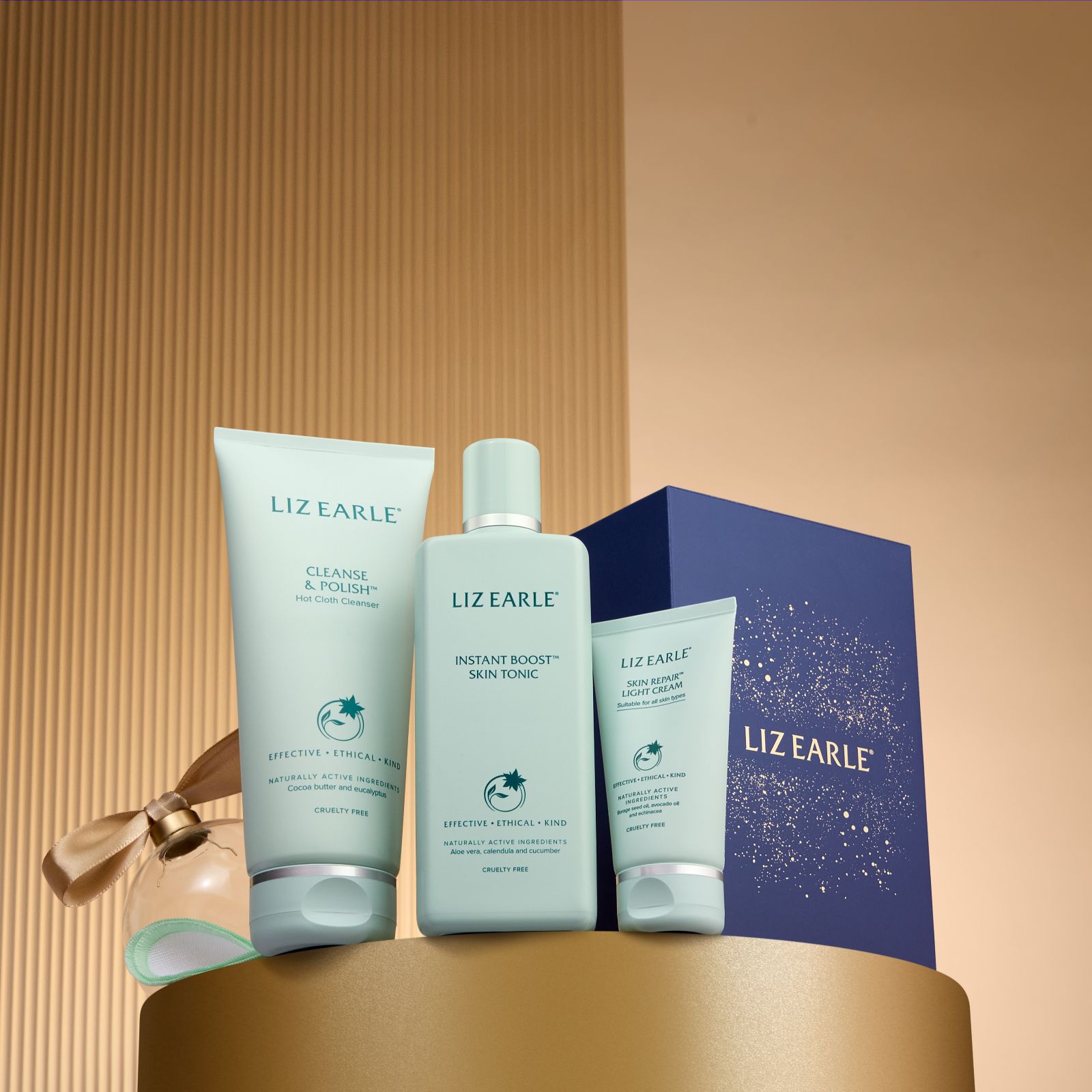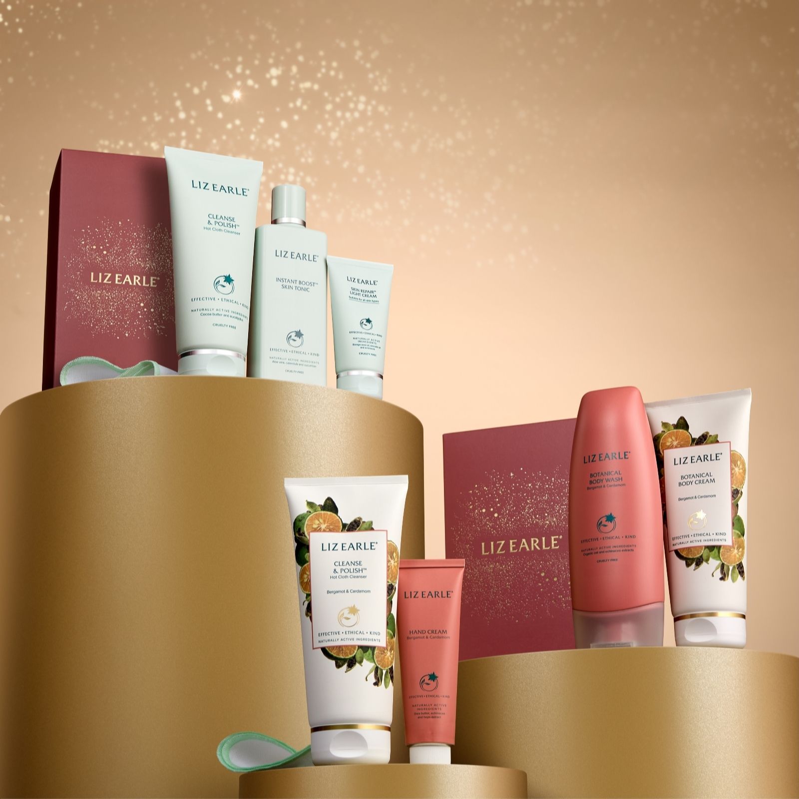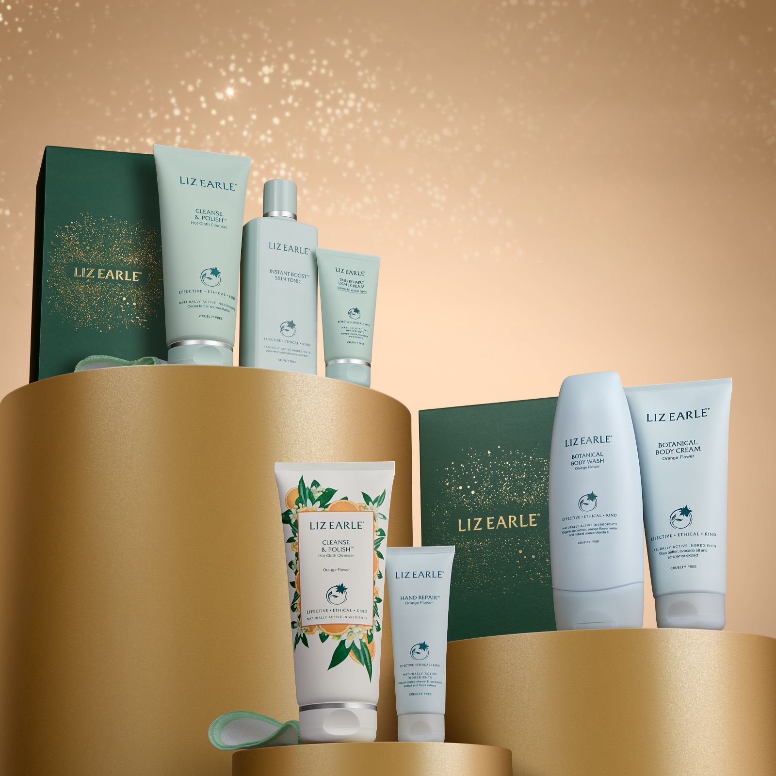 Treat them to the wonders of Liz Earle botanical beauty with this seven-piece Face & Body Gifting Collection. It boasts an array of full-sized Liz Earle icons, including a duo of Cleanse & Polish Hot Cloth Cleanser (one Original and one in your choice of fragrance), Instant Boost Skin Tonic, Skin Repair moisturiser in your choice of formula, plus Hand Repair and two beautifully scented bodycare heroes. Perfect for a touch of pampering and complete with two printed gift boxes, this indulgent collection is ideal for popping under the tree this Christmas.