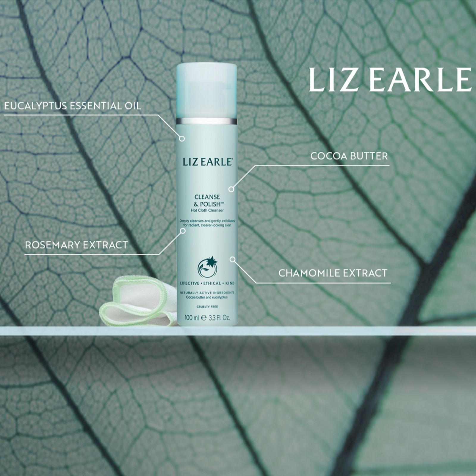 - 1 x Cleanse & Polish Hot Cloth Cleanser (200ml; full size) - this rich, indulgent cream deeply cleanses to instantly remove daily impurities and make-up to leave skin feeling smooth, balanced and exceptionally clean. Used with the pure cotton cloth, it gently exfoliates, lifting away dead skin cells to reveal a glowing complexion. Formulated with rosemary, eucalyptus, hops and chamomile extracts, plus cocoa butter and beeswax. Suitable for all skin types