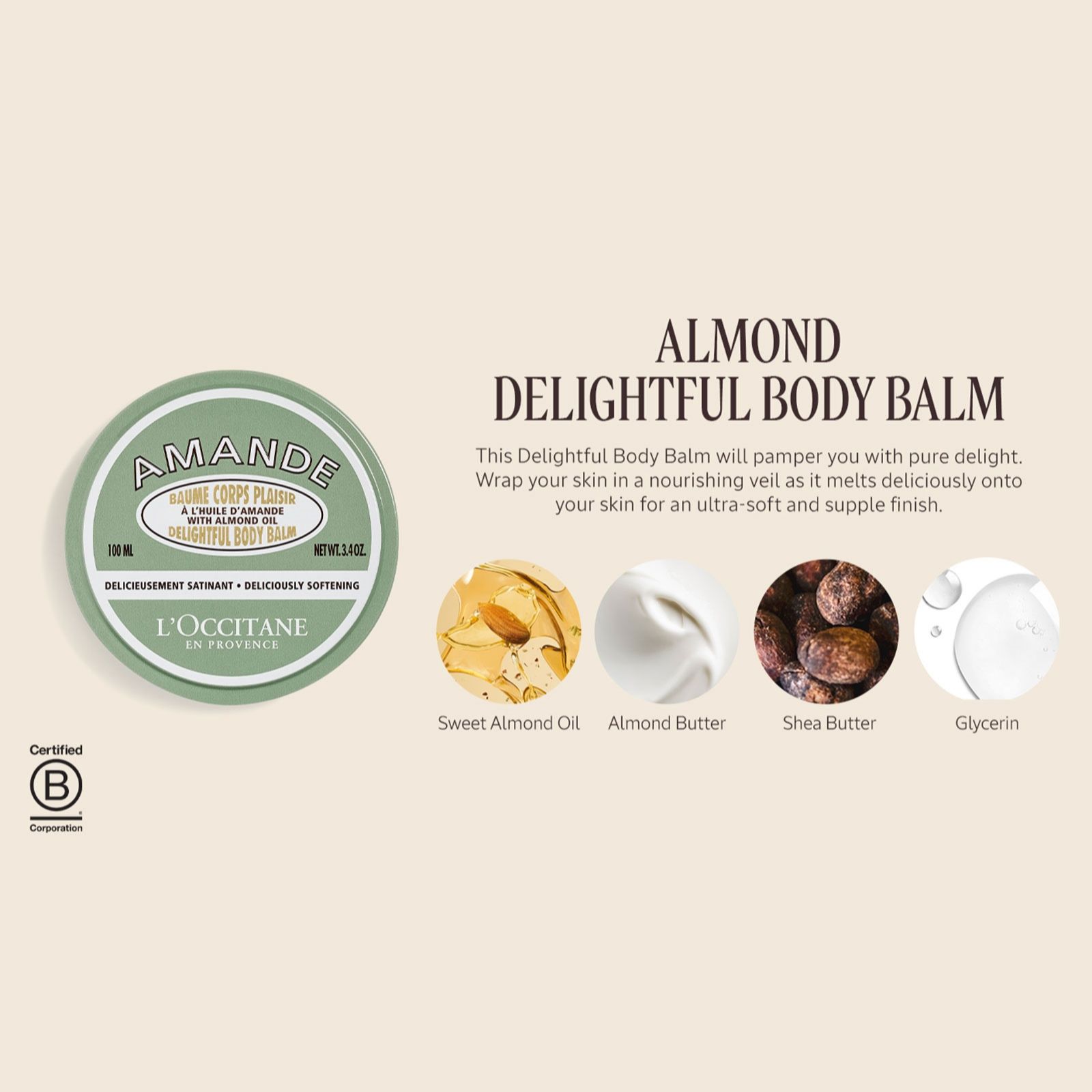 - the Almond Delightful Body Balm is brand new to QVC! This luxurious massage balm is designed to elevate your self-care routine, providing a truly indulgent experience. The combination of almond butter and almond oil from Provence works to enhance your skin's elasticity and softness. As you massage it in, the rich texture melts effortlessly, creating a soothing sensation that envelops your body in comfort.