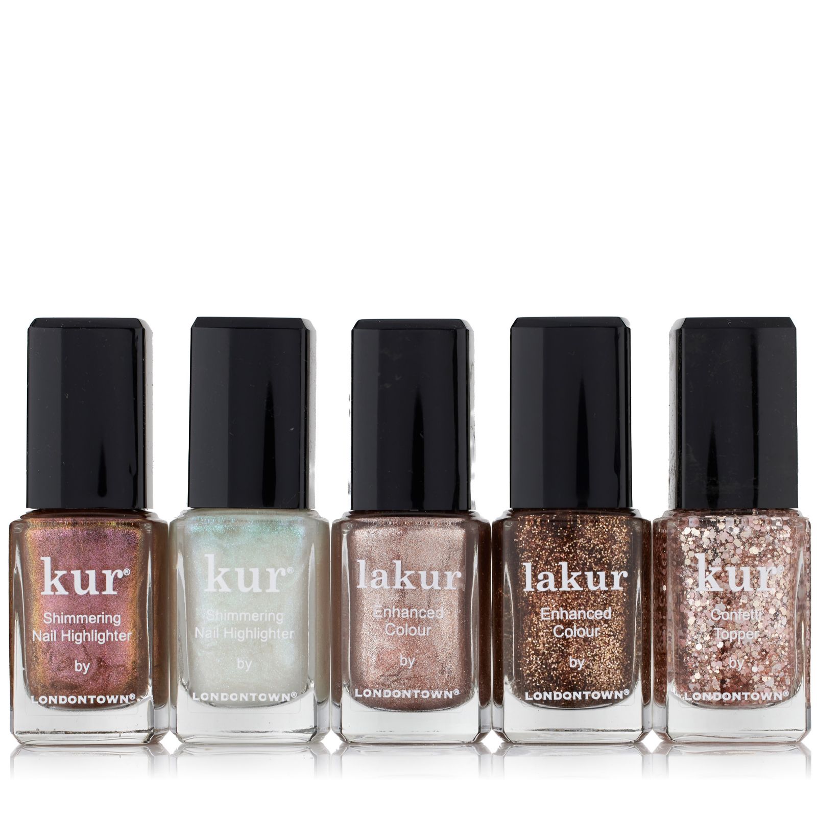Bring a dazzling twist to your nail routine with the LONDONTOWN 5 Piece Shimmer and Sparkle Collection. Inspired by make-up highlighters, this set delivers glistening radiance and multi-dimensional colour with every stroke, making it perfect for everything from everyday glam to festive celebrations. Layer, mix or wear solo for endless looks that help your nails stand out in style.