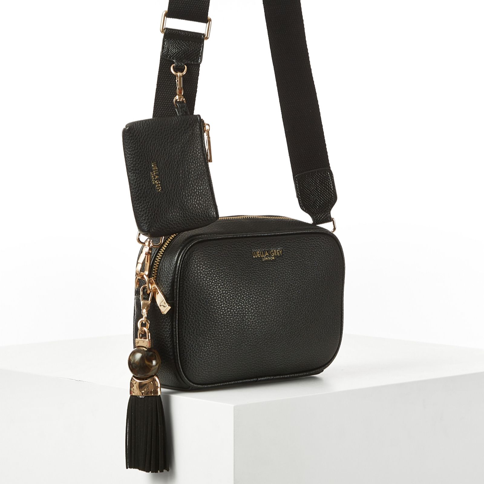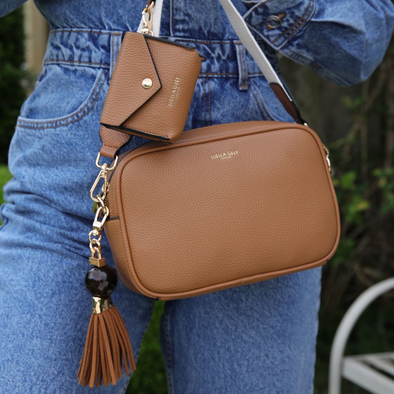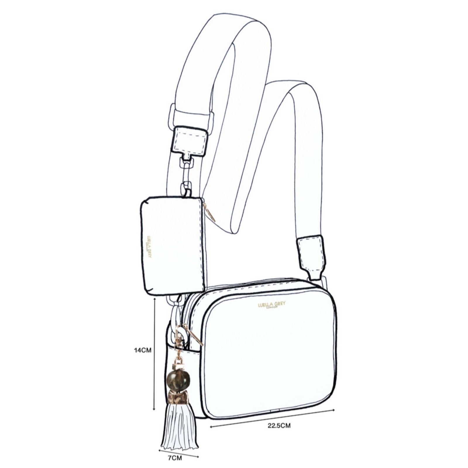 The Luella Grey Betty camera bag brings a stylish twist to your weekend wardrobe with its signature Thames Tassel charm and versatile design. Made from soft, grainy faux leather, this crossbody bag is both chic and practical. The canvas strap features the Edna zip-top purse charm, which can be detached and used to keep your essentials secure and close at hand. Perfect for a casual day out or a night on the town, Betty combines fashion and function effortlessly.