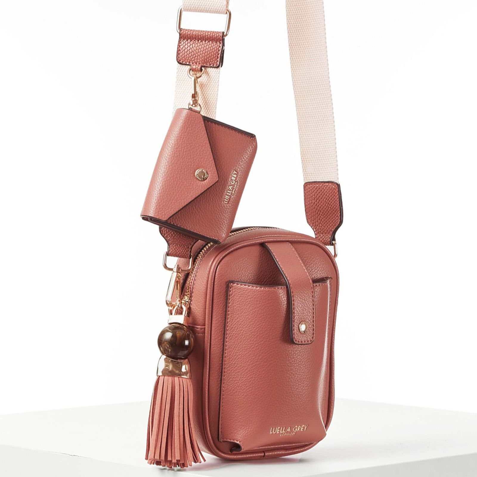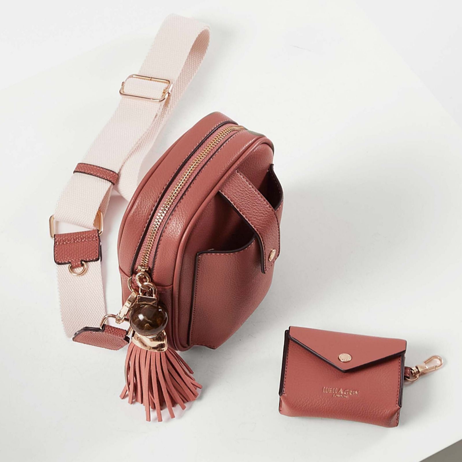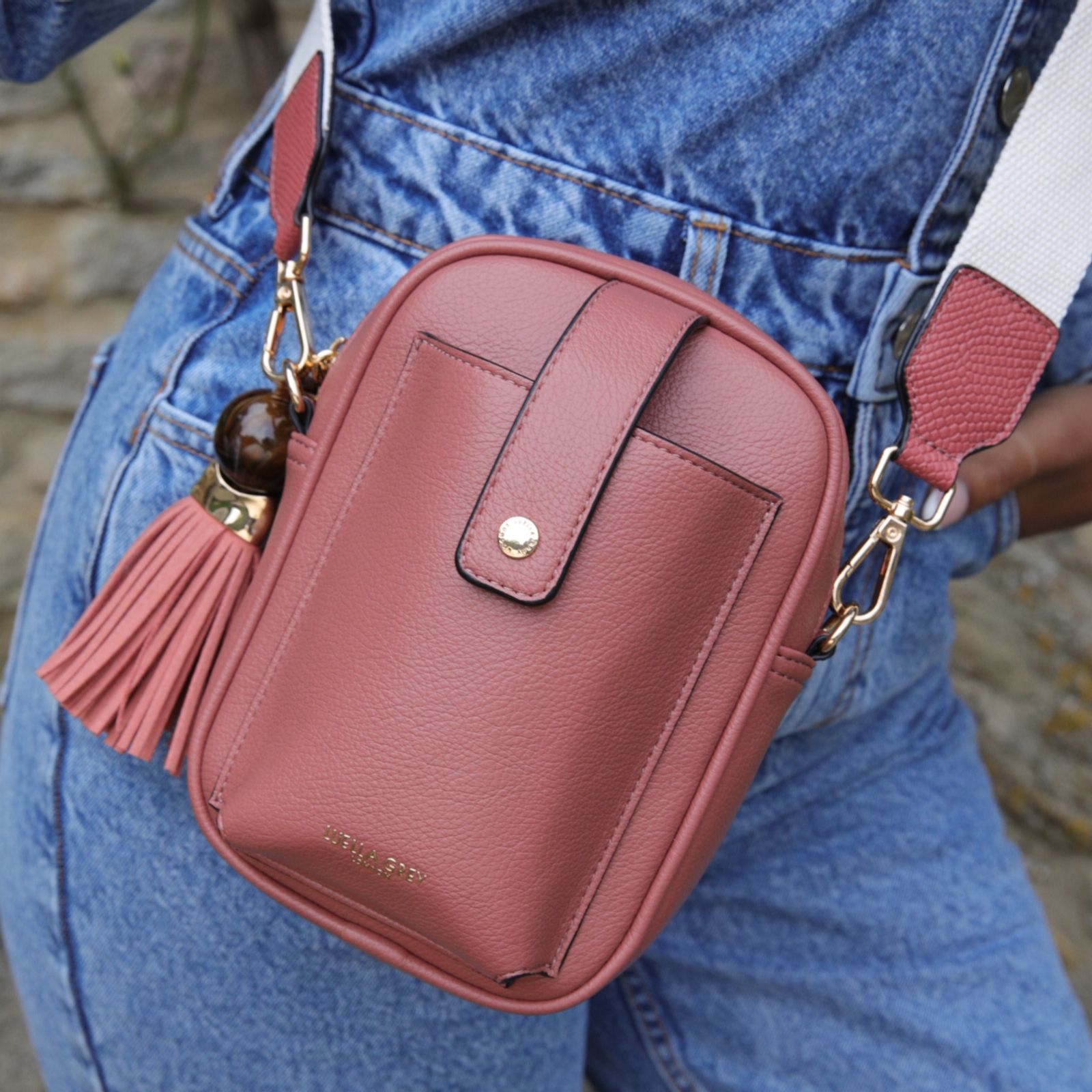 Introducing the chic Luella Grey Elise Camera crossbody from our SS25 Weekend Edit collection. This elegant bag combines style and practicality with its multi-compartment design and signature Thames Tassel charm. Crafted from durable polyurethane with a polyester lining, it offers ample space for your essentials and features a front pocket for your phone. The canvas strap ensures comfortable wear, while the clip-on Emmy charm keeps your keys, cards, or AirPods close at hand. Ideal for weekend escapades, this bag is a must-have accessory.