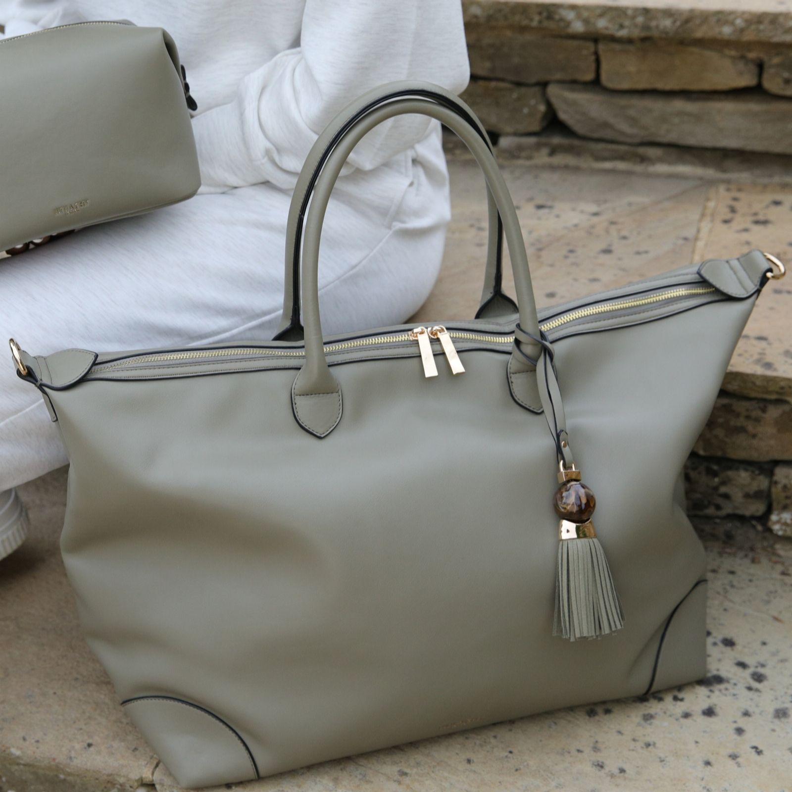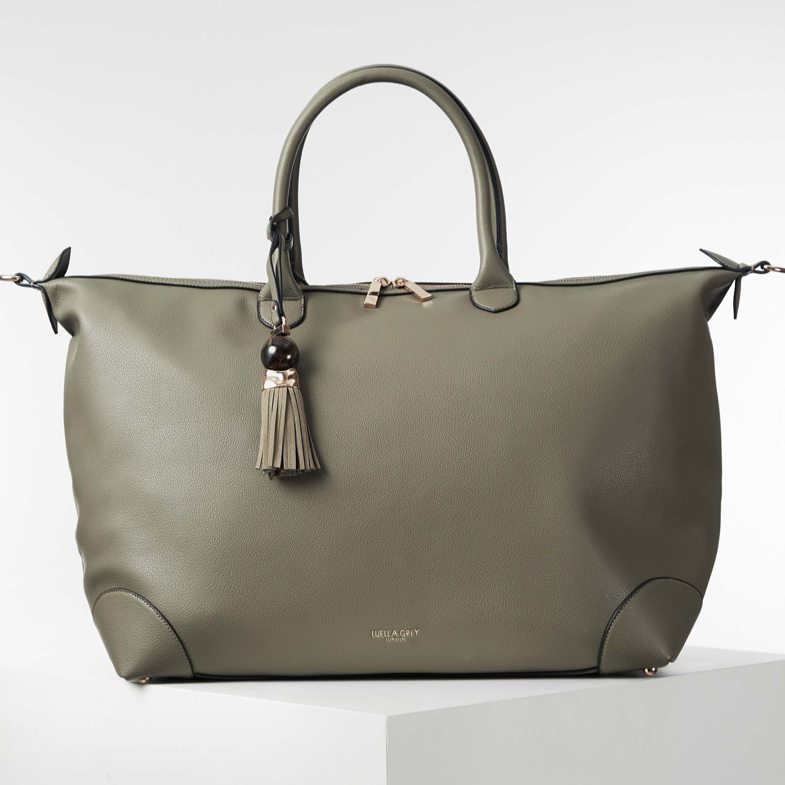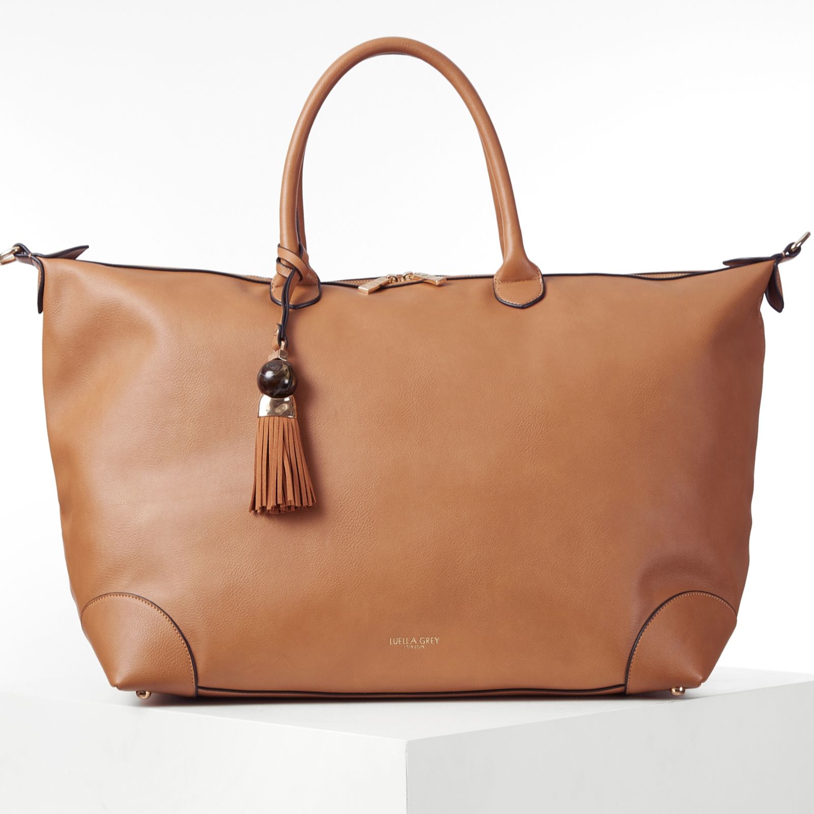 Discover the Luella Grey's Lana Travel Weekender, a holdall bag that marries space, practicality and beauty. Crafted from luxury pebble grain faux leather, this stunning bag features the new signature Thames Tassel charm and a zip top closure with two molten metal zip pullers. Perfect for a weekend getaway, it includes a long adjustable canvas strap, an internal zipper pocket with a key clip, and a slip-in phone pocket, ensuring all your essentials are organised in style.