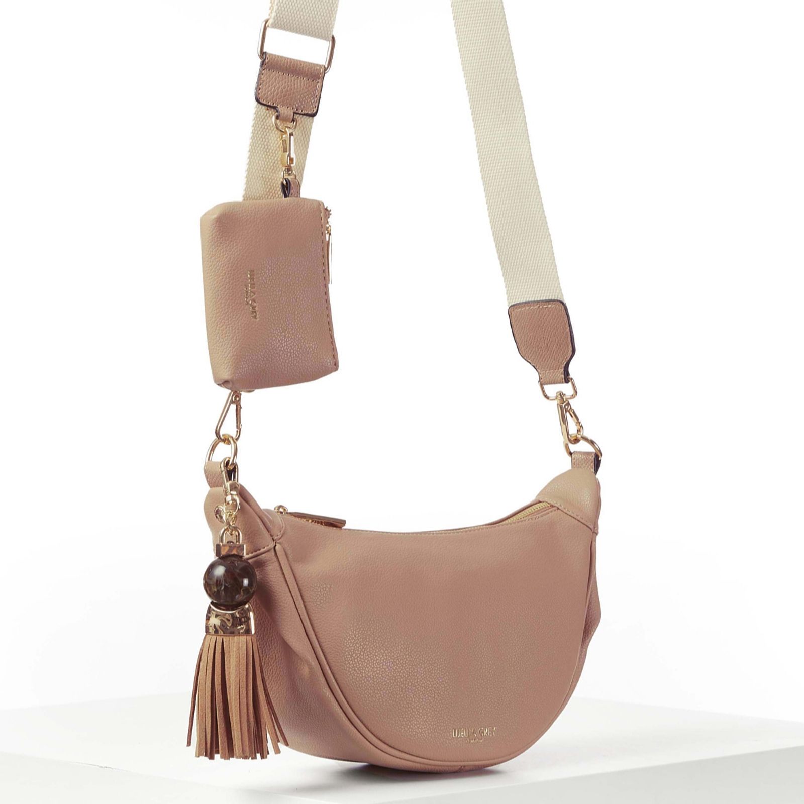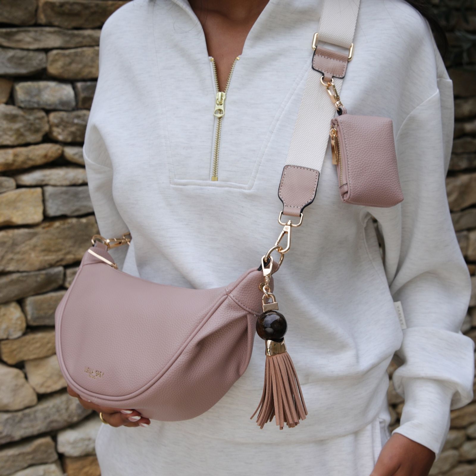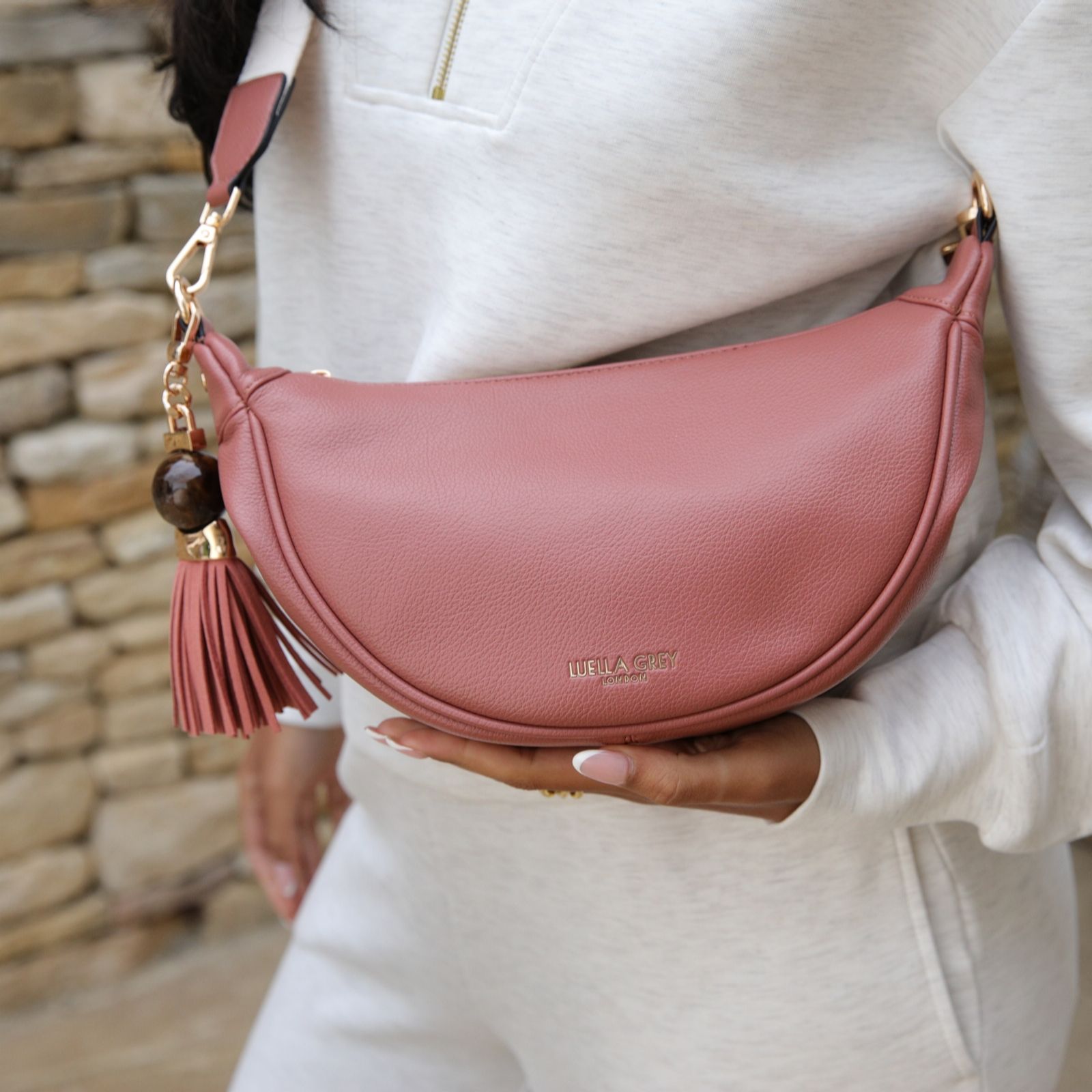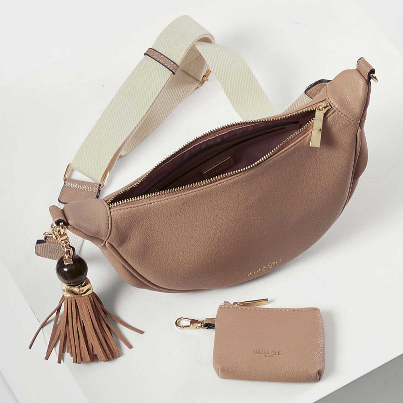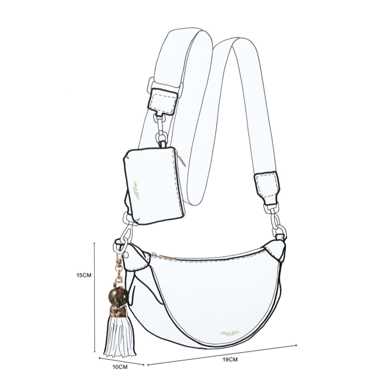 Elevate your casual style with the Lauren sling bag from Luella Grey's The Weekend Edit collection. This sporty, half-moon-shaped bag is crafted from super soft luxury faux grain leather, ensuring an effortlessly chic look. Designed to be worn across the body, it features a detachable miniature Edna purse charm, perfect for keeping your ear pods, keys or cards secure. With a roomy zip-top design, this bag is ideal for carrying all your essentials, making popping out both stylish and practical.