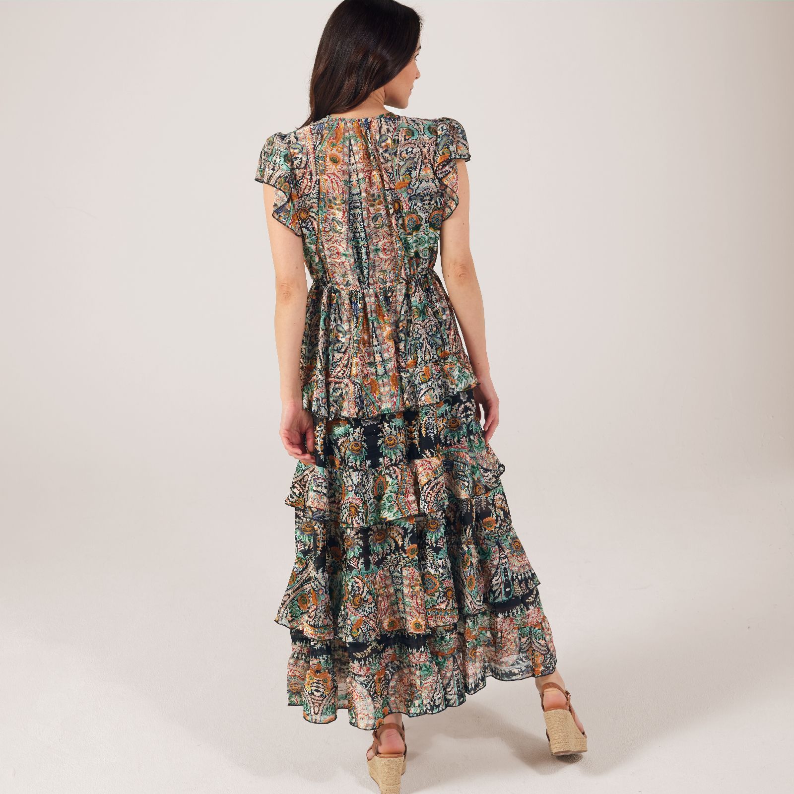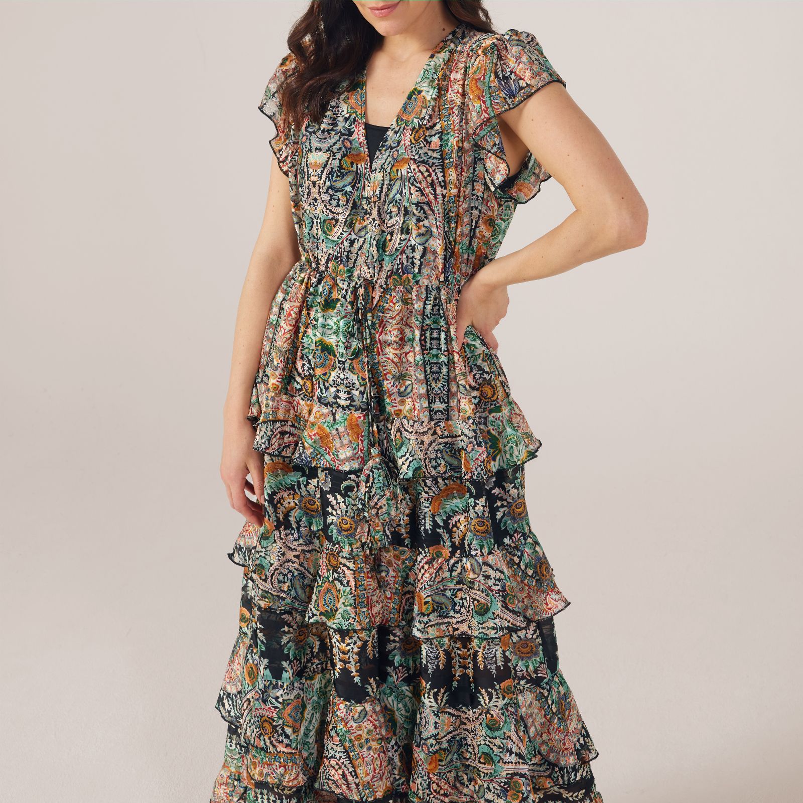 Dance through the seasons with the Malissa J chiffon frill maxi dress, a whimsical ensemble that flutters with every step. This dress, complete with a coordinating cami vest, boasts a tiered design enriched with frill trim and sparkling lurex threads for a touch of glamour. The drawcord ties at the waist, finished with playful tassel ends, allow for a customised fit, ensuring this dress moves beautifully with you. From garden parties to elegant evening events, this dress offers a flattering silhouette and a versatile style that's perfect for any event.