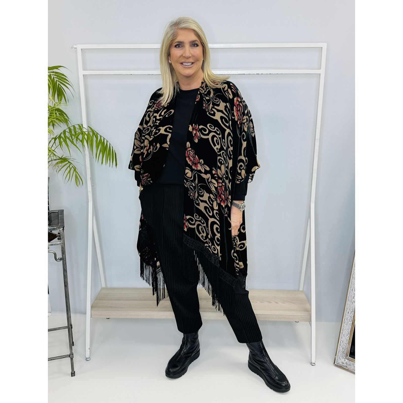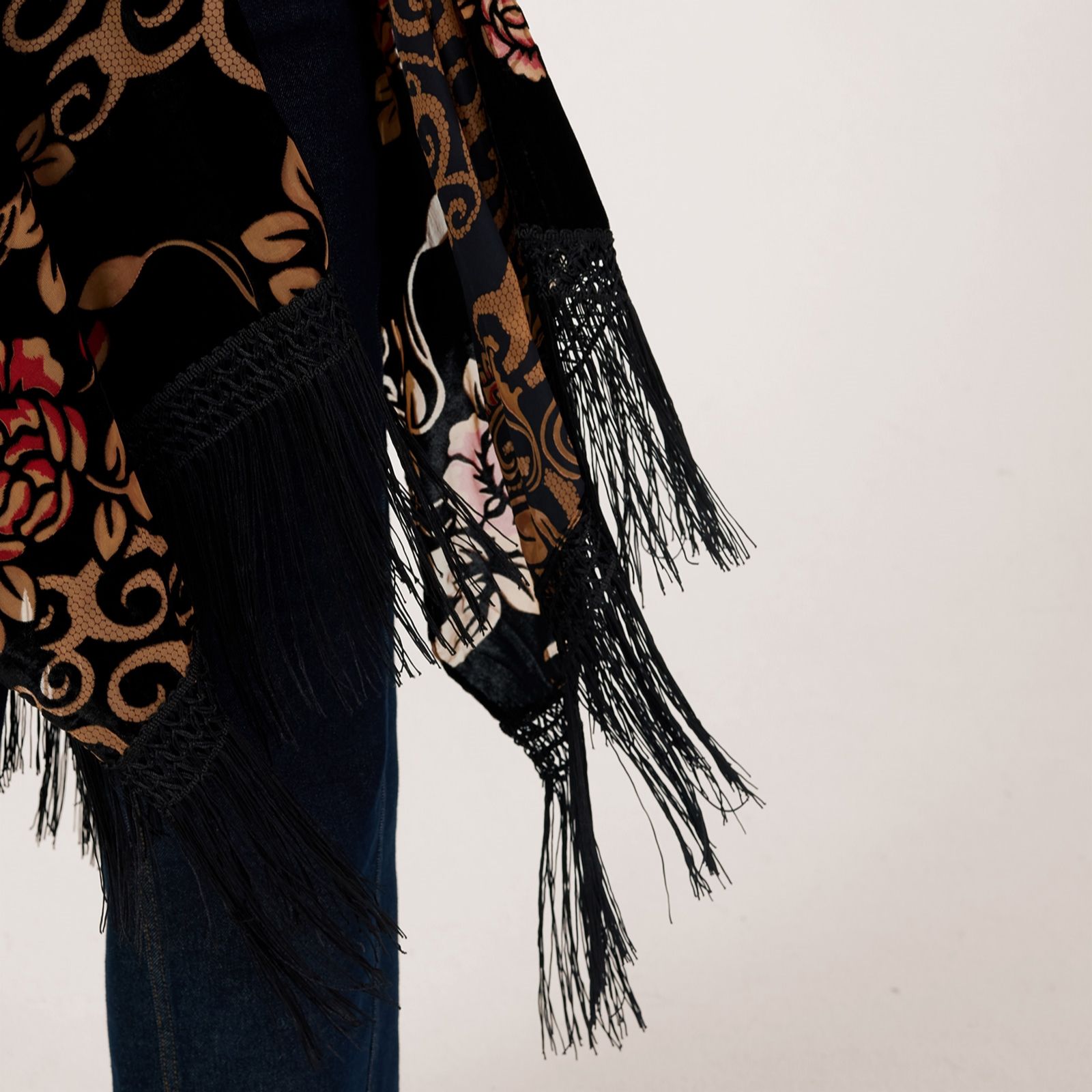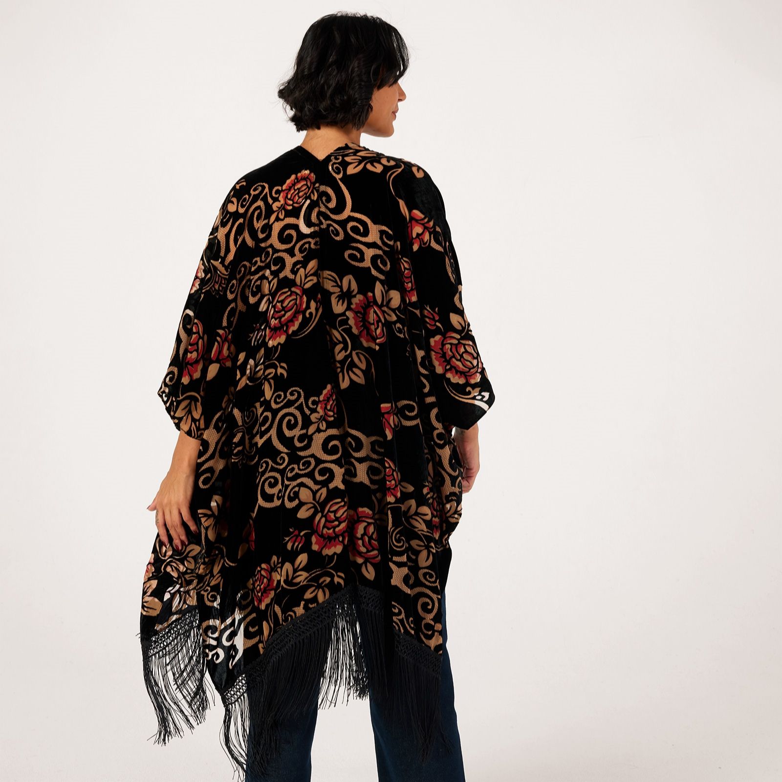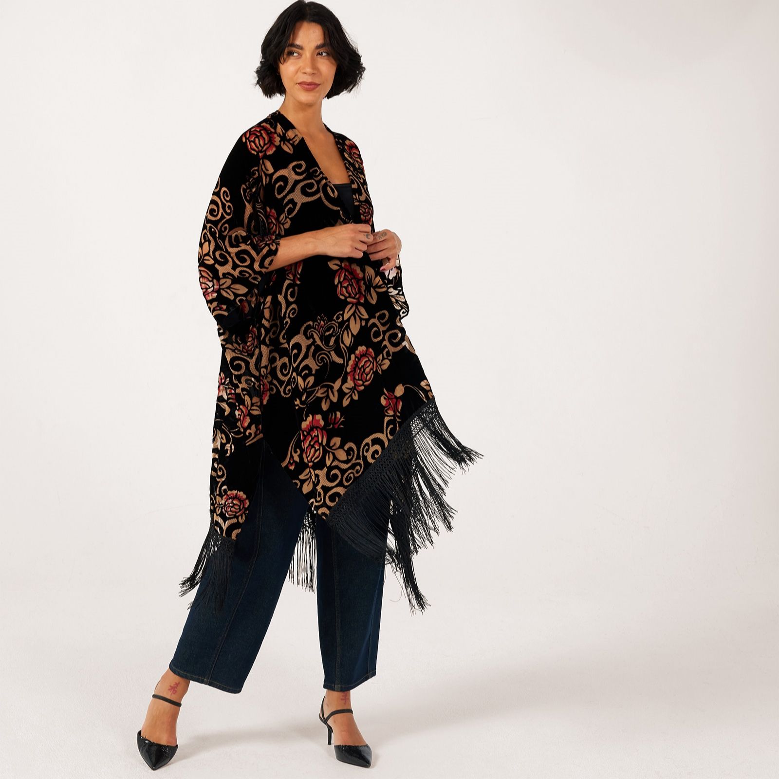 Bring a touch of romance to your wardrobe with the Malissa J Devore Tassle Wrap, showcasing a captivating roses floral devore design in elegant black and rose pink hues. Whether you're layering it over an evening dress for a special occasion or draping it casually for daytime chic, its open front and flowing tassel trim promise effortless sophistication. Try pairing it with tailored trousers and a simple top to let the wraps unique texture and pattern shine.
