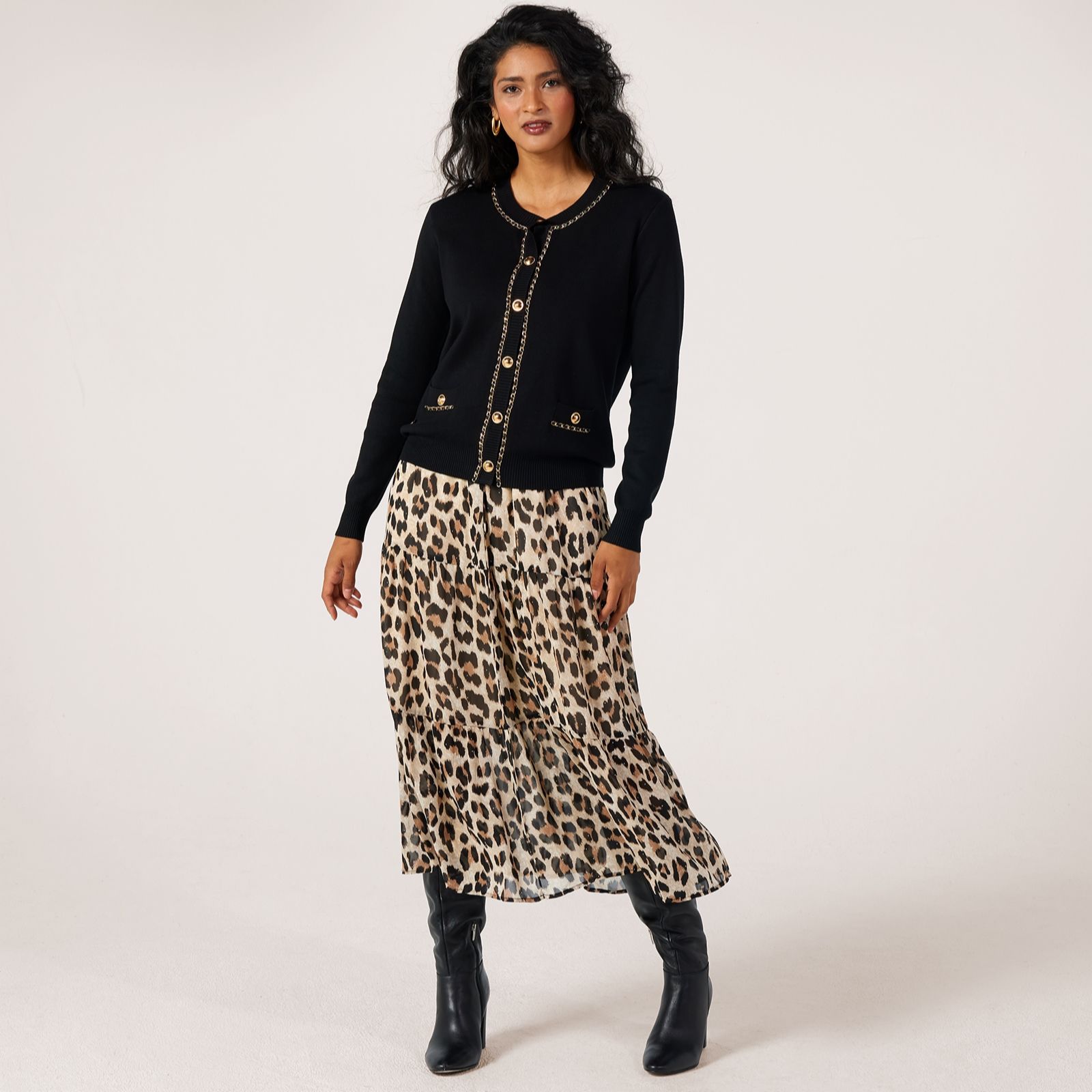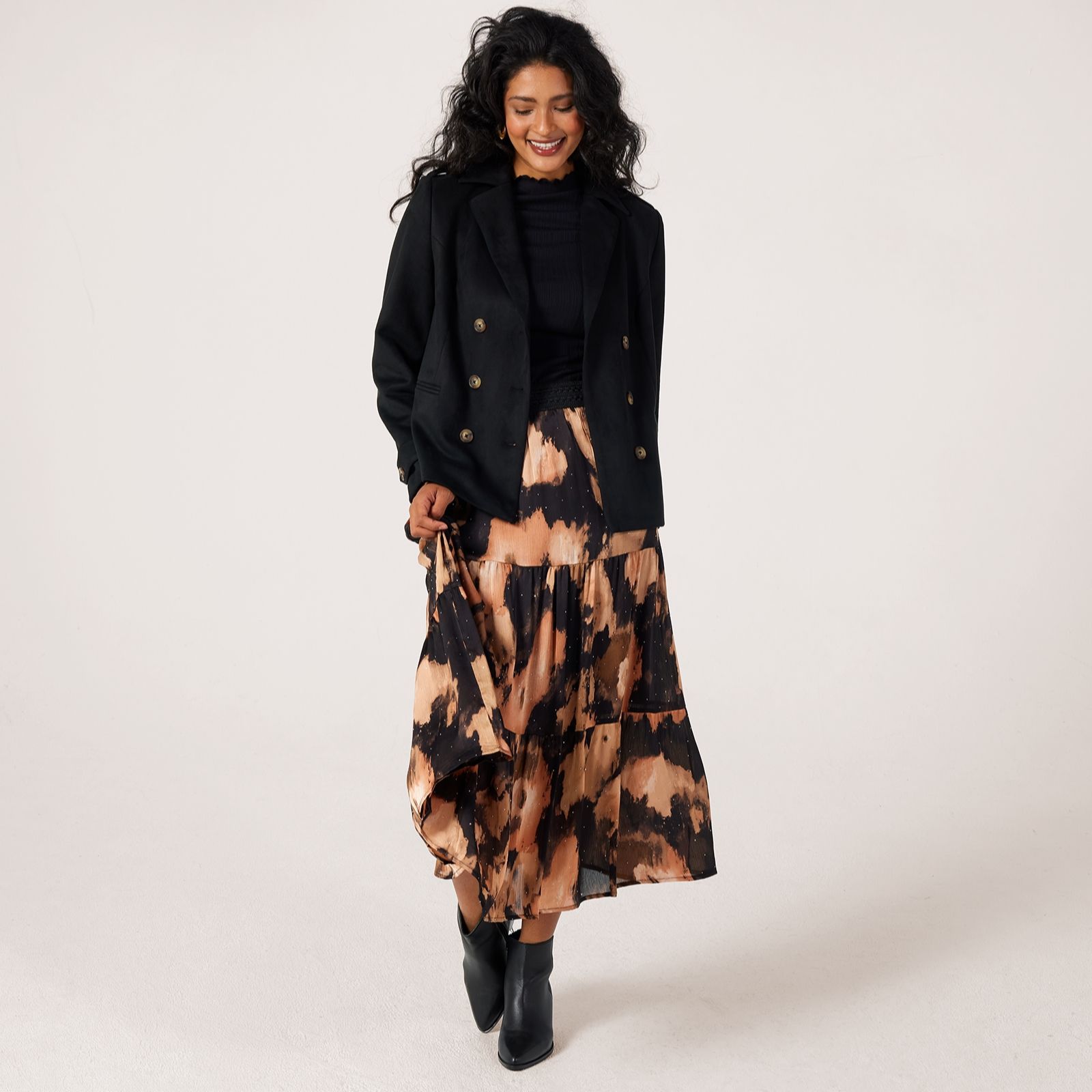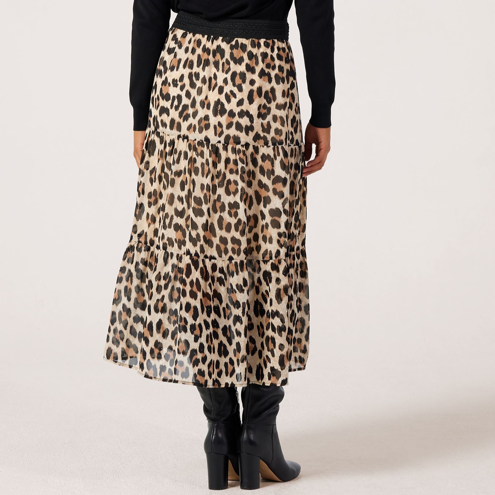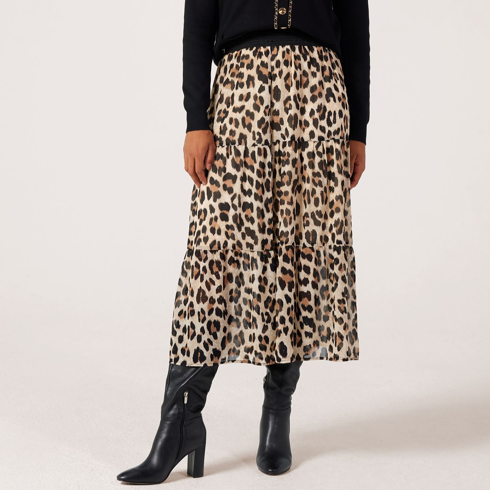 Step out in effortless elegance with this lined tiered maxi skirt from Malissa J, designed with a relaxed fit and a striking all-over print. This skirt features a three-tiered silhouette, elasticated waist and scatterings of silver-tone stud embellishments, creating a look that's both playful and chic, perfect for brunch with friends or an evening out. Style it with a simple blouse and ankle boots for a polished yet easy-going outfit.