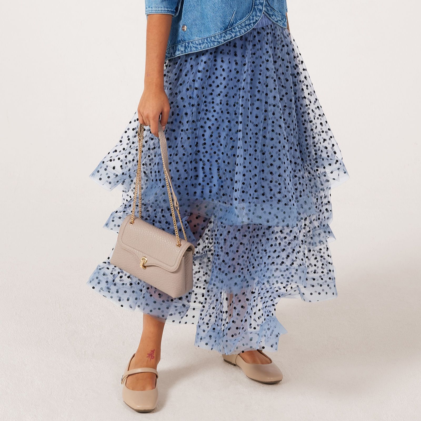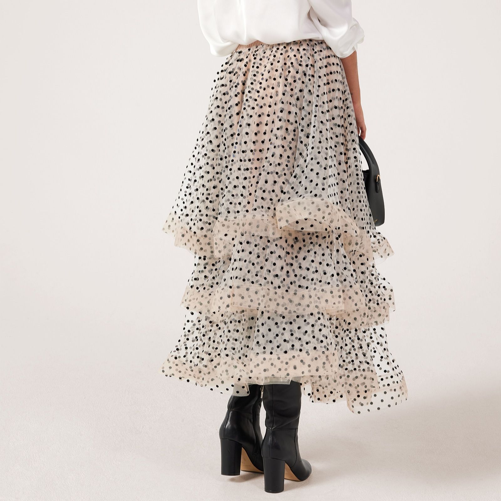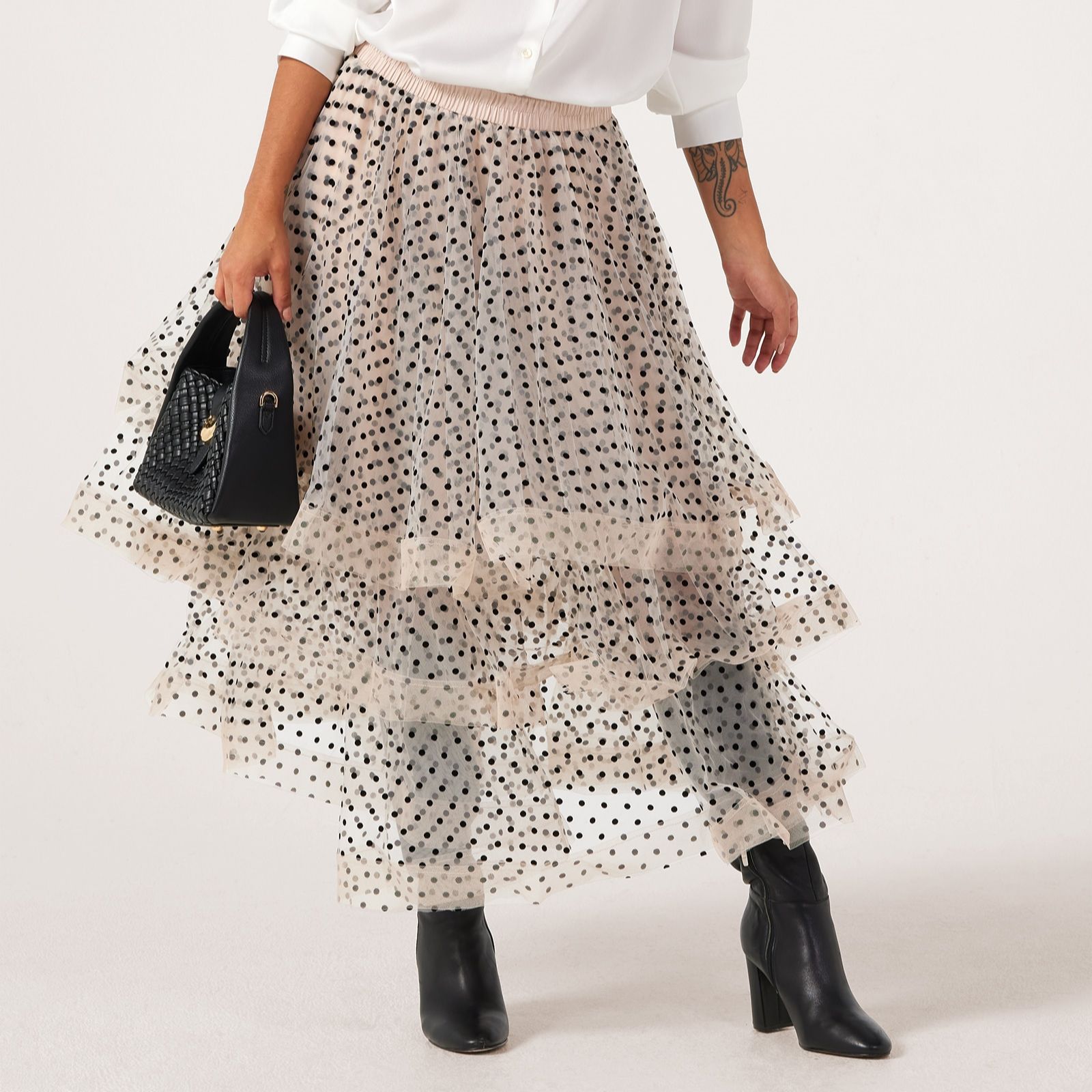 Bring a touch of elegance to your everyday style with this mesh three tier skirt from Malissa J, designed with a satin-feel elasticated waistband and playful spot details on the mesh overlay. Perfect for everything from relaxed brunches to evening gatherings, this skirt's flowing silhouette offers effortless sophistication. Style it with a fitted knit or a tucked-in blouse for a chic, put-together look.