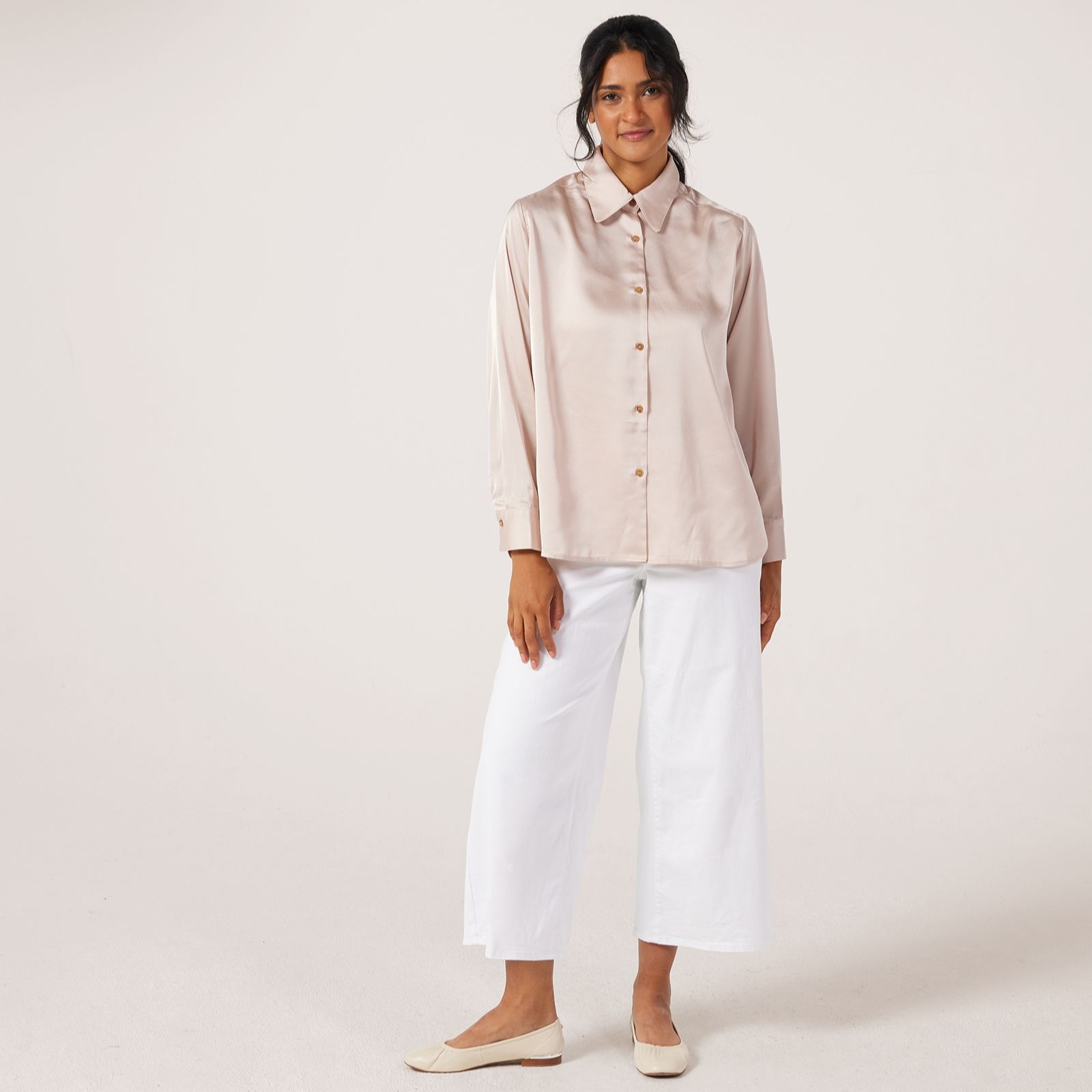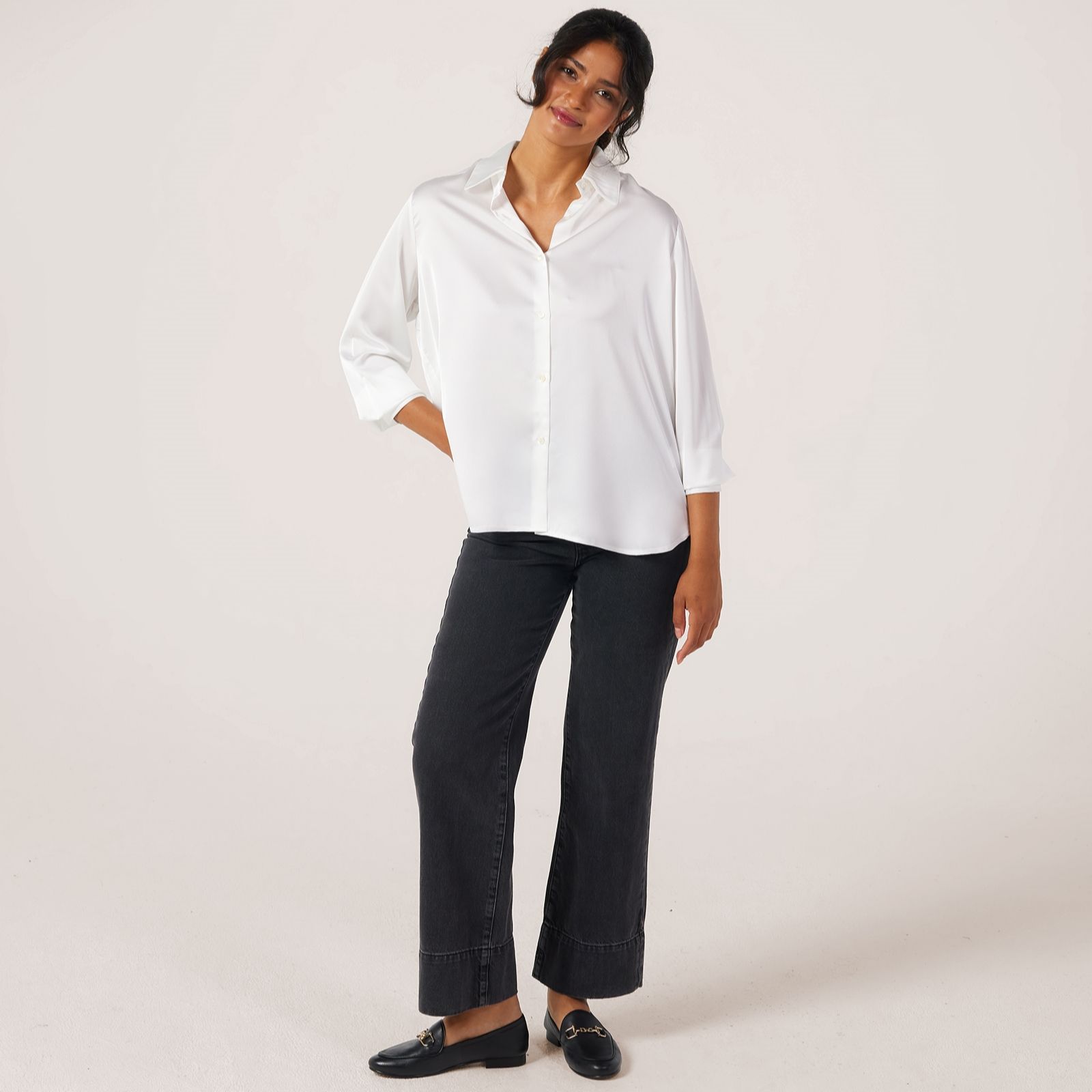 Add a touch of luxury to your everyday with this relaxed-fit shirt from Malissa J. With its lustrous satin hand-feel and elegant wide cuffs, this shirt brings effortless sophistication to any occasion. The classic collar and button-through front are complemented by pleated detailing at the back and a rounded hemline, making it perfect for everything from weekday meetings to weekend brunches. Layer over slim trousers or tuck into a skirt for a polished finish.