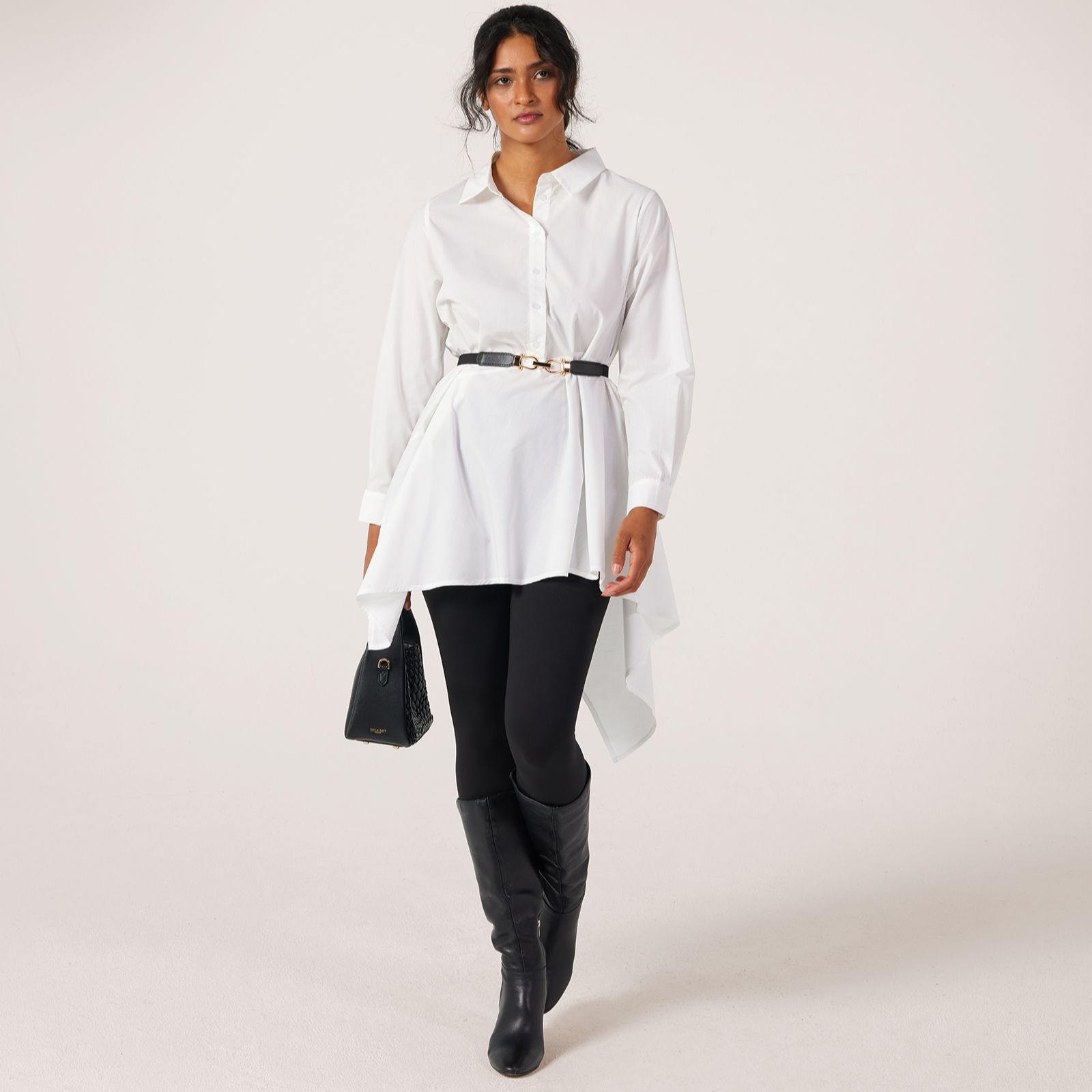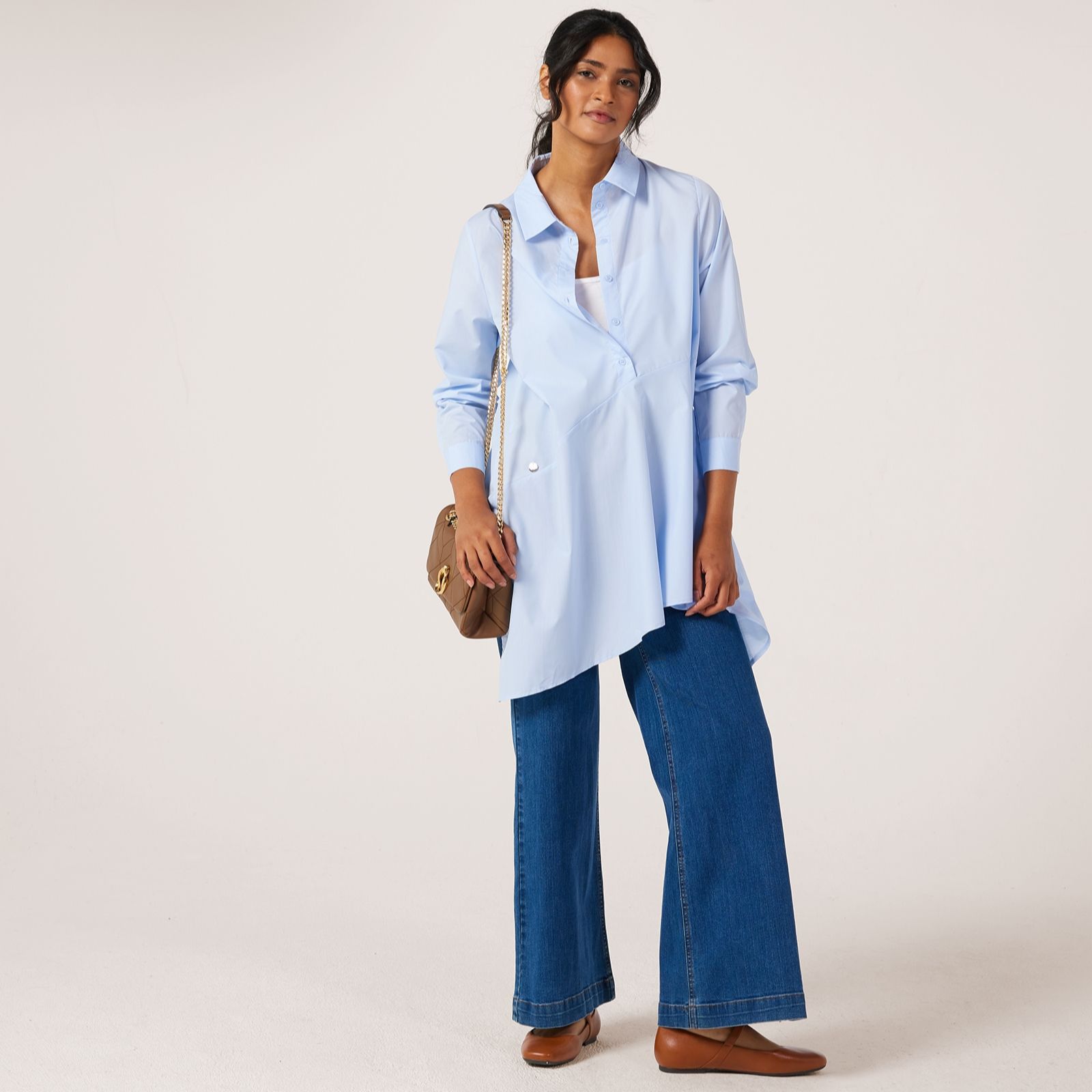 Channel contemporary chic in the uneven hem long shirt from Malissa J. This piece blends a relaxed A-line silhouette with thoughtful details like a half button placket and back pleating, while the asymmetric hem offers a fresh twist on a classic design. Pair it with slim trousers or layer over leggings for an effortlessly polished look.