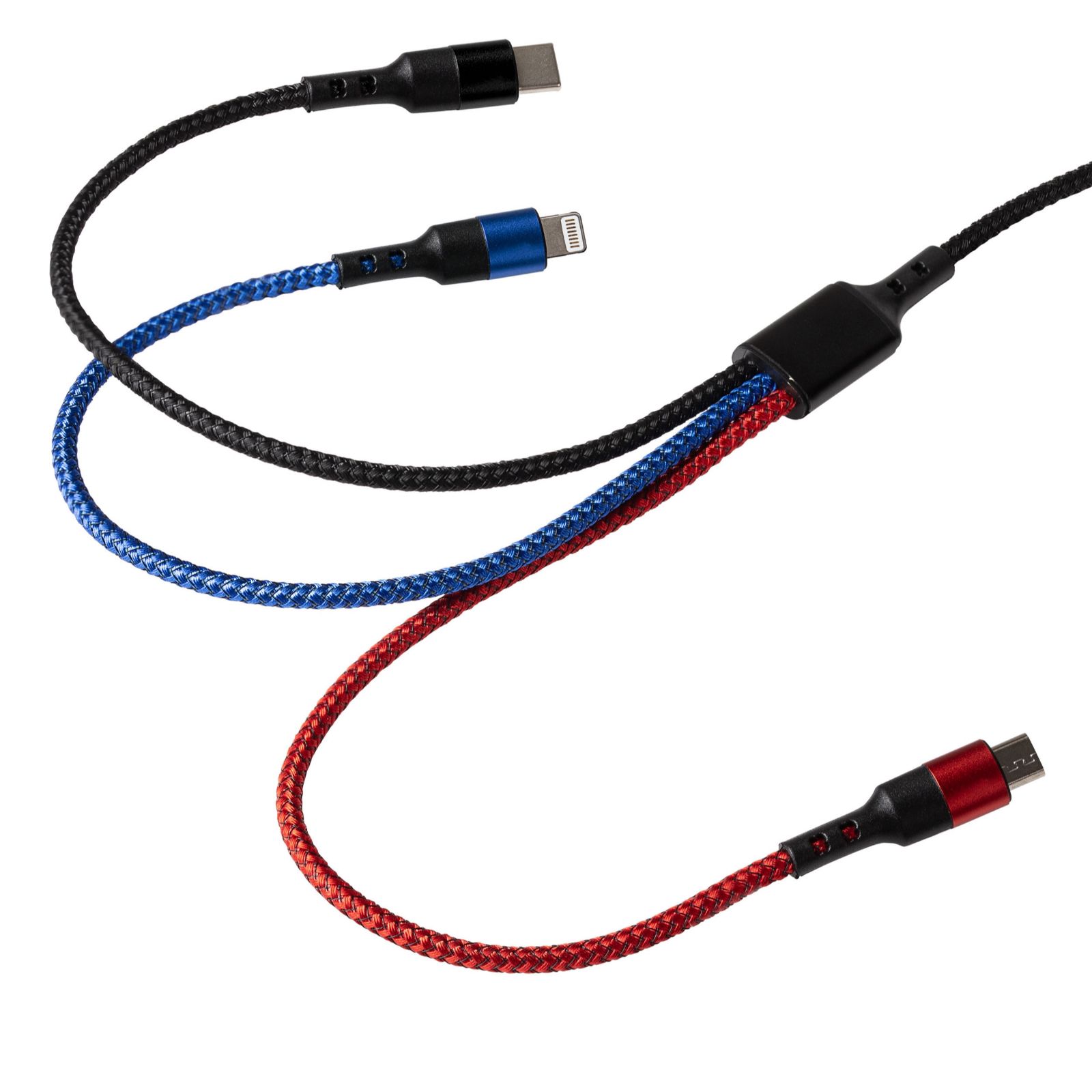 3-in-1 braided cable: USB-C, Lightning, Micro USB outputs
