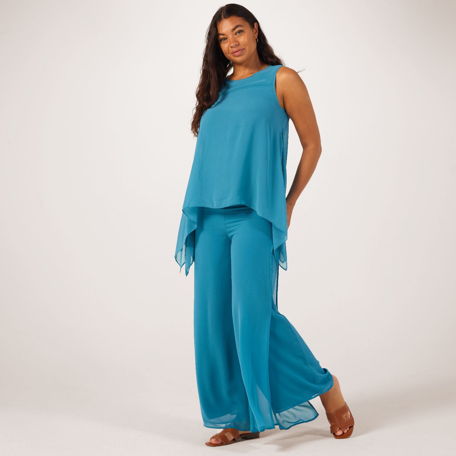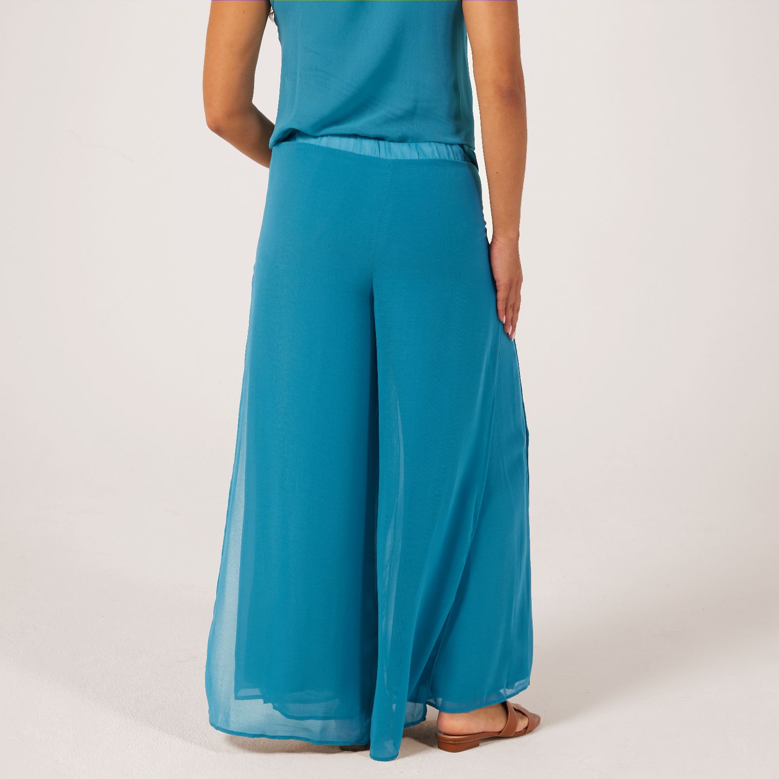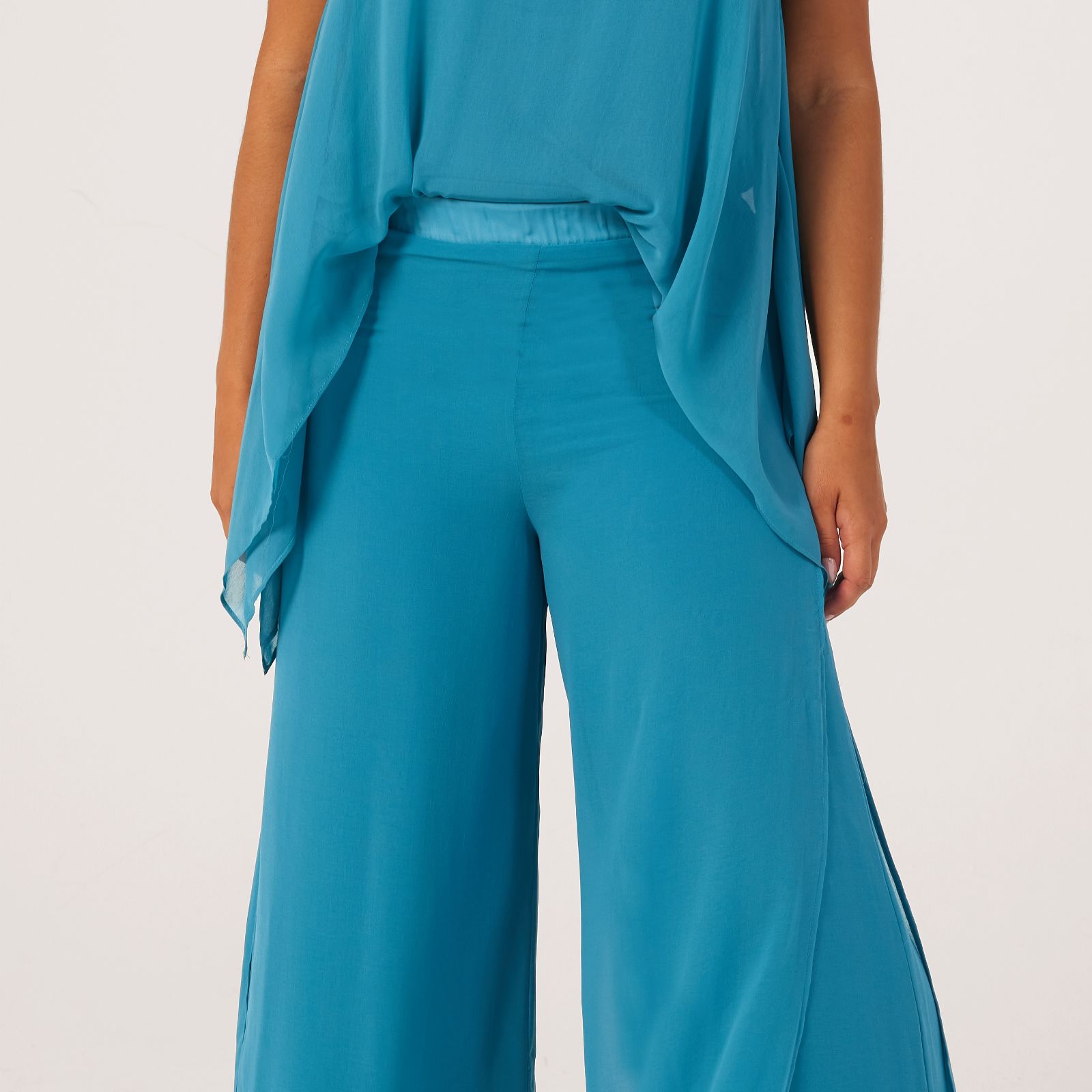 Step into elegance with the WynneLayers chiffon overlay trousers, a striking blend of style and comfort. These wide-leg trousers feature a semi-sheer overlay with high side slits, creating a dramatic look that is perfect for both day and evening wear. The elasticated waist ensures a comfortable fit, while the fully lined wide leg design ensures a beatiful drape. Ideal for special occasions or a chic everyday outfit, these trousers can be paired with a fitted top and heels for an effortlessly polished look.