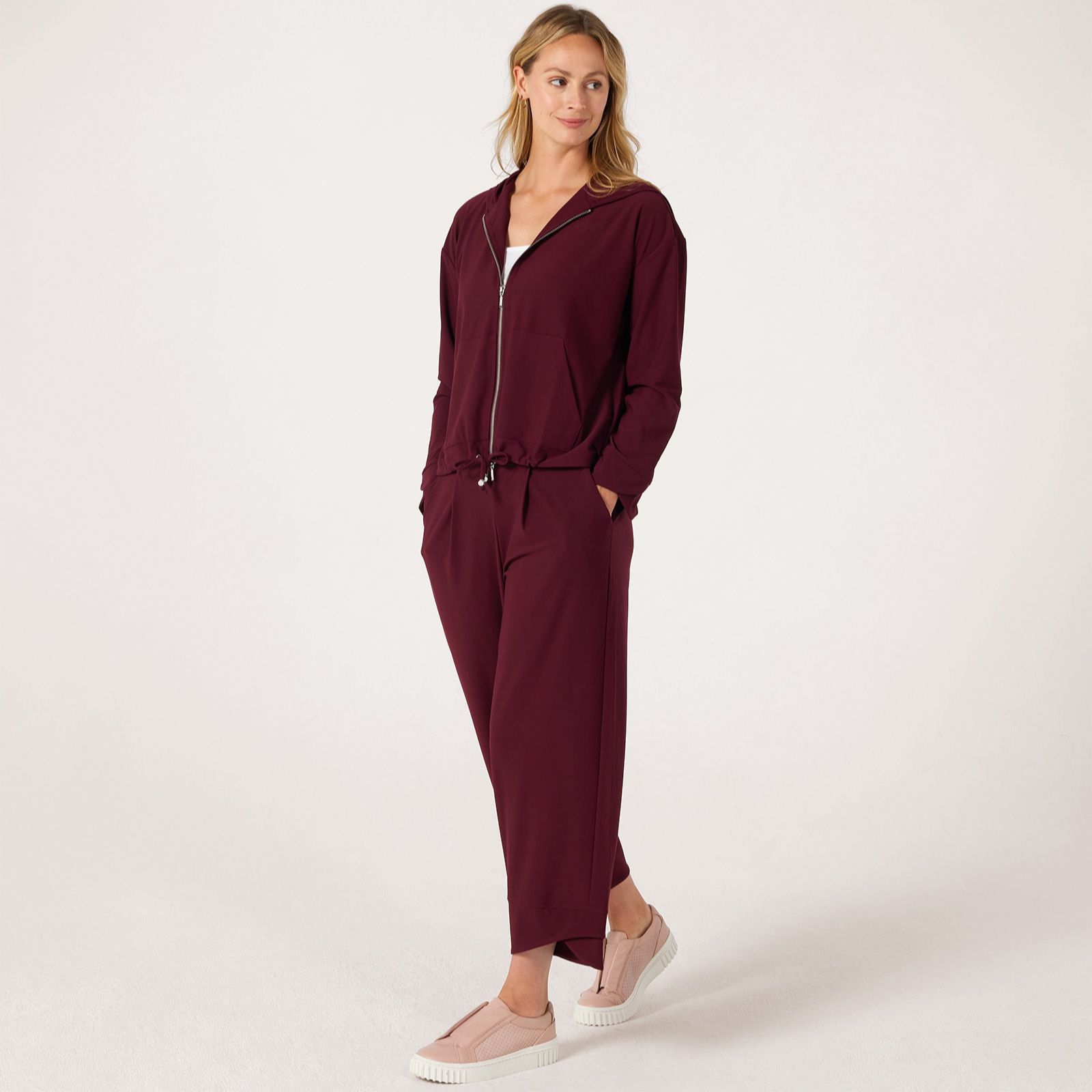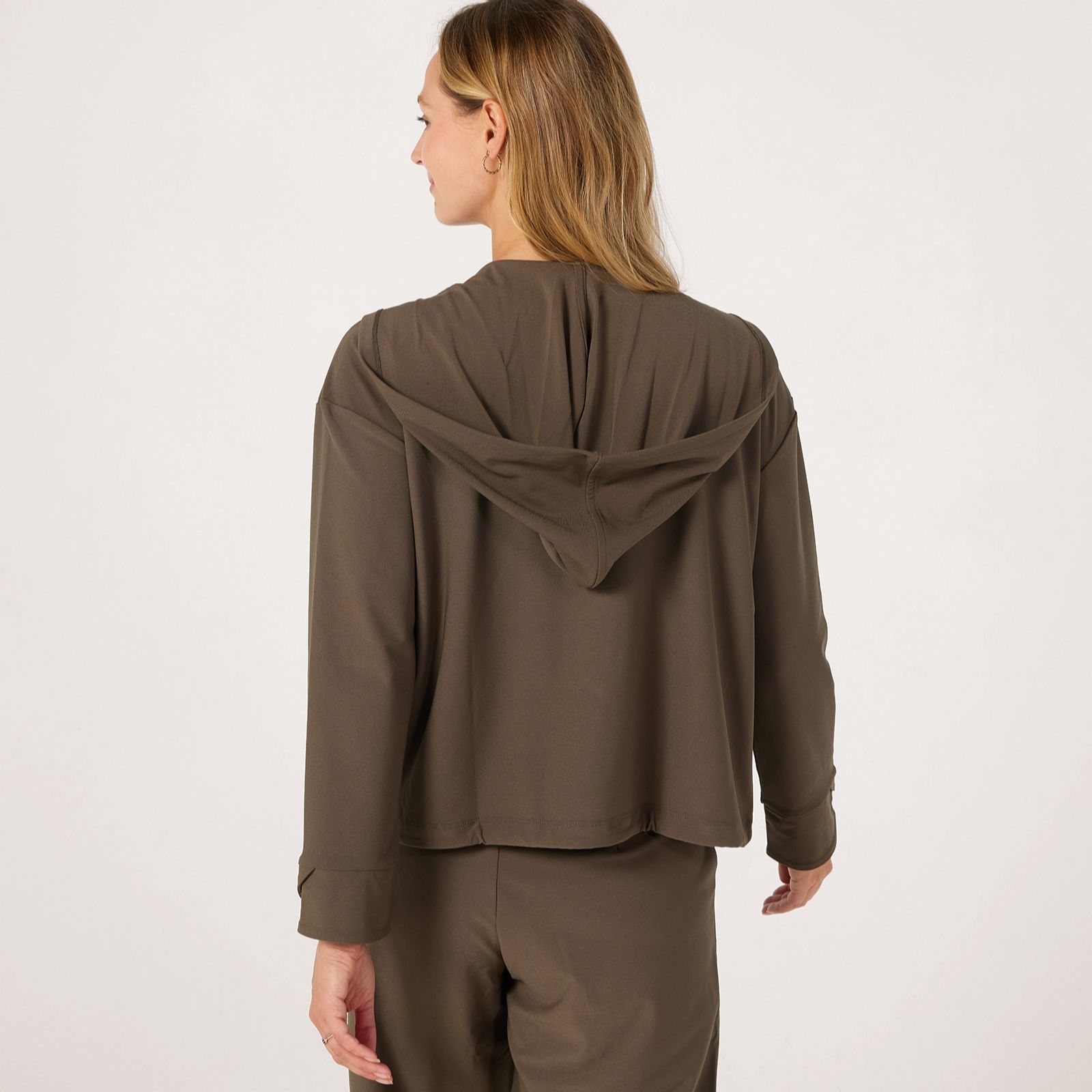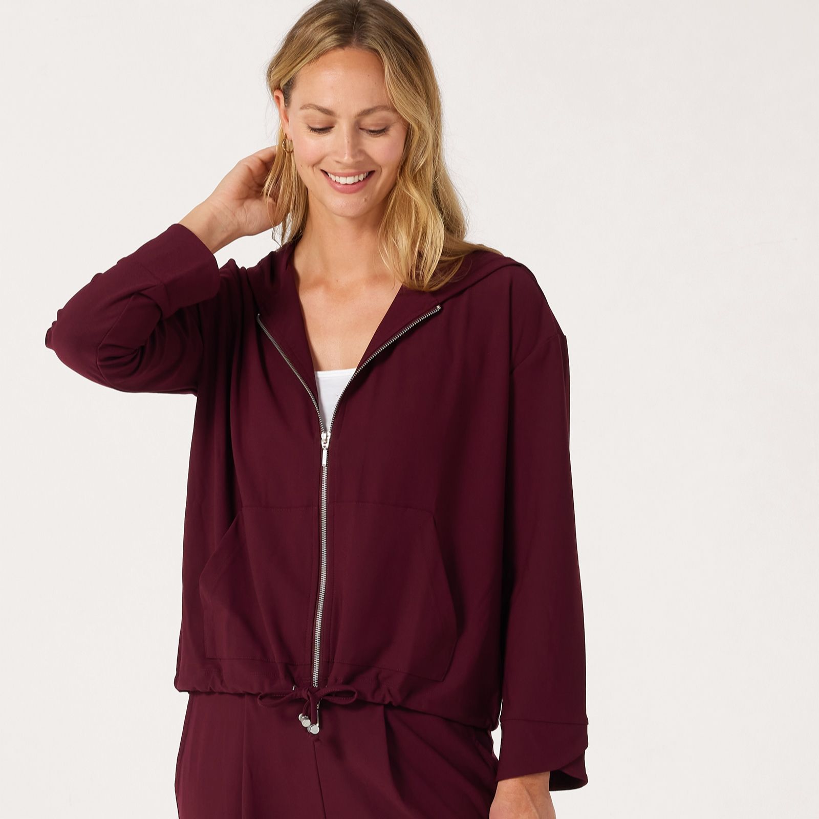 Bring a touch of laid-back luxury to your wardrobe with the luxe crepe hoodie from MarlaWynne Collection. Designed with a relaxed fit, this hoodie features a two-way zip front, practical patch pockets, and a hood for extra comfort, while the petal hem on the sleeves and drawstring waist add a stylish twist. Perfect for layering over your favourite outfits, it's ideal for off-duty days, travel, or casual meet-ups. Try pairing it with tailored trousers or leggings for a modern, effortless look.