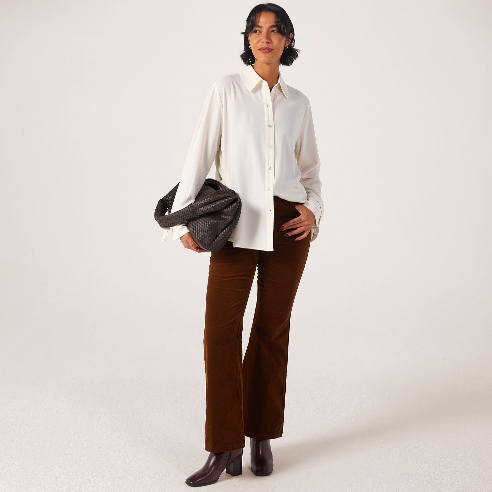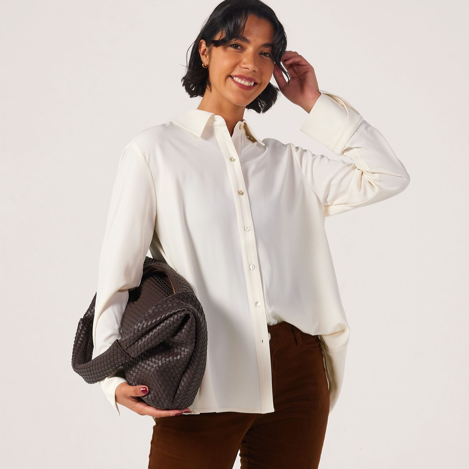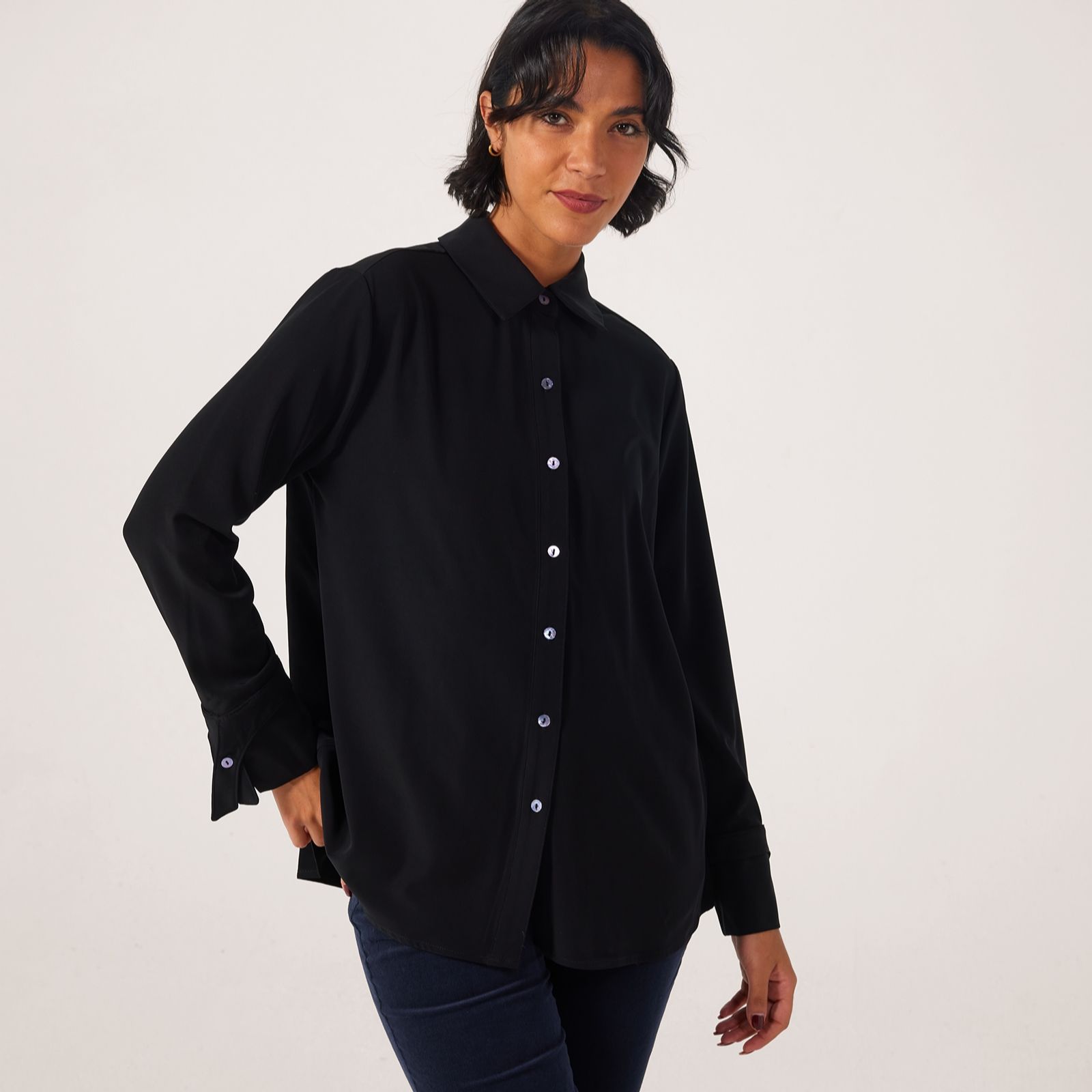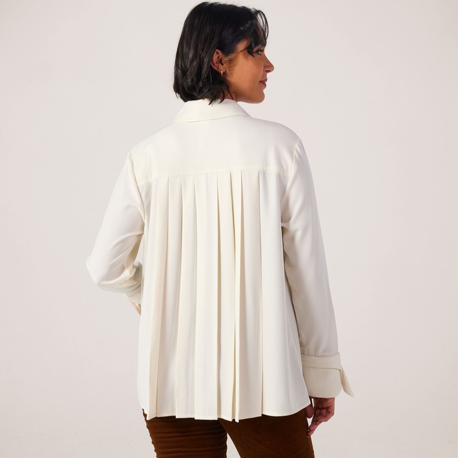 Indulge in a graceful blend of modern elegance with timeless tailoring with the Pleat Back Crepe Shirt from the MarlaWynne Collection. Its loose fit and pleated back detail offer effortless movement, while the shirt collar and cuff accents create a refined silhouette perfect for both office meetings and weekend brunches. For a chic look, pair this versatile shirt with tailored trousers or layer over slim-fit jeans.