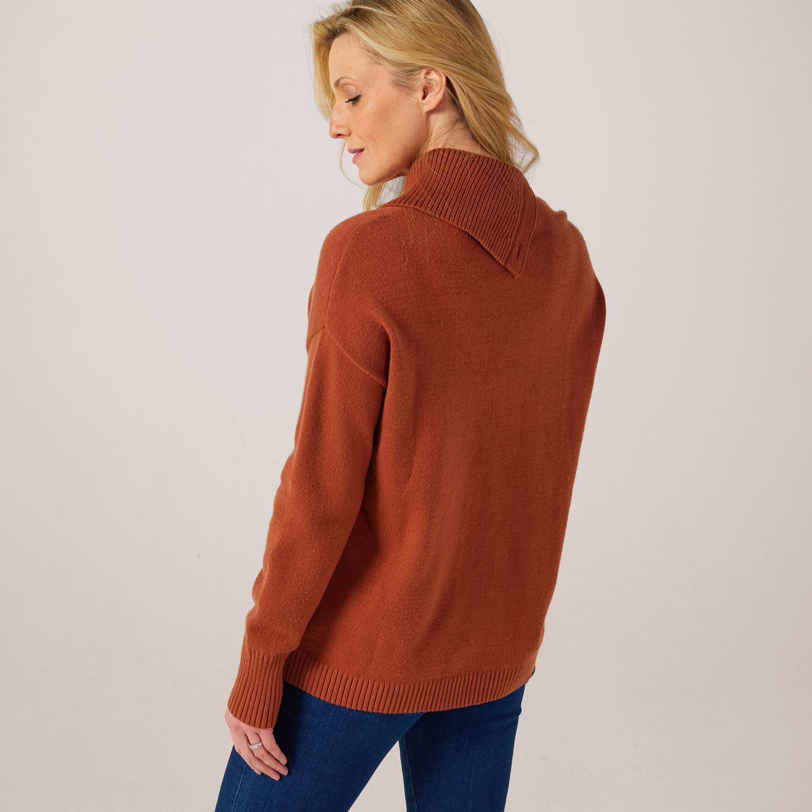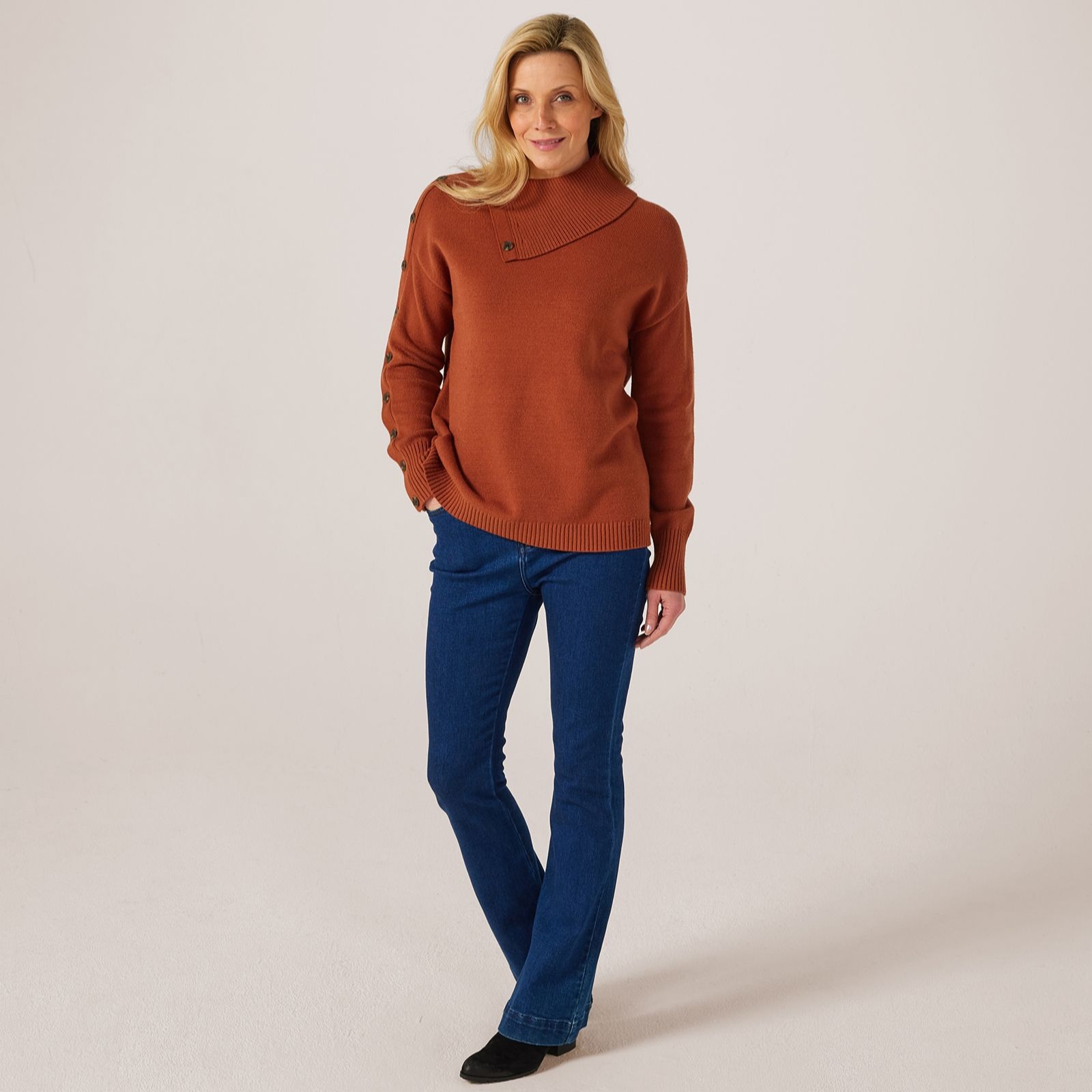 Indulge in the contemporary comfort of the MarlaWynne Collection SoftKnit jumper with buttons. This loose-fitting knit jumper features a chic high neck and long sleeves, accented by elegant button details on the side placket. Ideal for layering or wearing solo, it effortlessly transitions from casual day outings to cosy evenings at home. Pair it with your favourite jeans or a sleek skirt for a versatile look thats both sophisticated and relaxed.