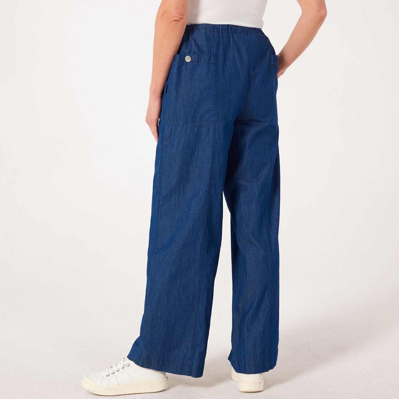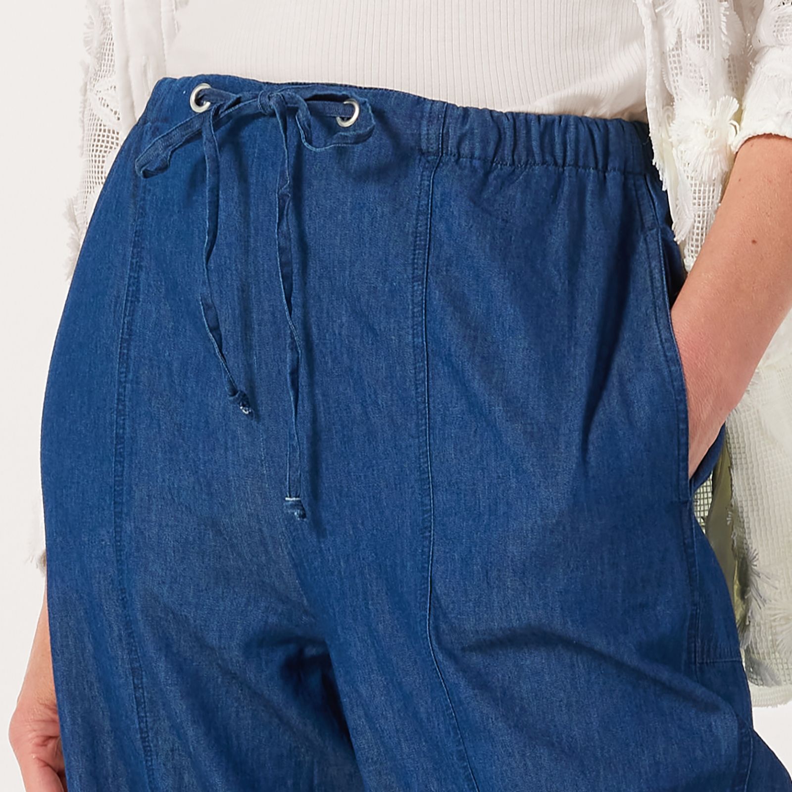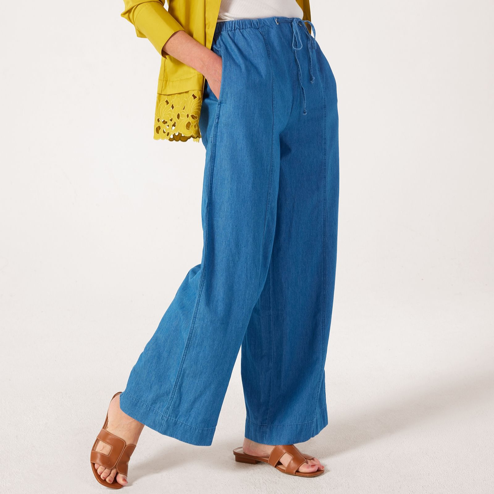 Step out in style with the MarlaWynne Denim Wide Drawstring Trousers. These chic trousers feature a wide leg design and a comfortable elasticated waist with a drawstring for a perfect fit. The on-seam pockets and back patch pockets with snaps add practicality, while the front and back princess seams create a sleek silhouette. Ideal for both casual outings and relaxed weekends, these versatile trousers can be paired with a simple T-shirt or a cosy jumper for an effortlessly stylish look.