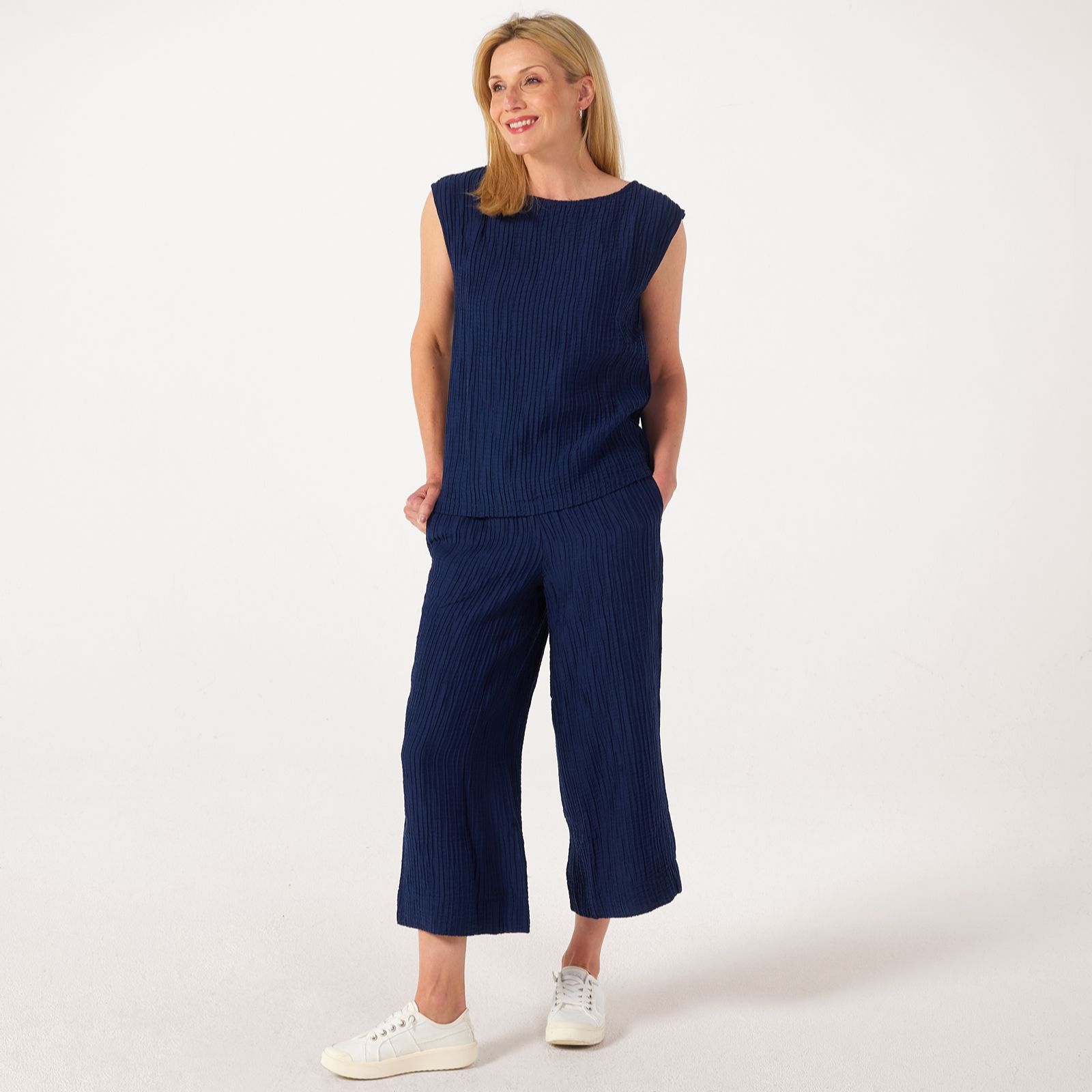 Discover effortless elegance with the MarlaWynne Textured Crinkle Fabric Shell Sleeveless Top. This chic and versatile piece features a loose-fitting design with a stylish bateau neckline and cap sleeves, perfect for warm weather or layering under your favourite blazer. The textured crinkle fabric adds a unique touch to your wardrobe, ensuring you stand out on any occasion. Pair it with tailored trousers for a sophisticated look or with jeans for a casual day out.