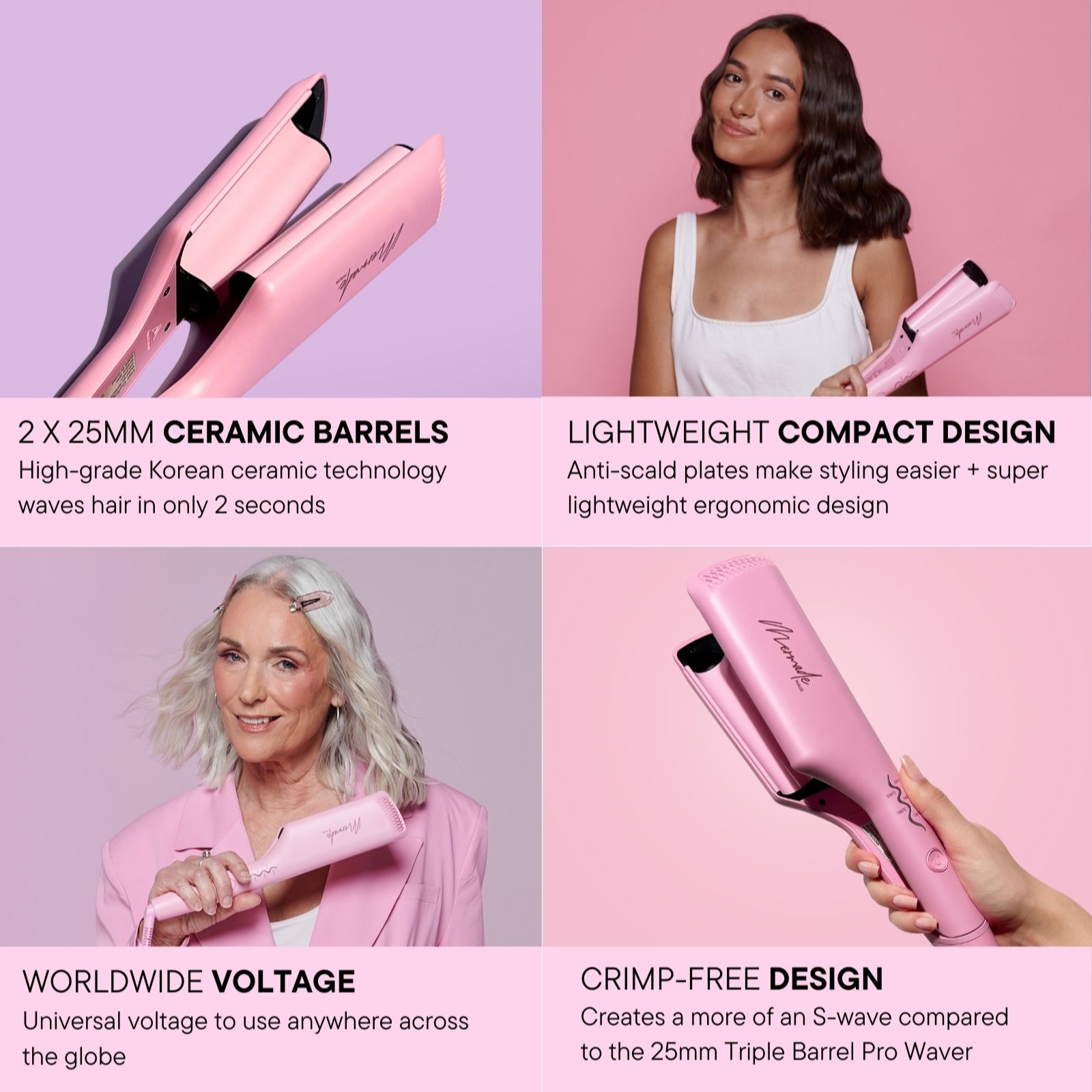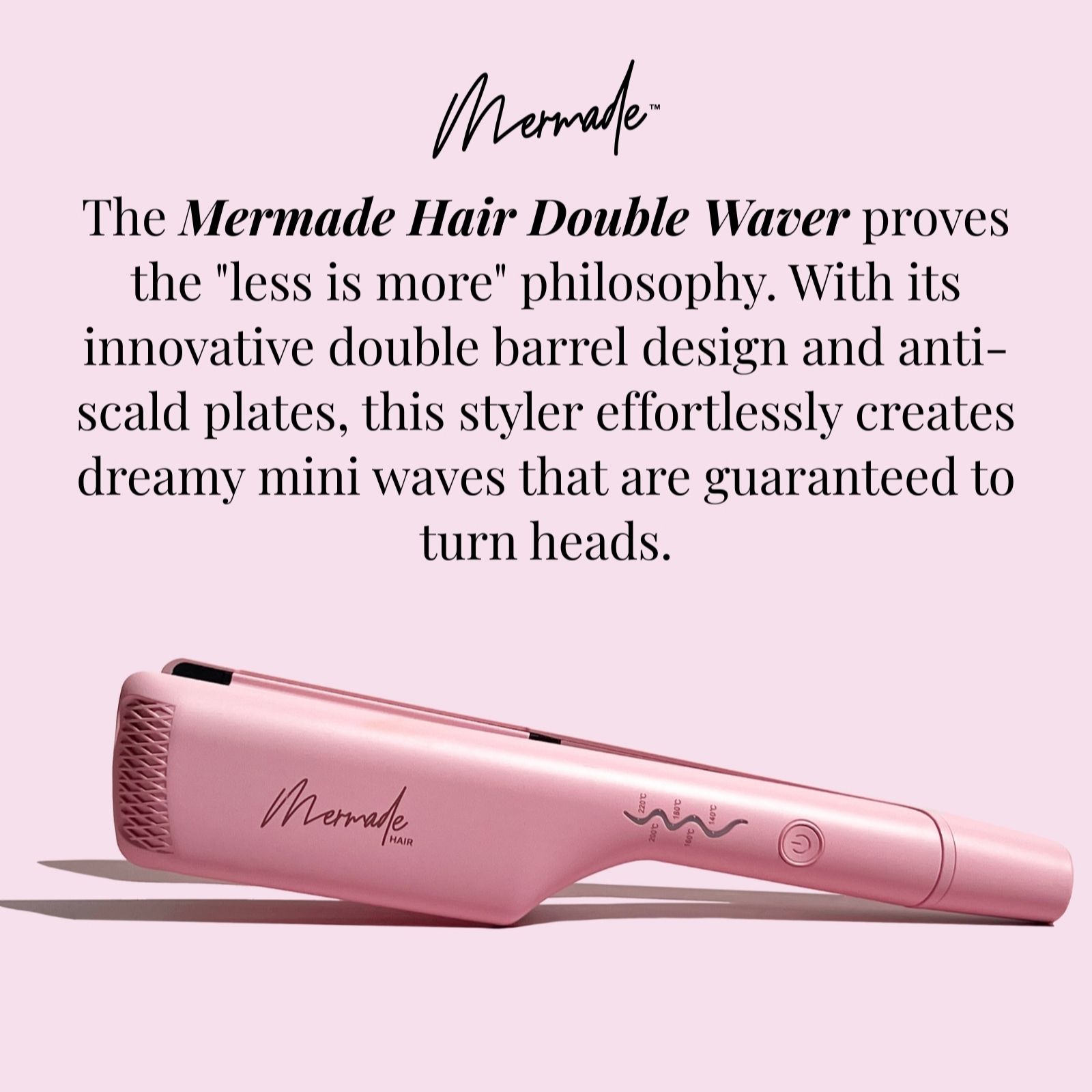 Create head-turning waves with the Mermade My Wave Kit. Featuring the lightweight Double Waver in pink, this travel-friendly styler helps you achieve soft, s-shaped waves in seconds with advanced heat technology and ionic ceramic plates. Complete with grip clips for easy sectioning and a stylish travel bag, this set is perfect for quick styling sessions at home or on the go.