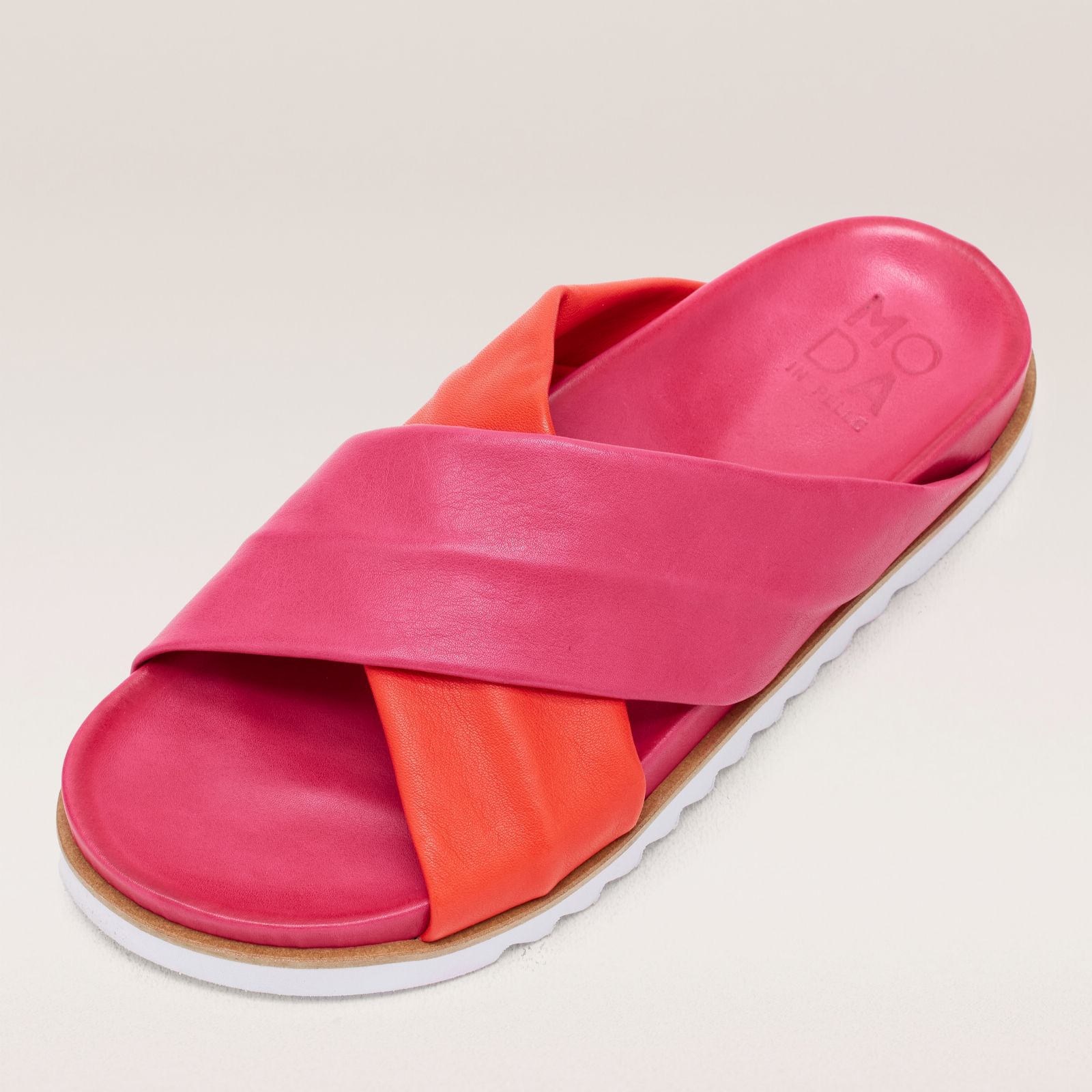 Slip into easy sophistication with the Moda in Pelle Jessa Leather Slide Sandals, where timeless design meets modern comfort. Featuring a tubular crossover footbed, these slip-on sandals are a perfect companion for leisurely strolls or casual lunches. Their versatile style easily complements a wide range of outfits, from breezy summer dresses to your favourite jeans.