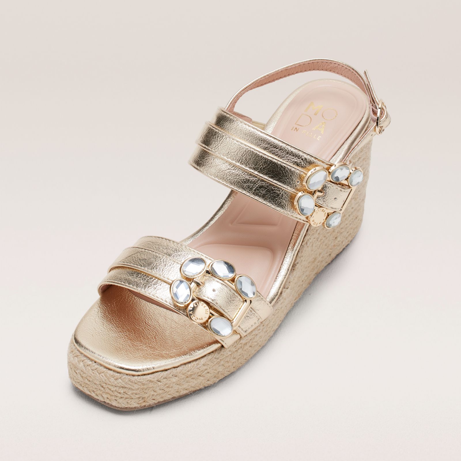 Glam up your footwear collection with the Moya wedge sandals from Moda in Pelle, designed to bring effortless sophistication to your summer looks. Featuring a chic semi-precious buckle and a high wedge heel, they offer both style and comfort for daytime strolls or evening outings. Pair these wedge sandals with a flowing maxi dress or tailored trousers for a polished, feminine finish.