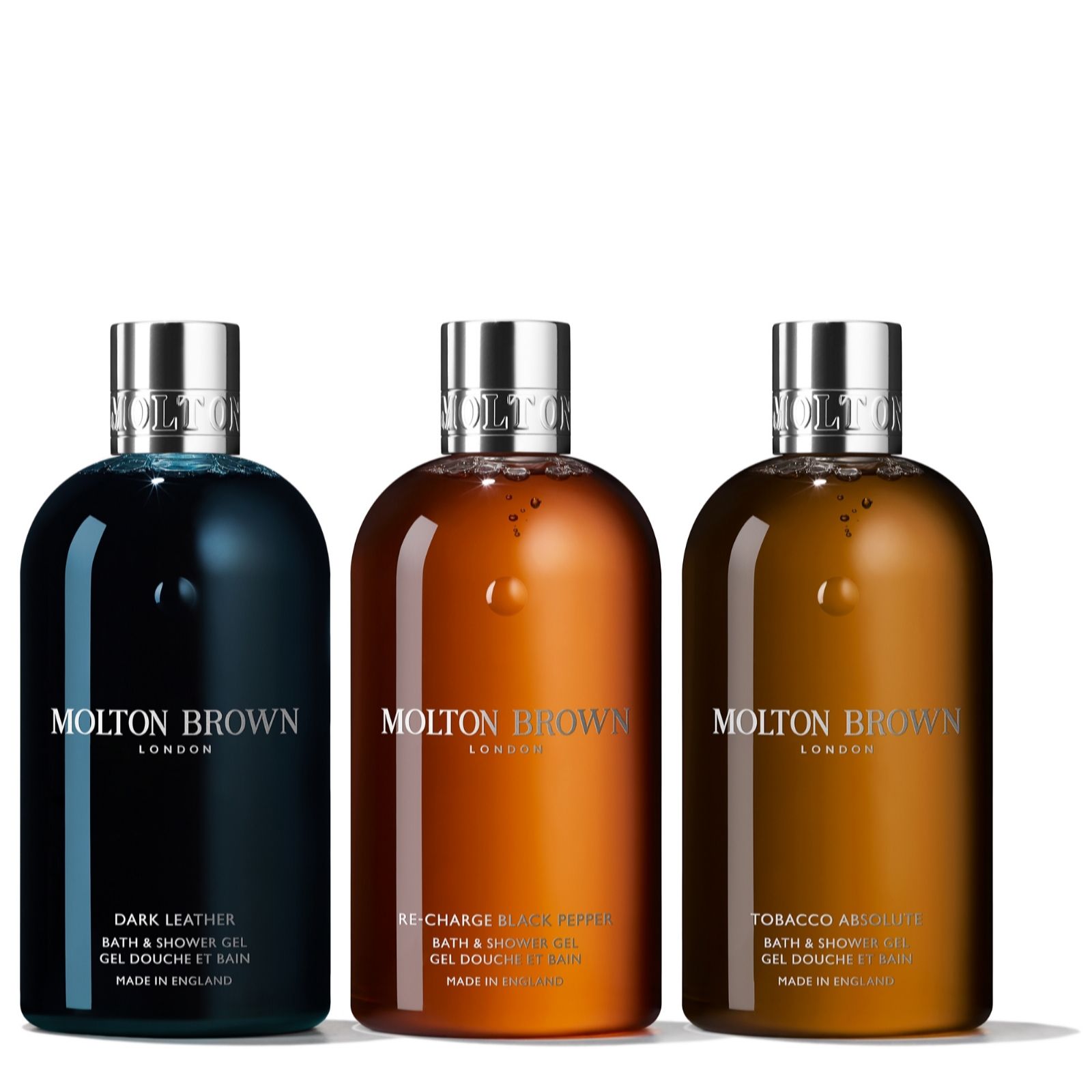 Discover a world of refined fragrance with the Molton Brown Mens Body Wash Trio, featuring three distinctive bath and shower gels in Dark Leather, Re-charge Black Pepper and Tobacco Absolute. Perfect for elevating your daily routine or gifting, this collection helps to leave skin feeling refreshed while enveloping you in sophisticated, woody scents for any occasion.