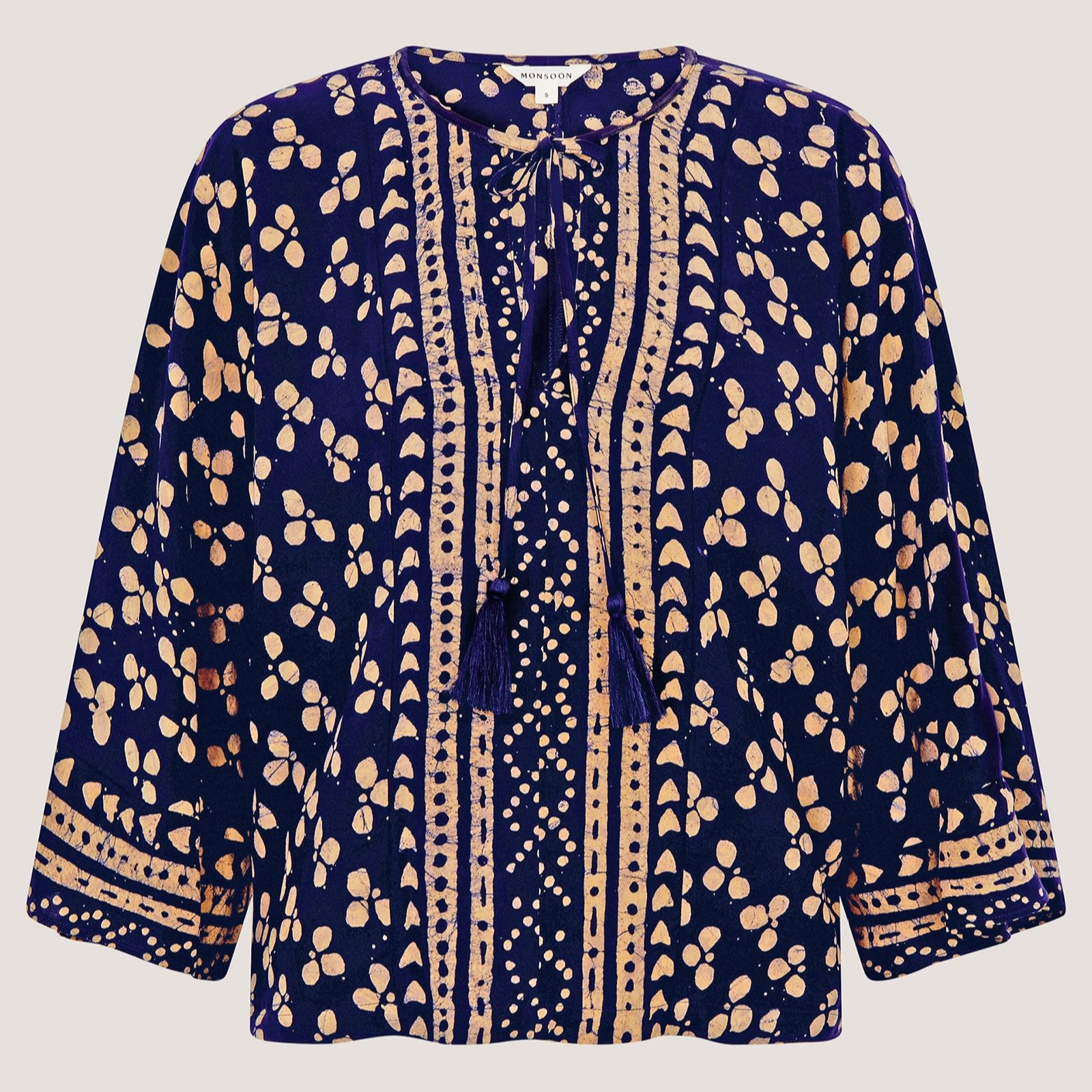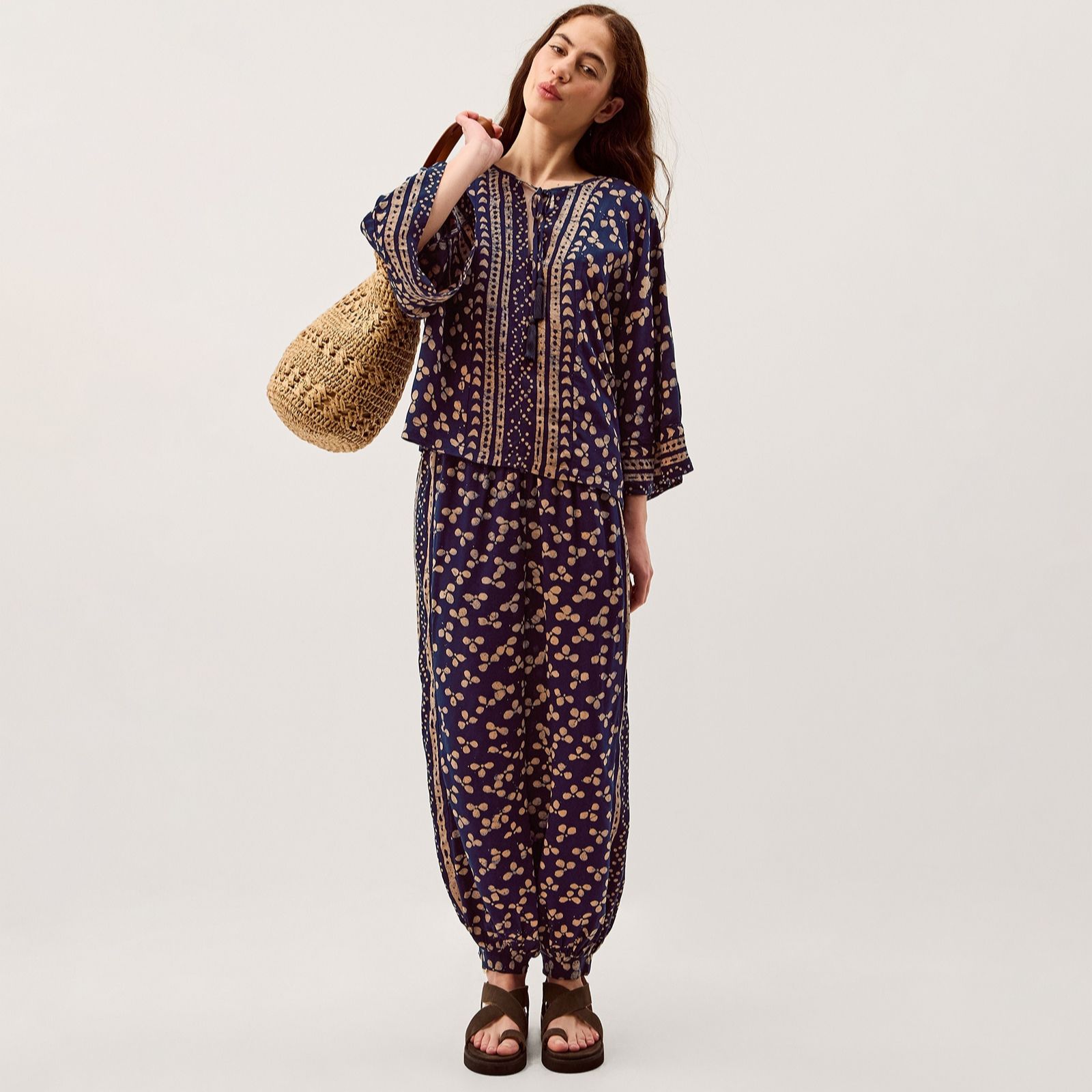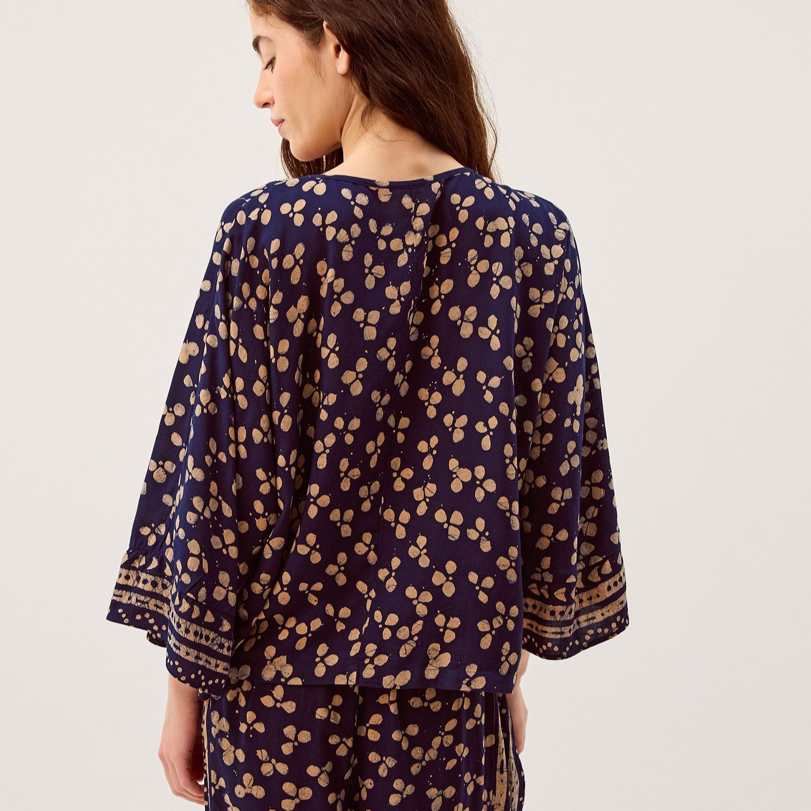 Answer the call of sun-soaked shores with the Clover Batik Print Top from Monsoon. Inspired by artisan design, this relaxed piece showcases a golden clover motif that shimmers against its breezy backdrop. The scoop neckline is finished with a playful tassel tie, while wide long sleeves lend a beautifully laidback feel. Perfect for beach strolls or sunset dinners, style it with linen trousers or the matching harem pants for an effortlessly coordinated look.