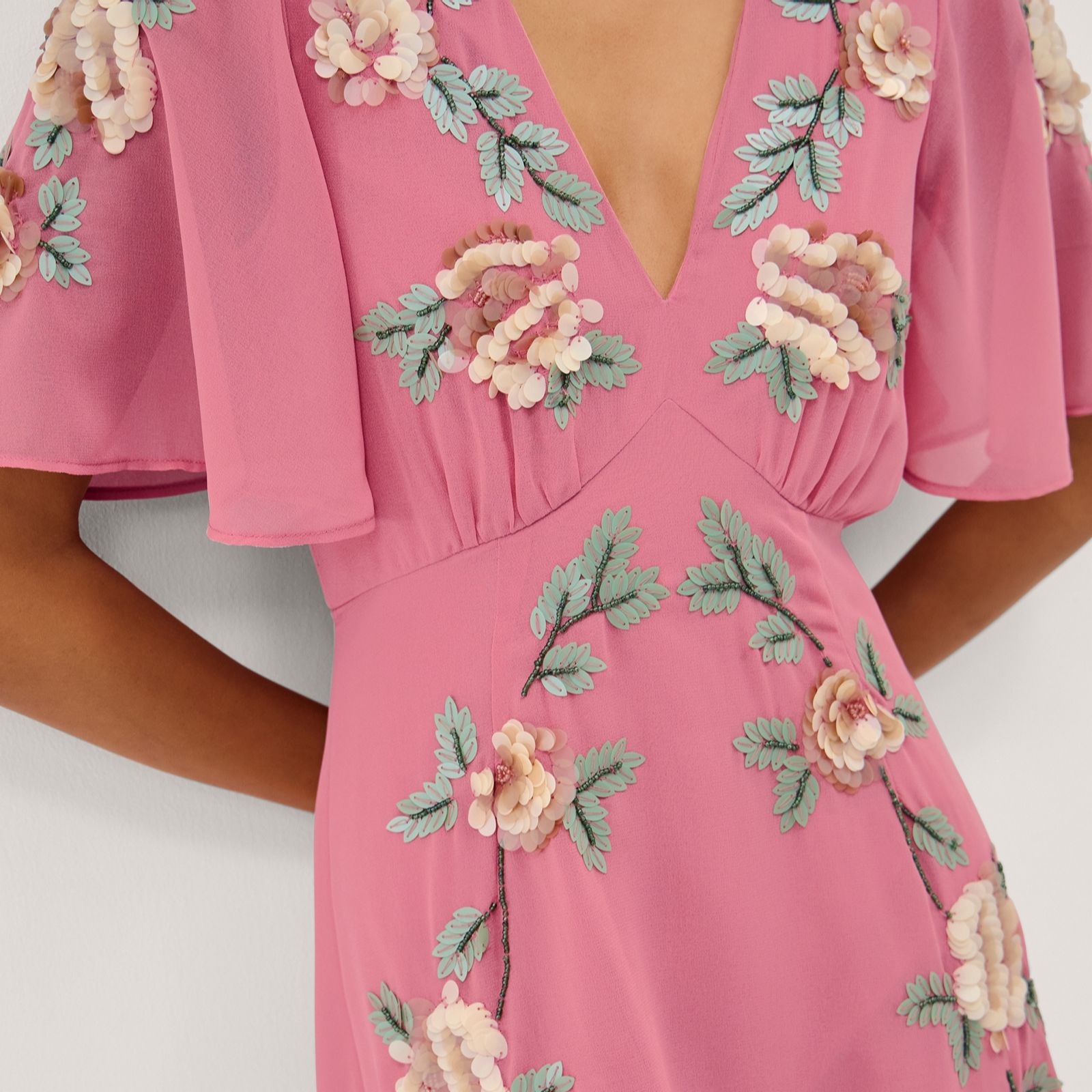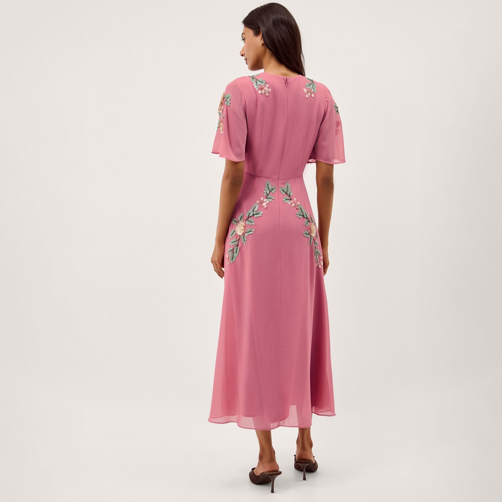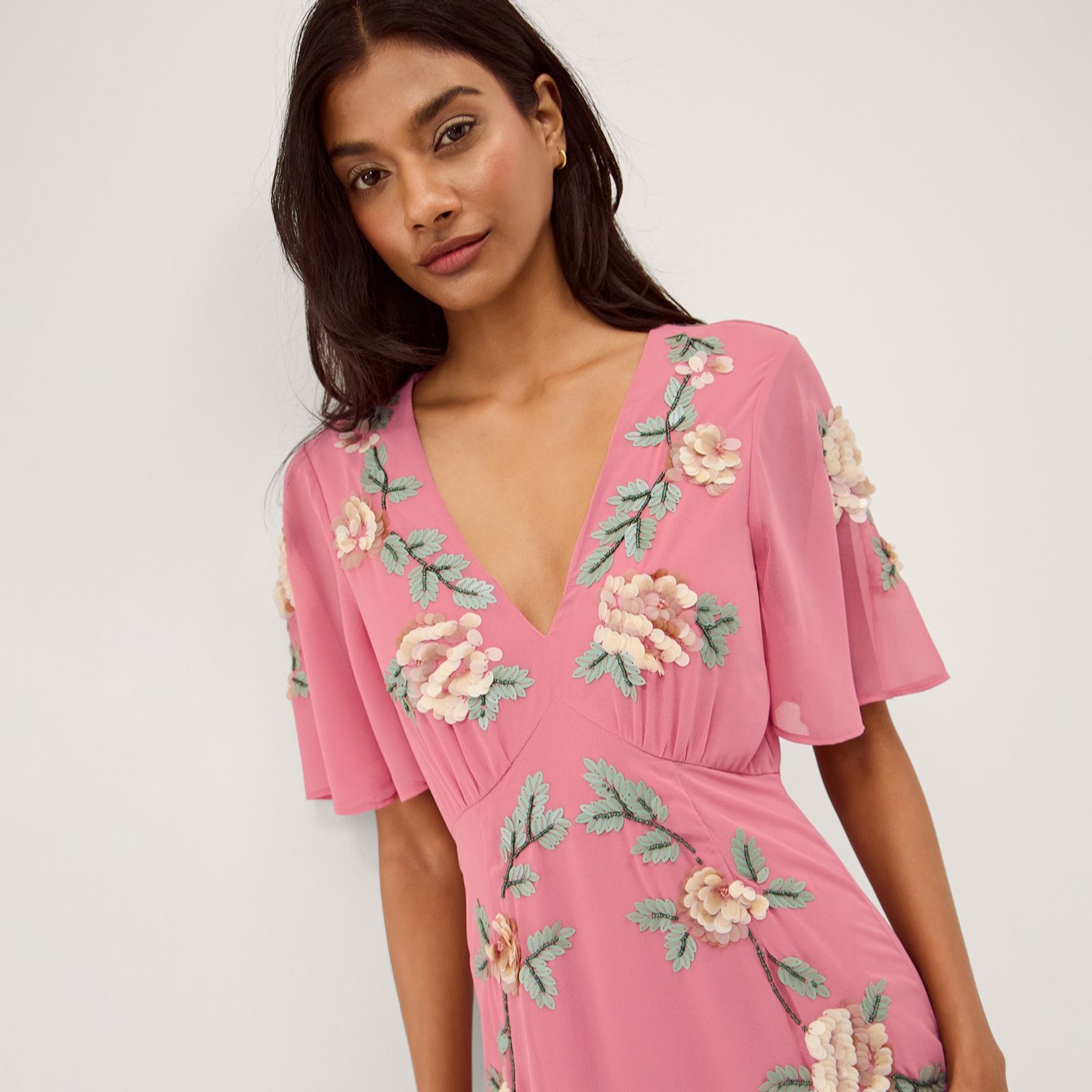 Swish into wedding season with the Cora embroidered dress from Monsoon, a pastel-hued beauty adorned with delicate neutral-tone florals for a touch of rustic romance. Its floaty midi length, gentle pleating through the bodice and gauzy angel sleeves make it perfect for garden parties, outdoor ceremonies and refined soirees alike. Pair this dress with strappy heels and a clutch for a timeless, graceful look.