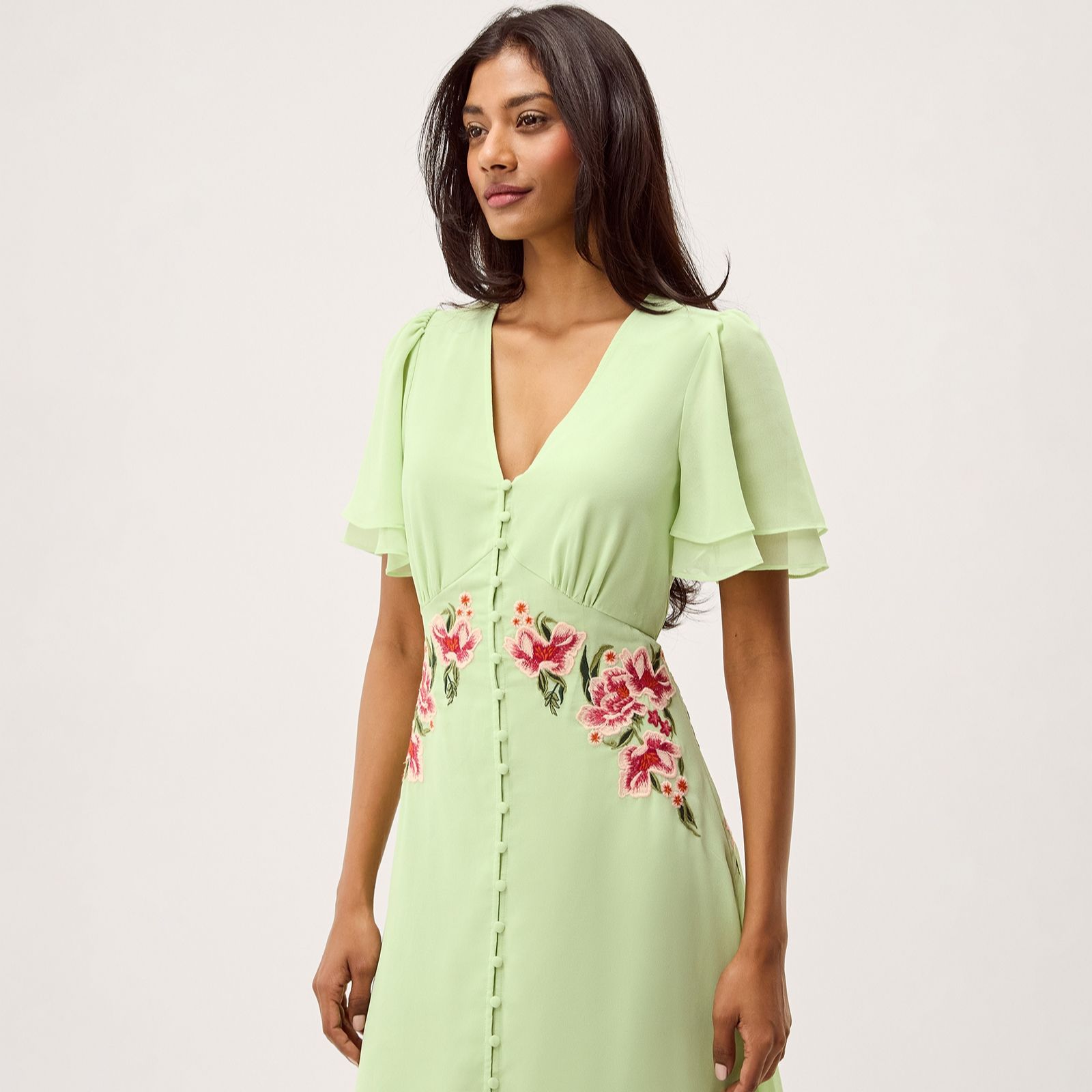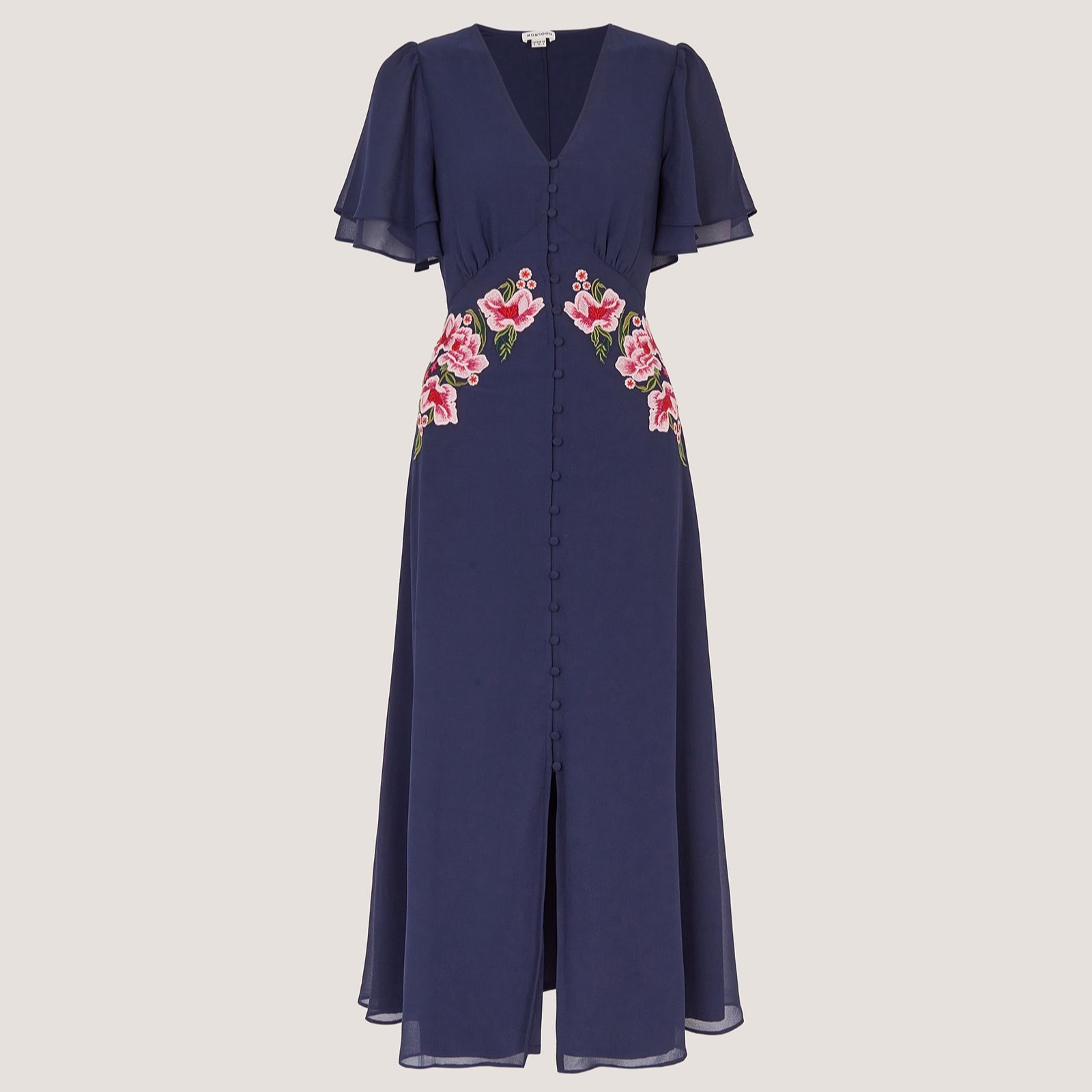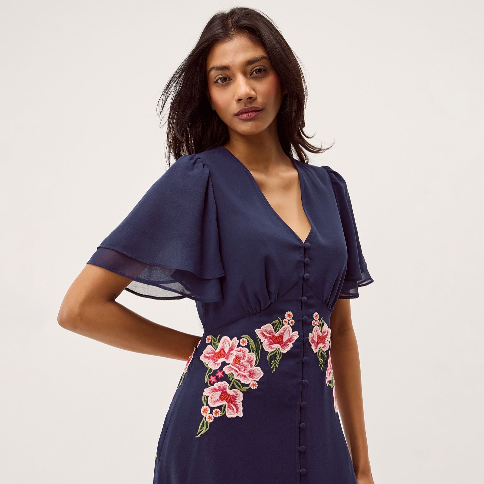 Feel as elegant as a fairy in the Coraline embroidered dress from Monsoon, where delicate blooms cascade down the bodice for a truly enchanting look. Perfect for wedding guest season, garden parties or special evening occasions, this dress's short flutter sleeves and graceful button detailing beneath a V-neckline add romantic charm. Pair it with golden accessories and heels for a polished outfit that's sure to turn heads.