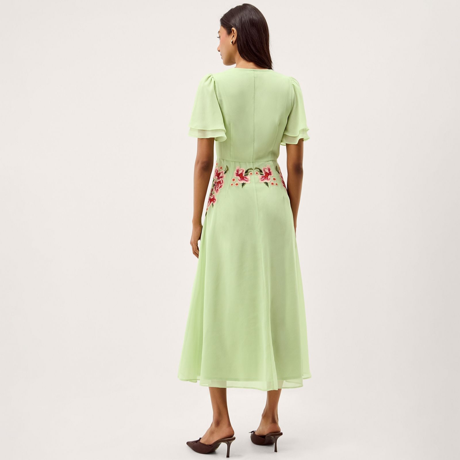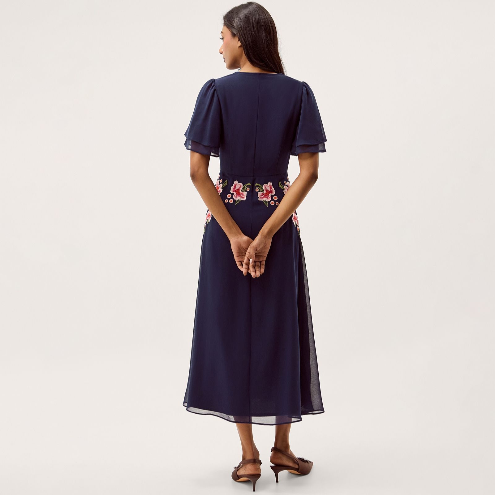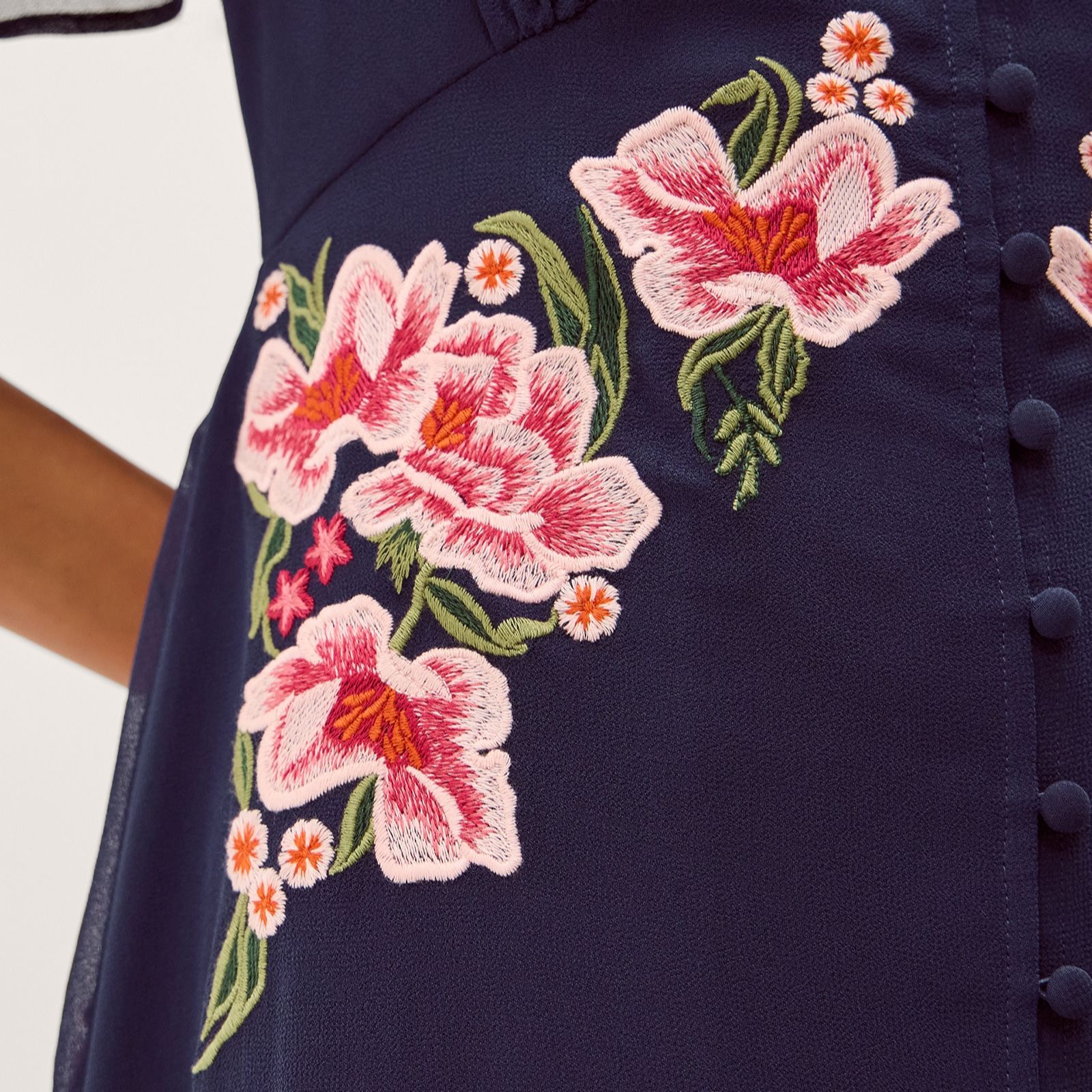 Feel as elegant as a fairy in the Coraline embroidered dress from Monsoon, where delicate blooms cascade down the bodice for a truly enchanting look. Perfect for wedding guest season, garden parties or special evening occasions, this dress's short flutter sleeves and graceful button detailing beneath a V-neckline add romantic charm. Pair it with golden accessories and heels for a polished outfit that's sure to turn heads.