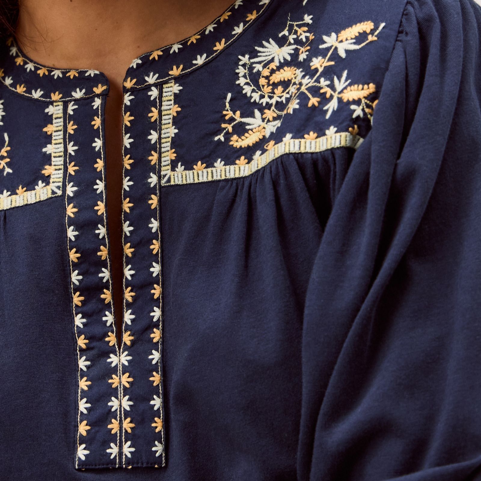 - Leaf embroidery along the collar, neckline and cuffs
