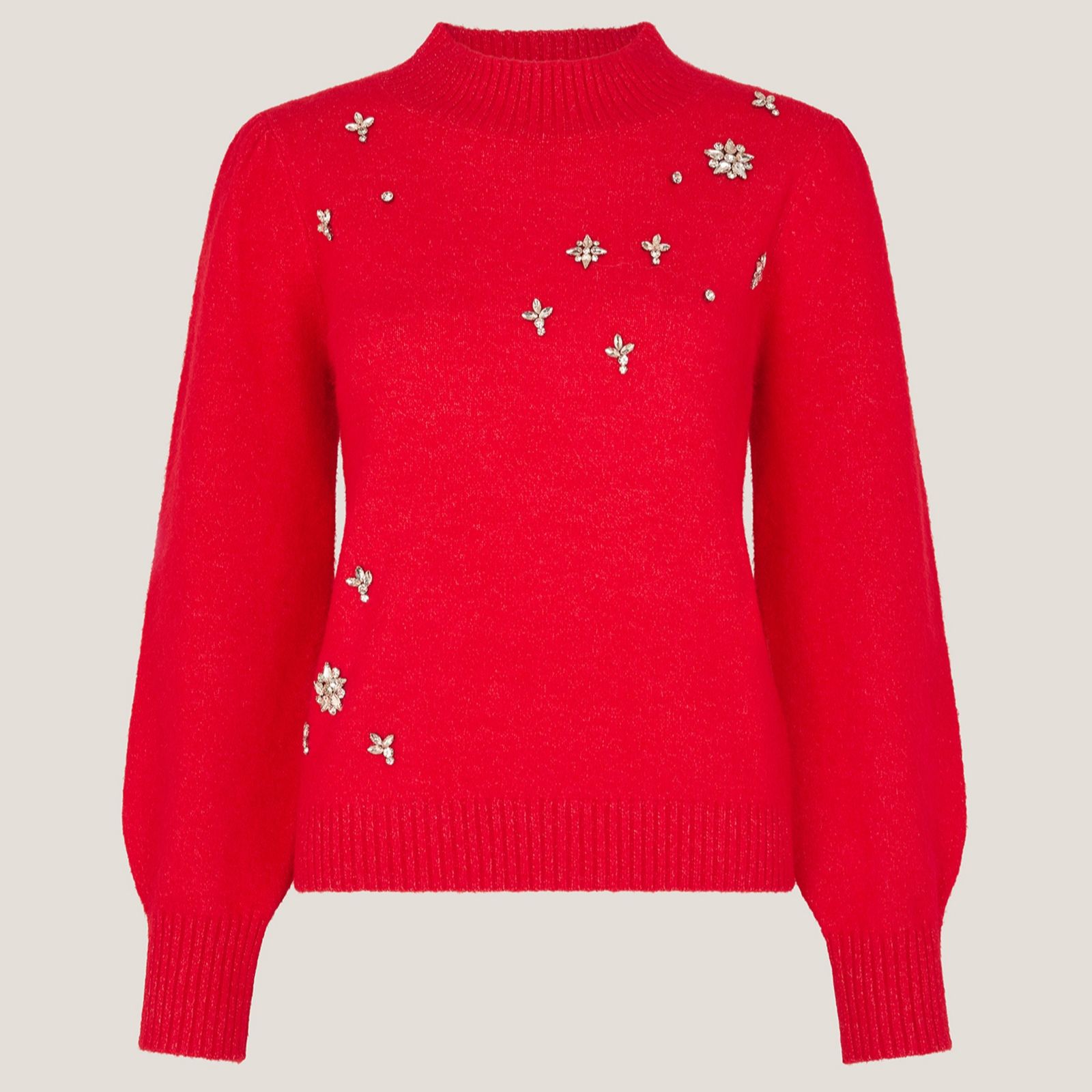 Meet your new festive go-to, the Erika embroidered jumper from Monsoon. Adorned with clusters of sparkling gemstones, it brings a touch of glamour to any occasion, whether you're adding a little shine to your weekday wardrobe or stepping out for exciting evening plans. Its chic high neck and pull-on design make it an easy choice for seasonal styling, and it pairs beautifully with tailored trousers or wide-leg jeans for a polished, party-ready look.