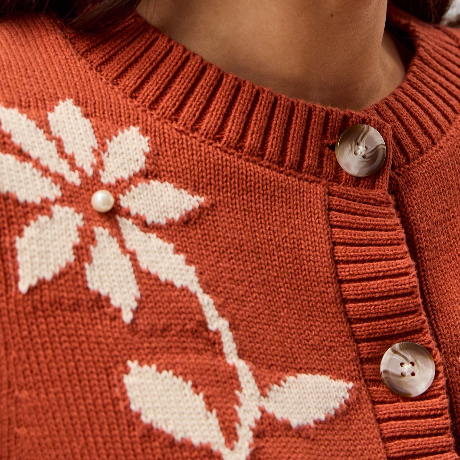 Features large floral pattern, marble-inspired buttons and faux pearl detailing