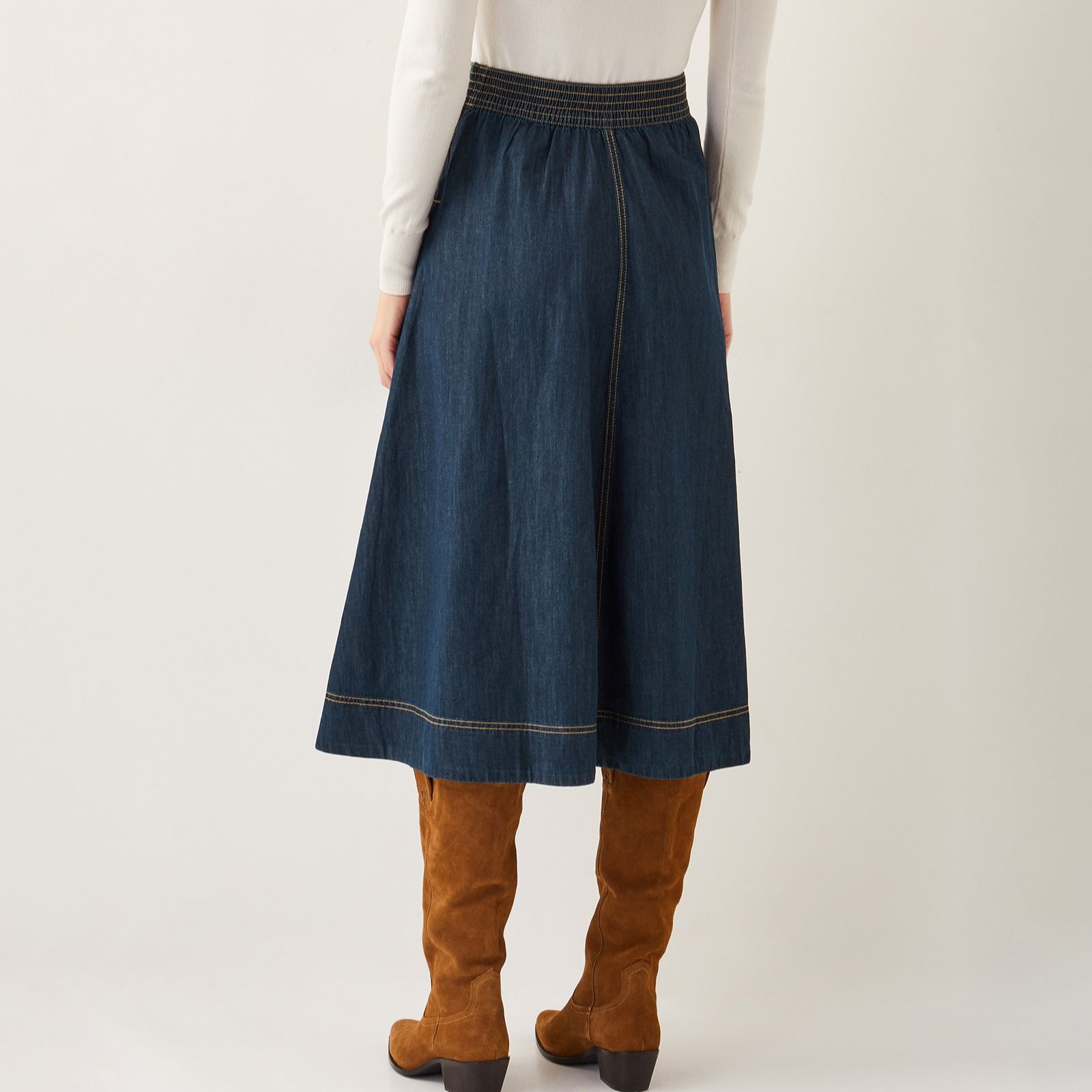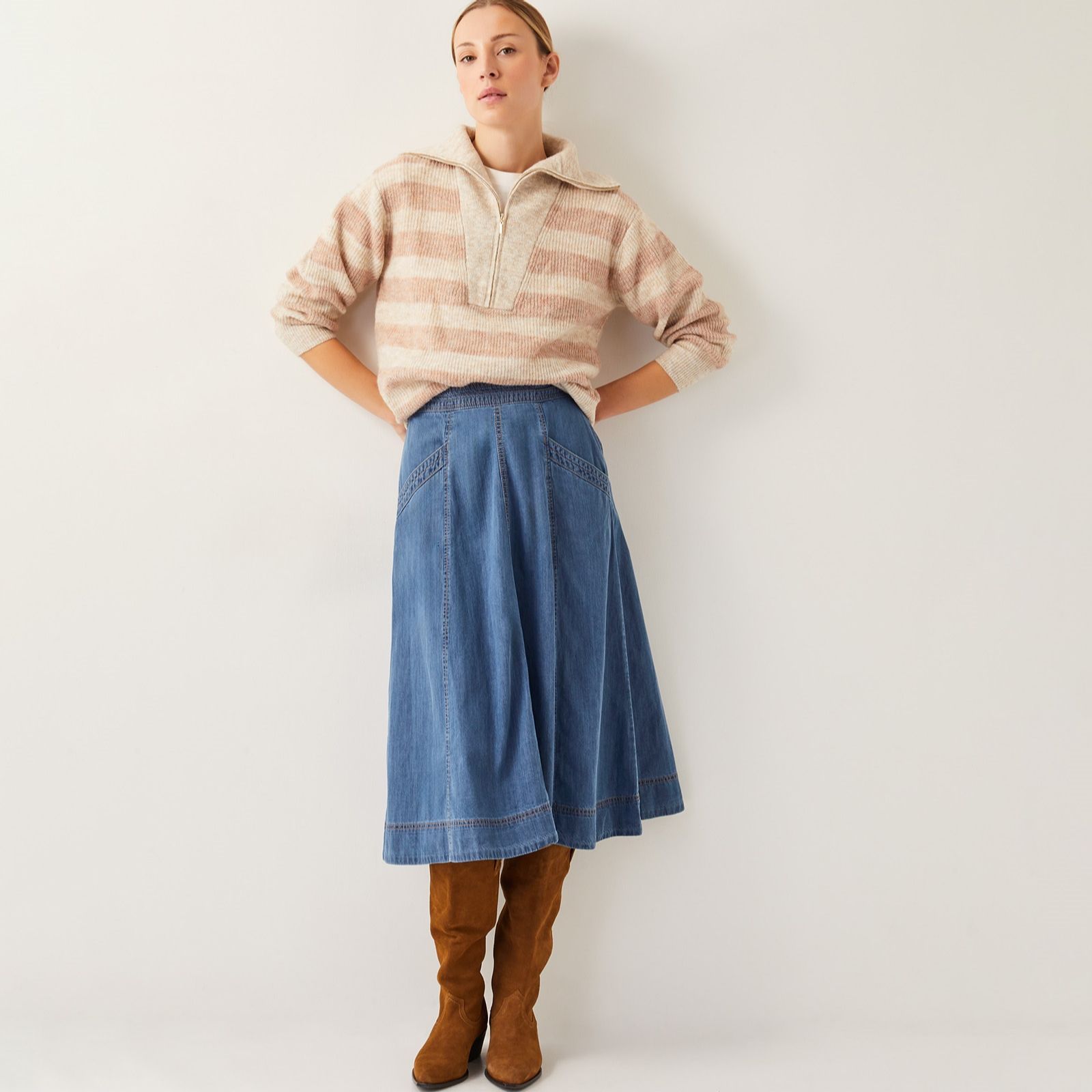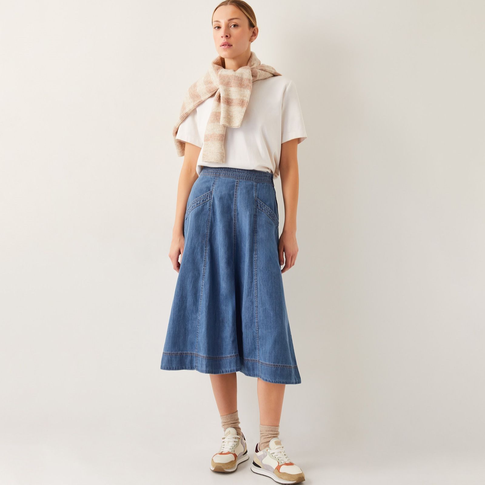 Introducing the Monsoon Harper denim skirt, a wardrobe staple that combines timeless style with modern flair. This midi-length skirt boasts an A-line cut with eye-catching tobacco stitching, perfect for adding a touch of sophistication to any outfit. The flared design and practical pockets make it a versatile piece that transitions seamlessly from summer to winter. Pair it with a top and sandals for a breezy summer look or with knee-high boots and a jumper for cosy winter style.