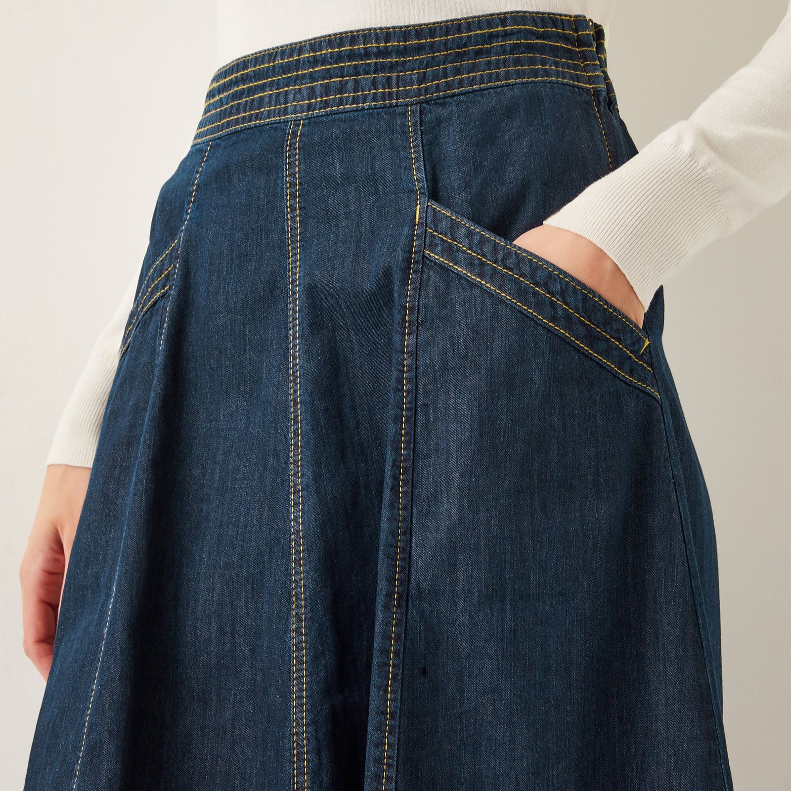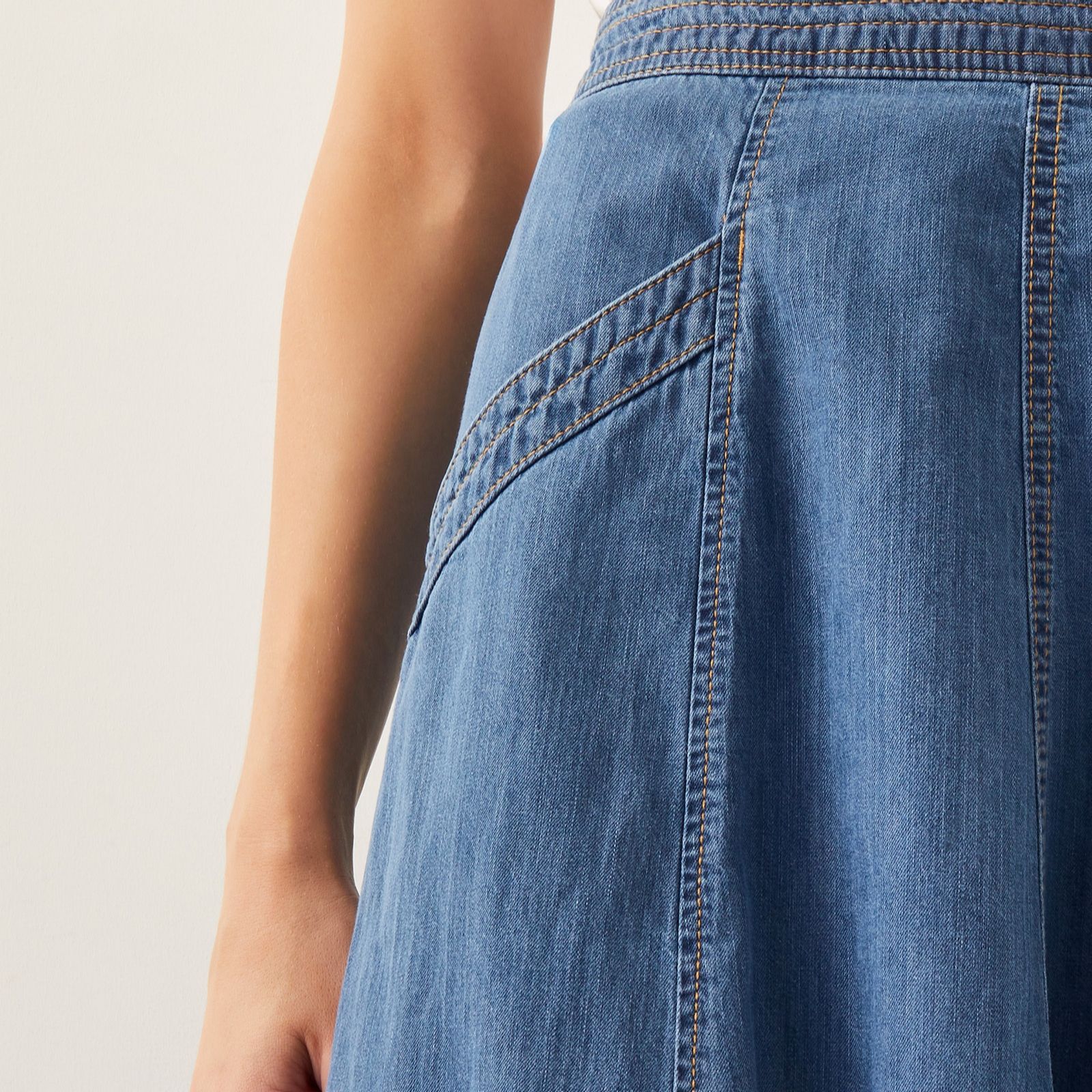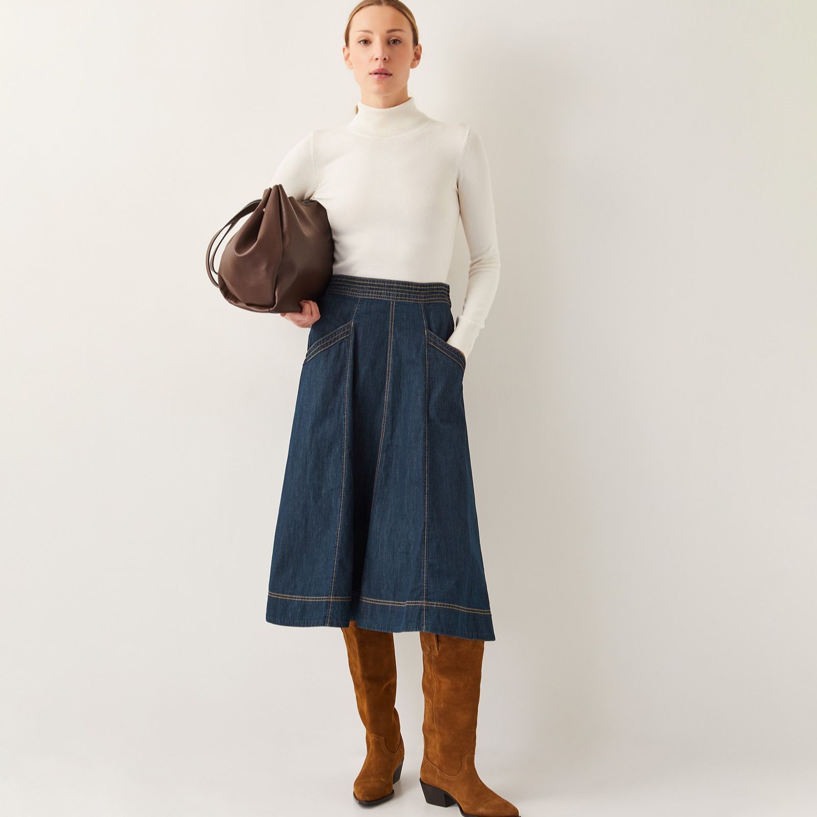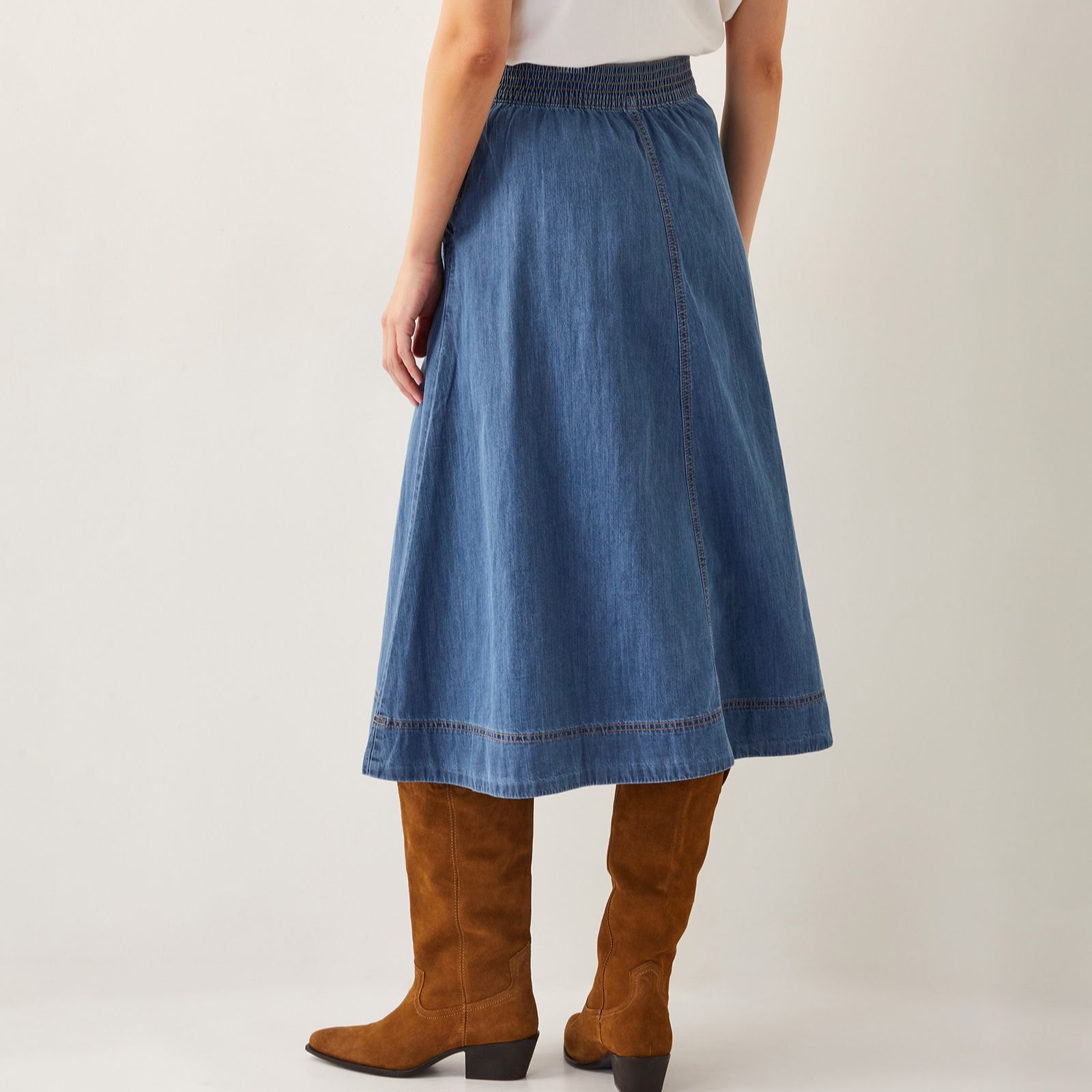 Introducing the Monsoon Harper denim skirt, a wardrobe staple that combines timeless style with modern flair. This midi-length skirt boasts an A-line cut with eye-catching tobacco stitching, perfect for adding a touch of sophistication to any outfit. The flared design and practical pockets make it a versatile piece that transitions seamlessly from summer to winter. Pair it with a top and sandals for a breezy summer look or with knee-high boots and a jumper for cosy winter style.