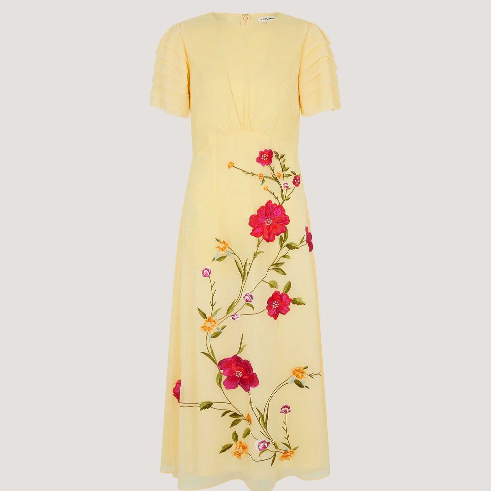 Step into timeless elegance with the Jocelyn embroidered dress from Monsoon, a beautifully fitted design adorned with vibrant floral embroidery that cascades across its mid-length skirt. Perfect for weddings, garden parties or special occasions, its pleated short sleeves and gathered bodice create a soft, feminine silhouette. Pair it with heels and delicate jewellery for a polished, graceful finish.