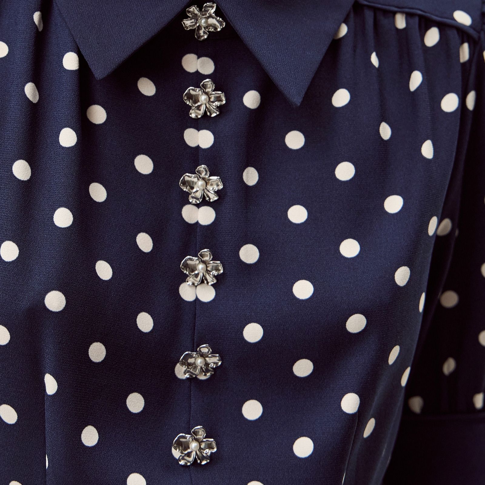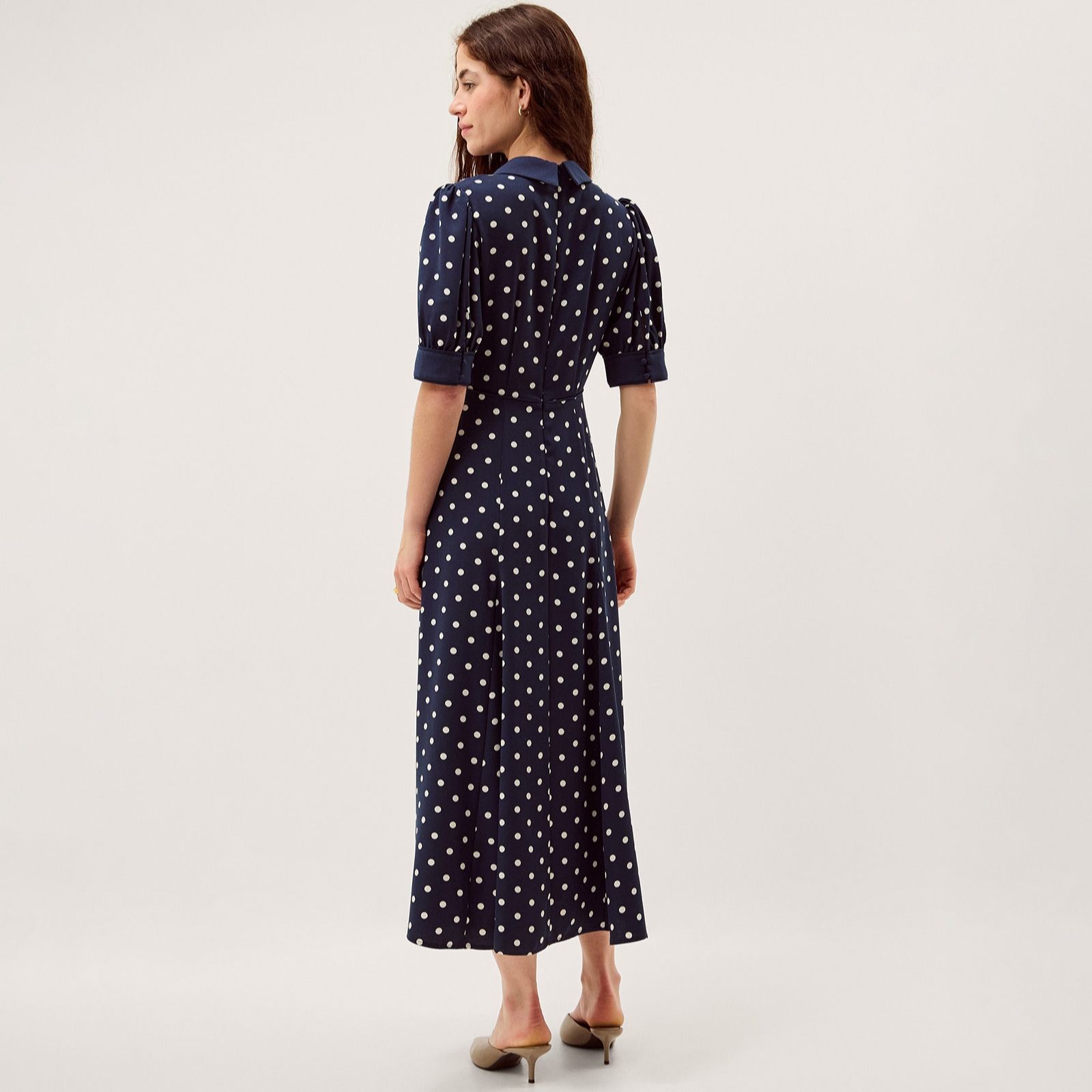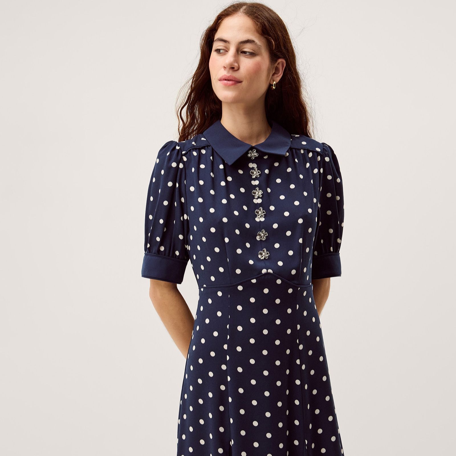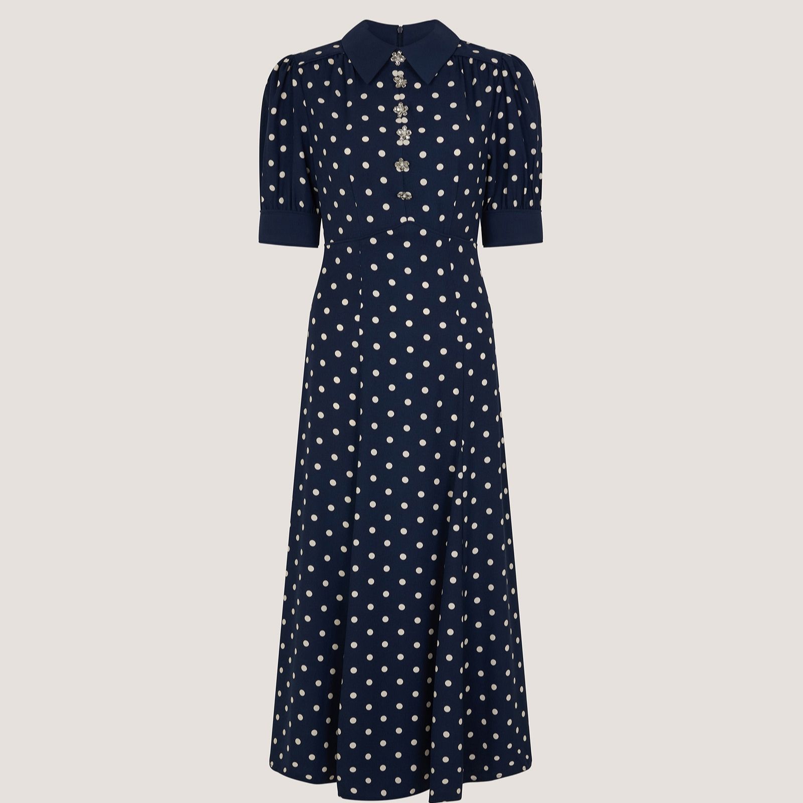 Channel a 50's style with a twist in the Kate spot dress from Monsoon, where timeless polka dots meet modern embellishment. This fitted design pairs a smart collar and elbow-length puff sleeves with a trail of silvery floral accents down the bodice, creating a look that's both playful and elegant. Perfect for garden parties, evening dinners or special occasions, it shines when teamed with kitten heels and glossy jewellery for a polished finish.