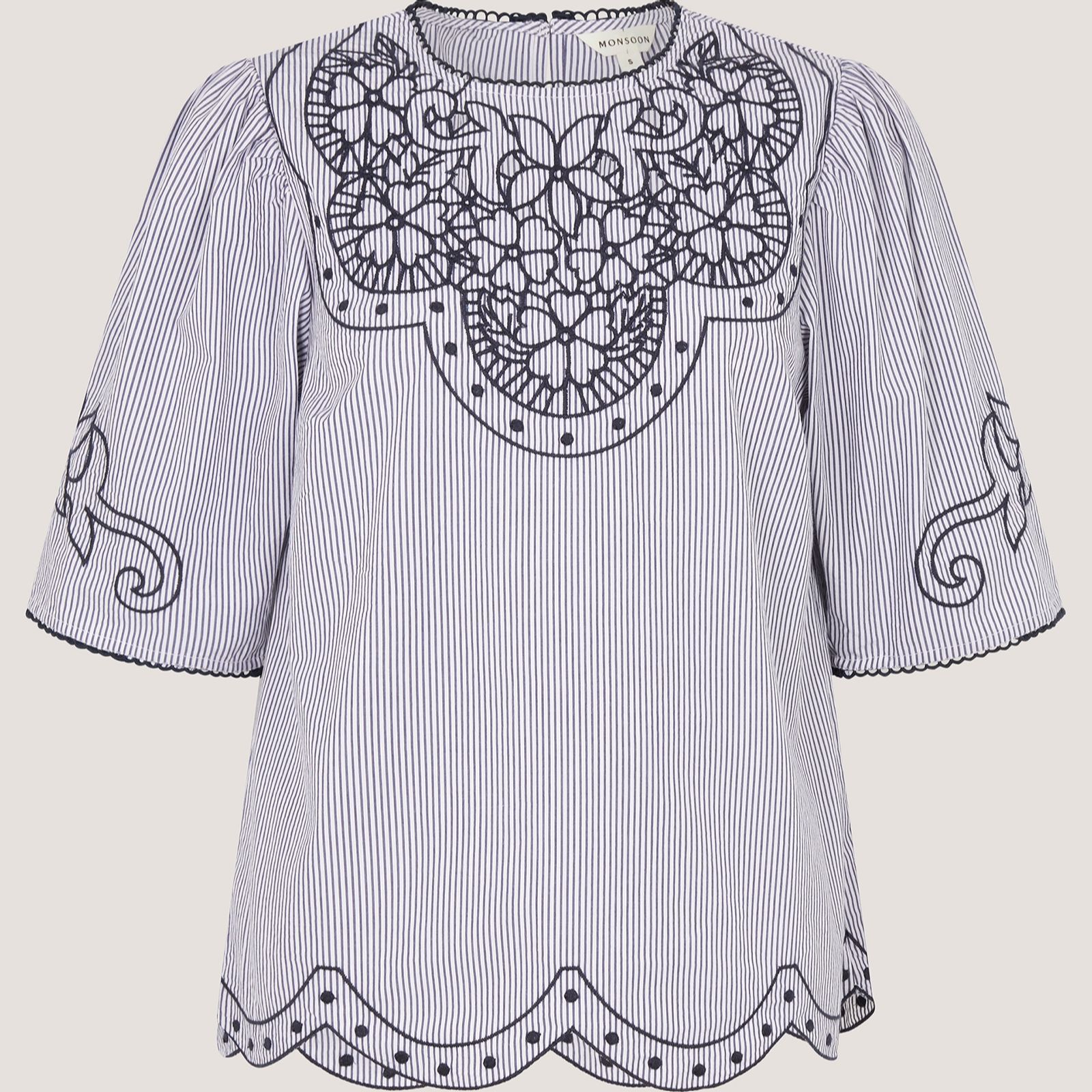 The Kirsty embroidered top from Monsoon brings a touch of artisanal charm to your everyday wardrobe. Crafted in crisp cotton with timeless stripes, its ornamental embroidery and scalloped cuffs and hem lend a beautifully refined finish. The blouse-inspired silhouette and fabric belt make it perfect for relaxed weekends or polished days out. Pair it with denim for effortless style.