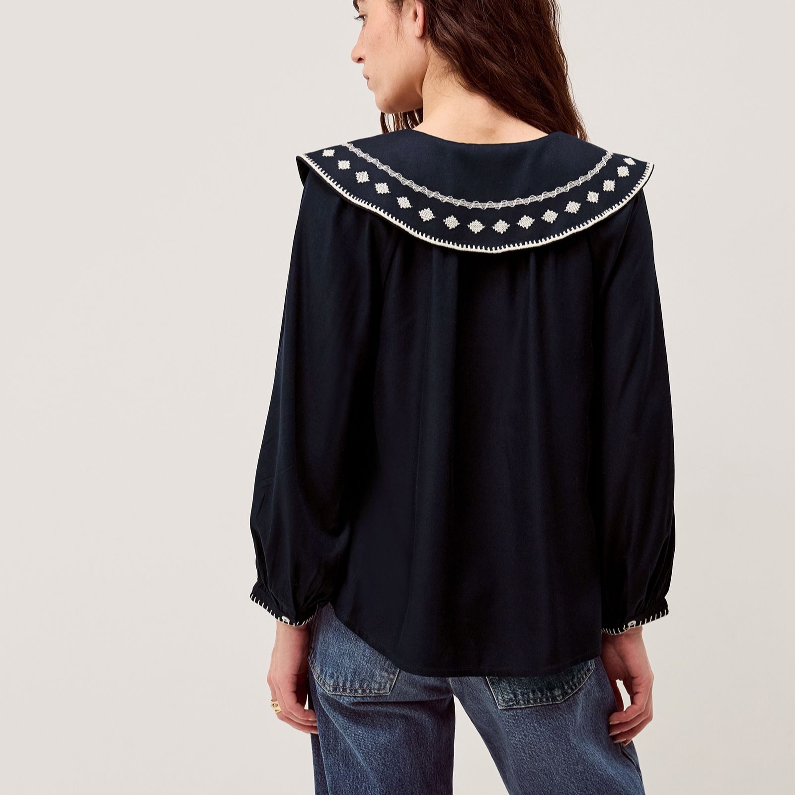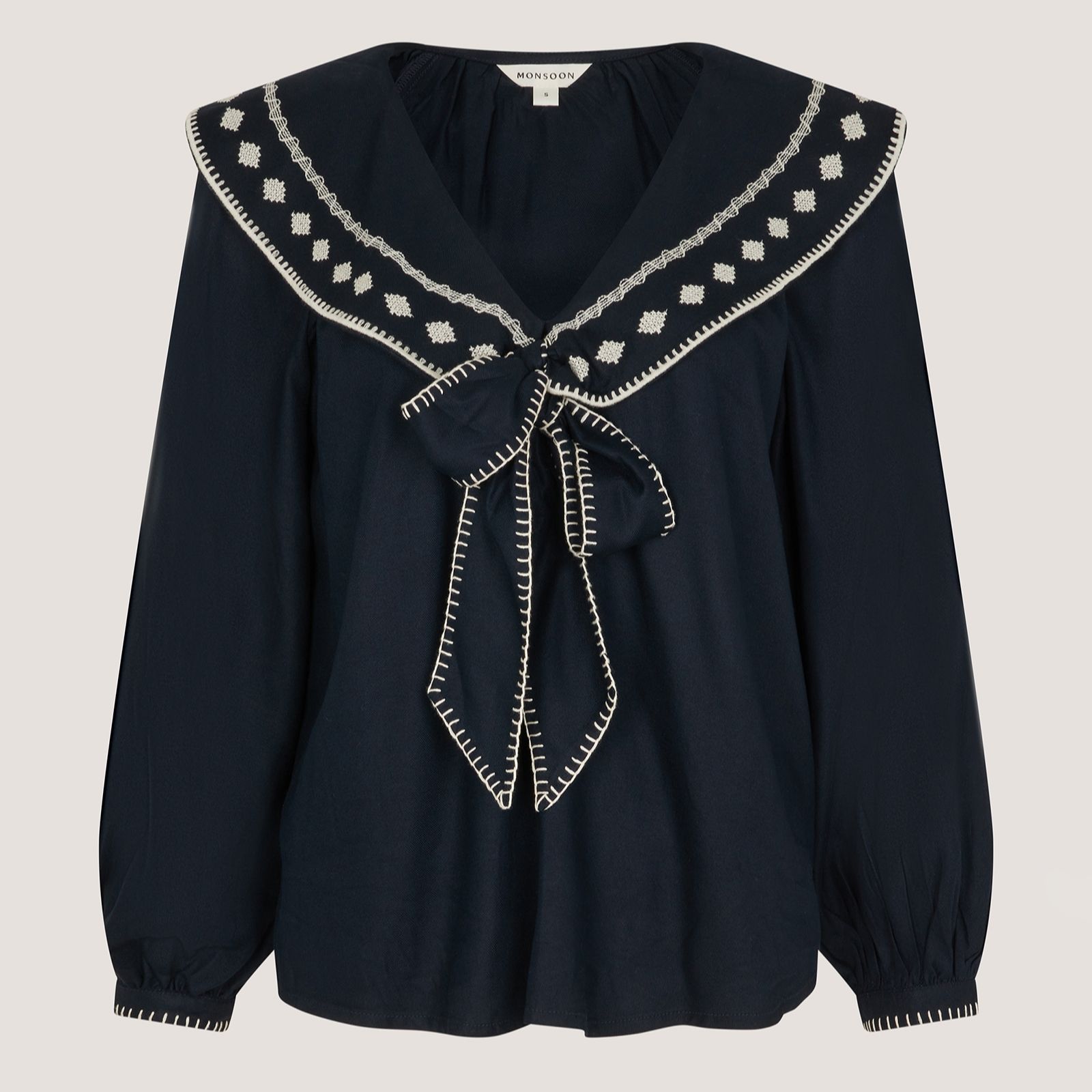 Make a statement with the Lola collared top from Monsoon, where classic navy meets playful elegance. This fitted piece is defined by its oversized, embroidered sailor collar that finishes in a charming bow at the chest, blending chic detail with versatile style. Perfect for both office days and brunch dates, its easy sophistication transitions seamlessly from work to weekend. For effortless flair, team it with your favourite denim and loafers.